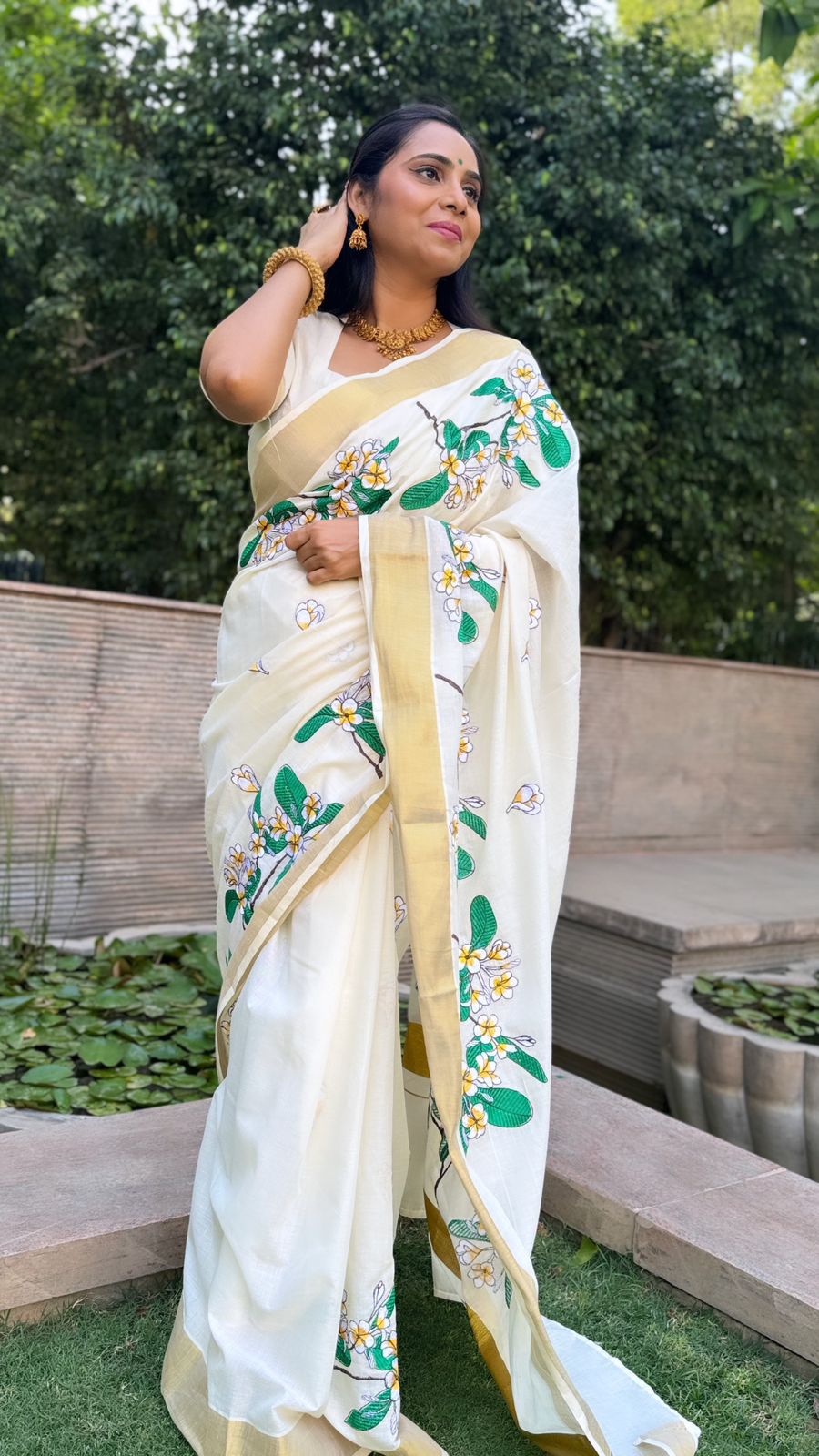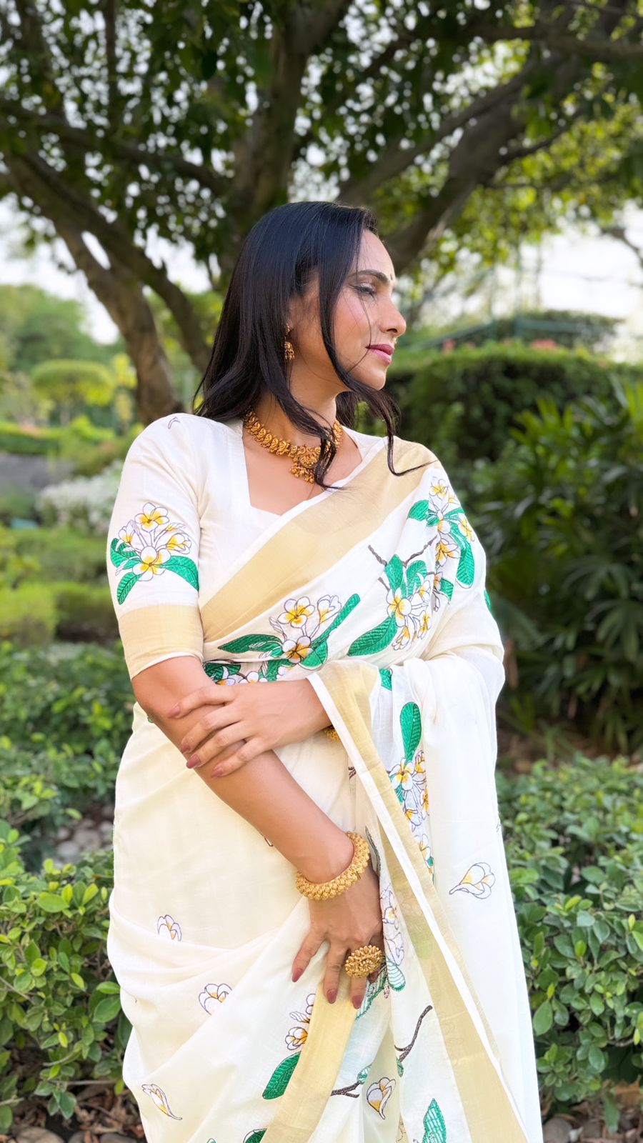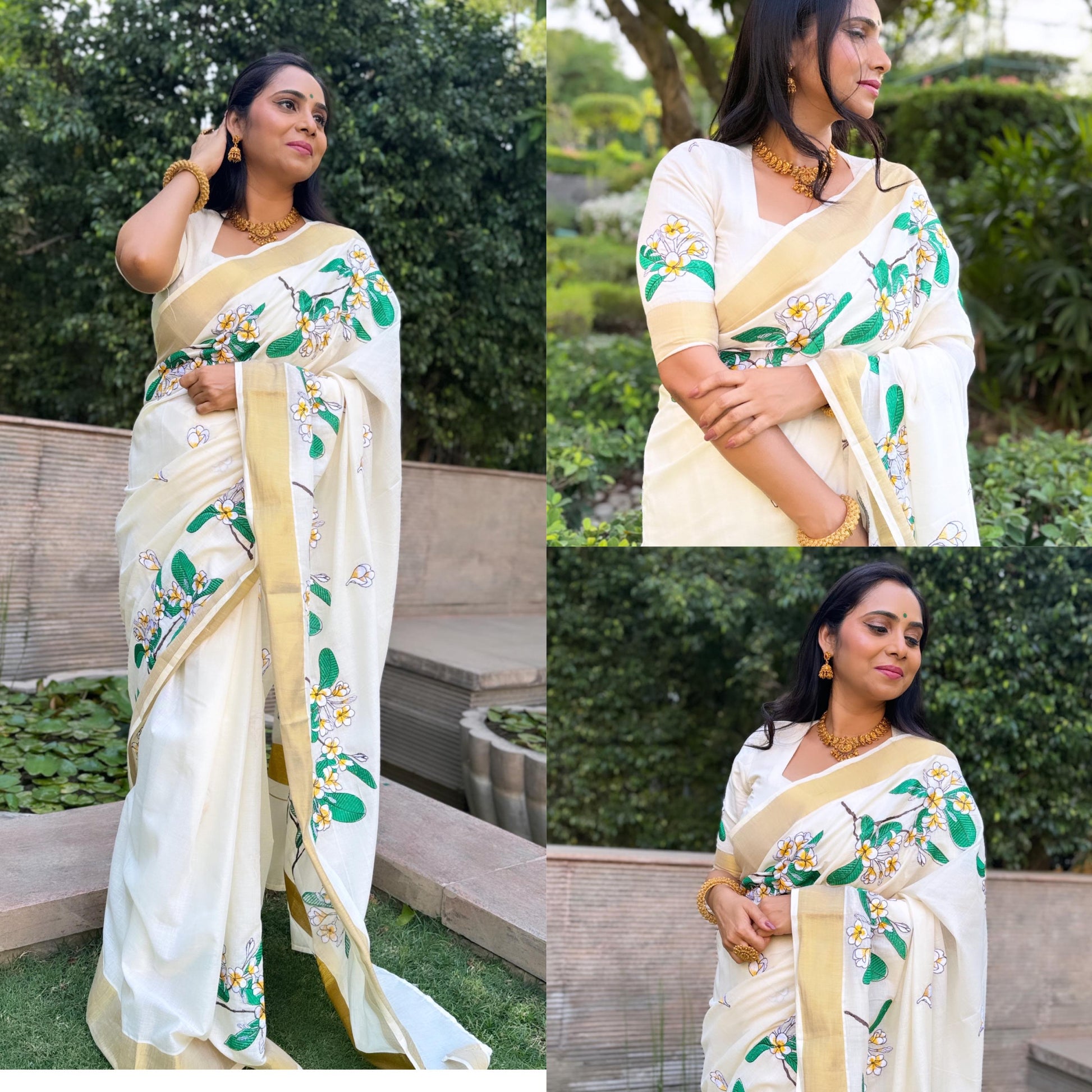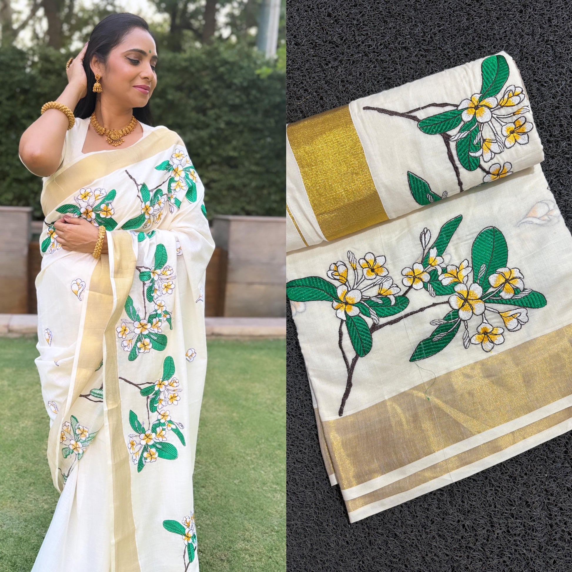 Off-white Kerala Saree with Floral Embroidery Designs on Body. Simple saree for everyday wear, may it be to the office or to the temple.