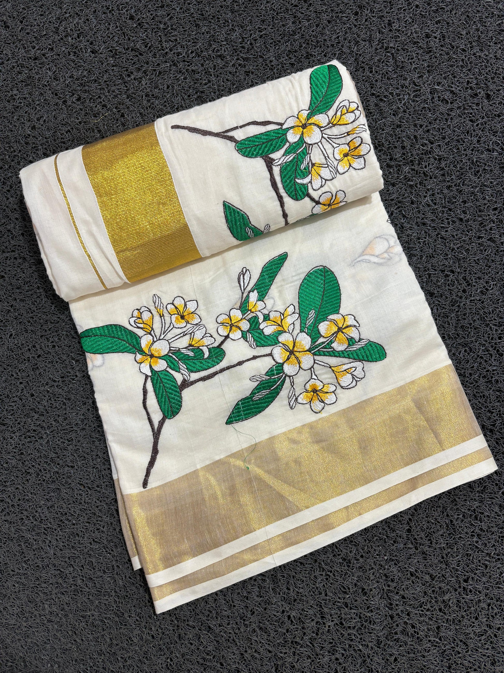 Kerala Cotton Kasavu Saree with White Green and Yellow Floral Embroidery Work