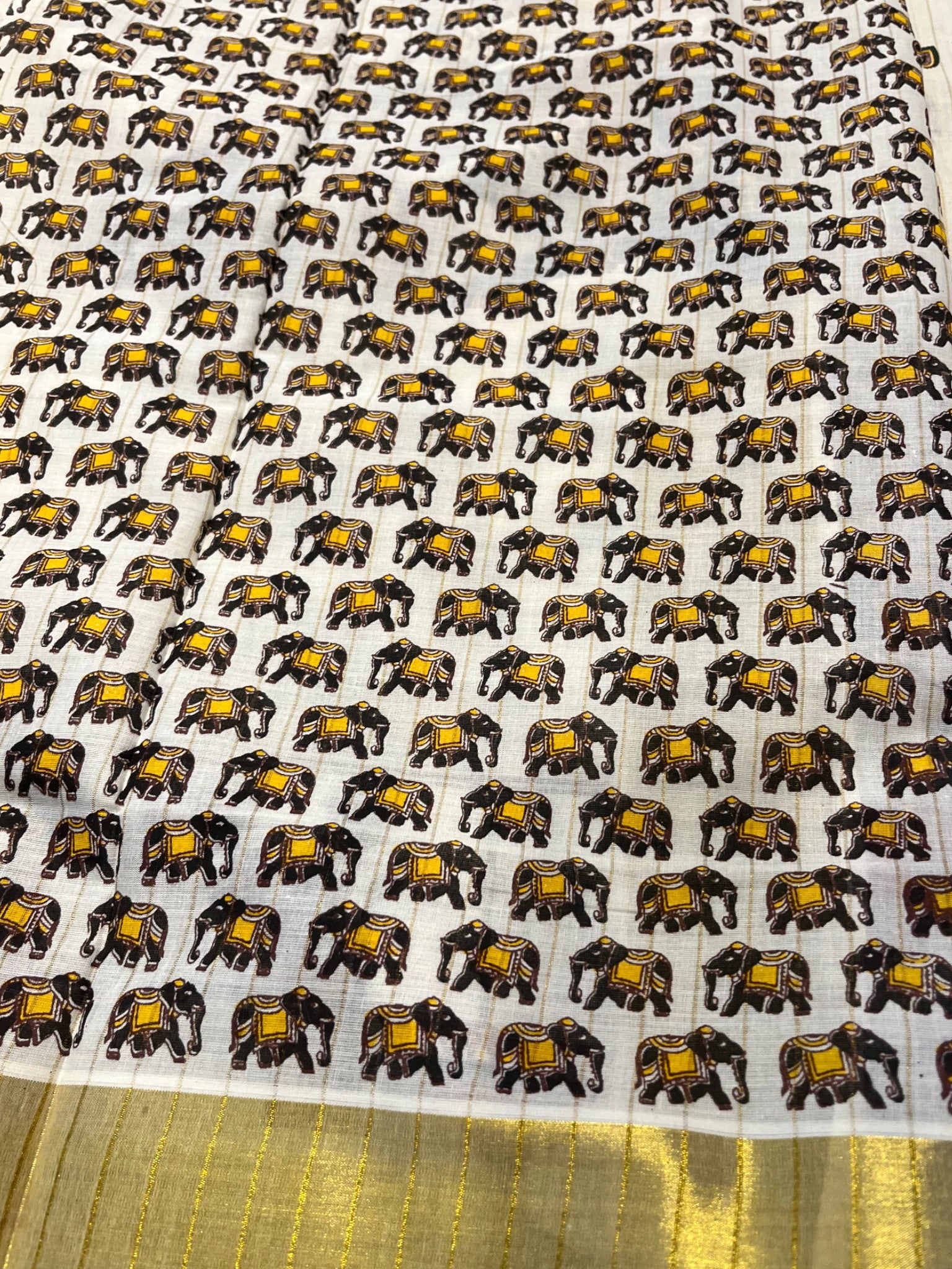 Kerala Cotton Kasavu Saree With Mural Festival Parasol Stripes and Elephant Design