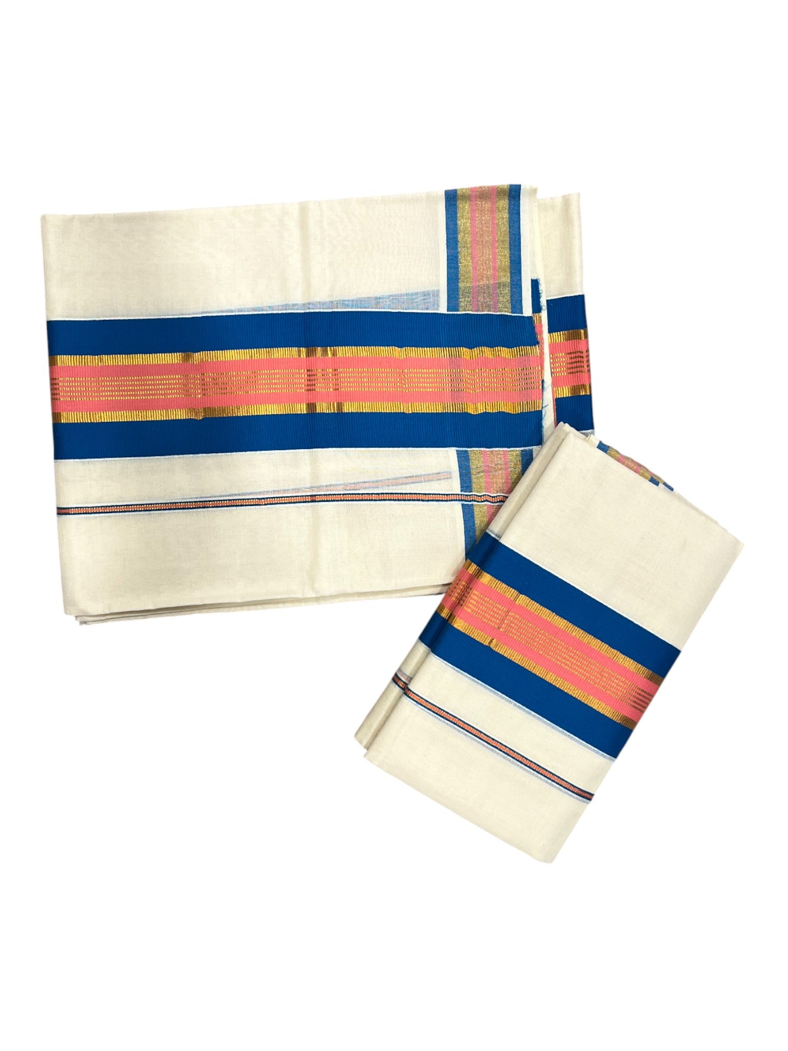 Kerala Cotton Kasavu Set Mundu (Mundum Neriyathum) with Blue and Pink Border
