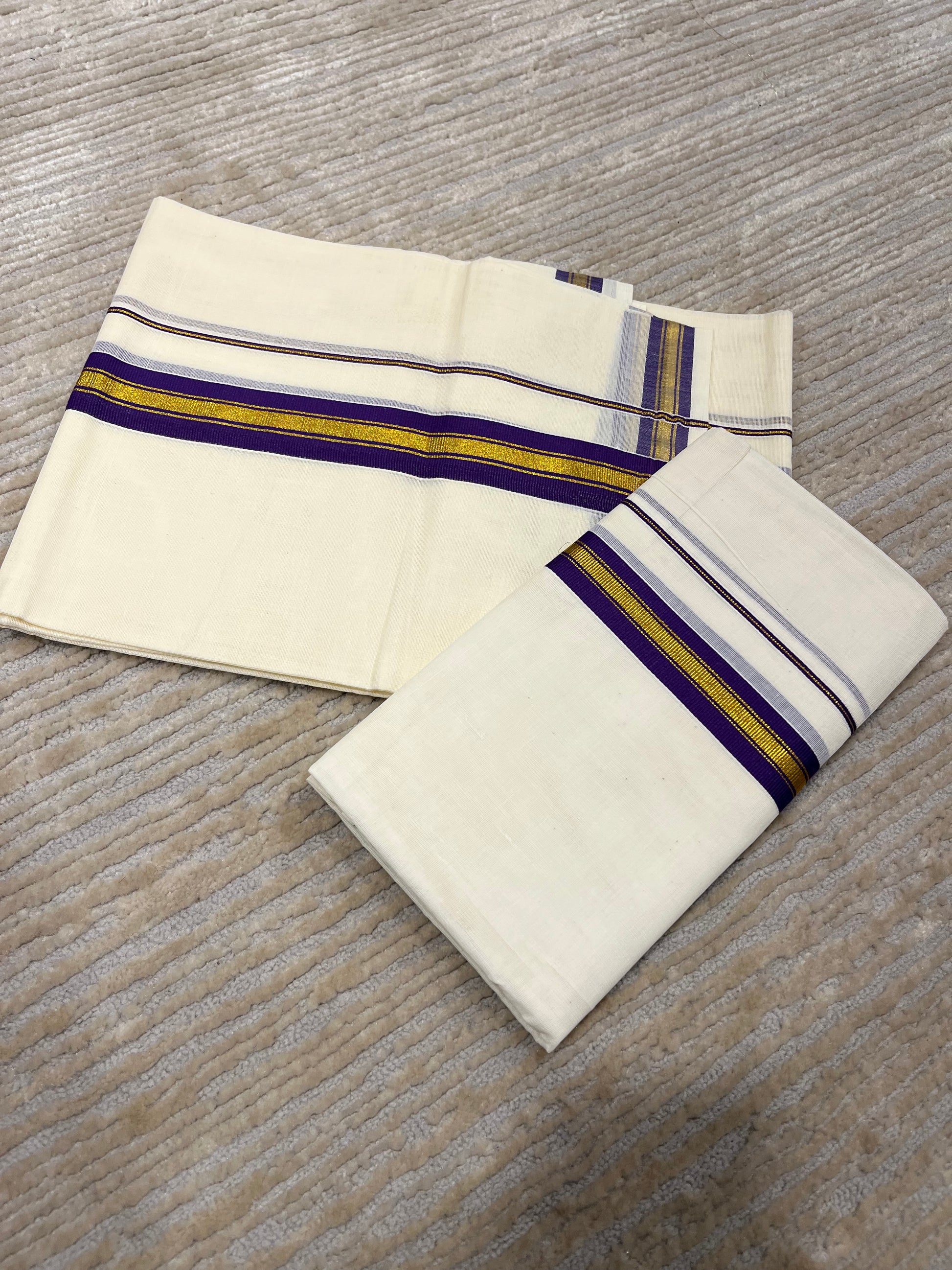 Kerala Cotton Kasavu Set Mundu (Mundum Neriyathum) with Gold and Violet Border