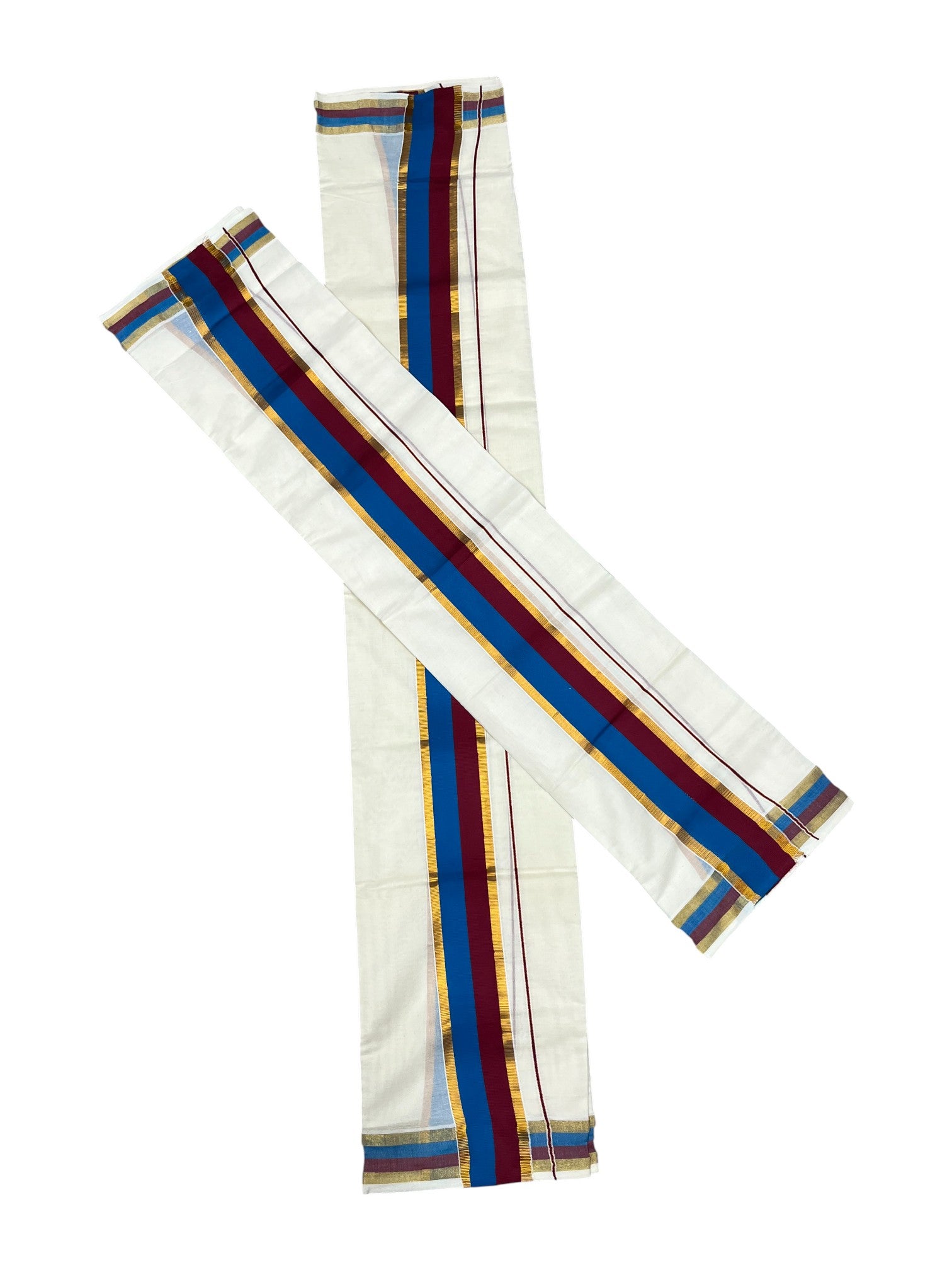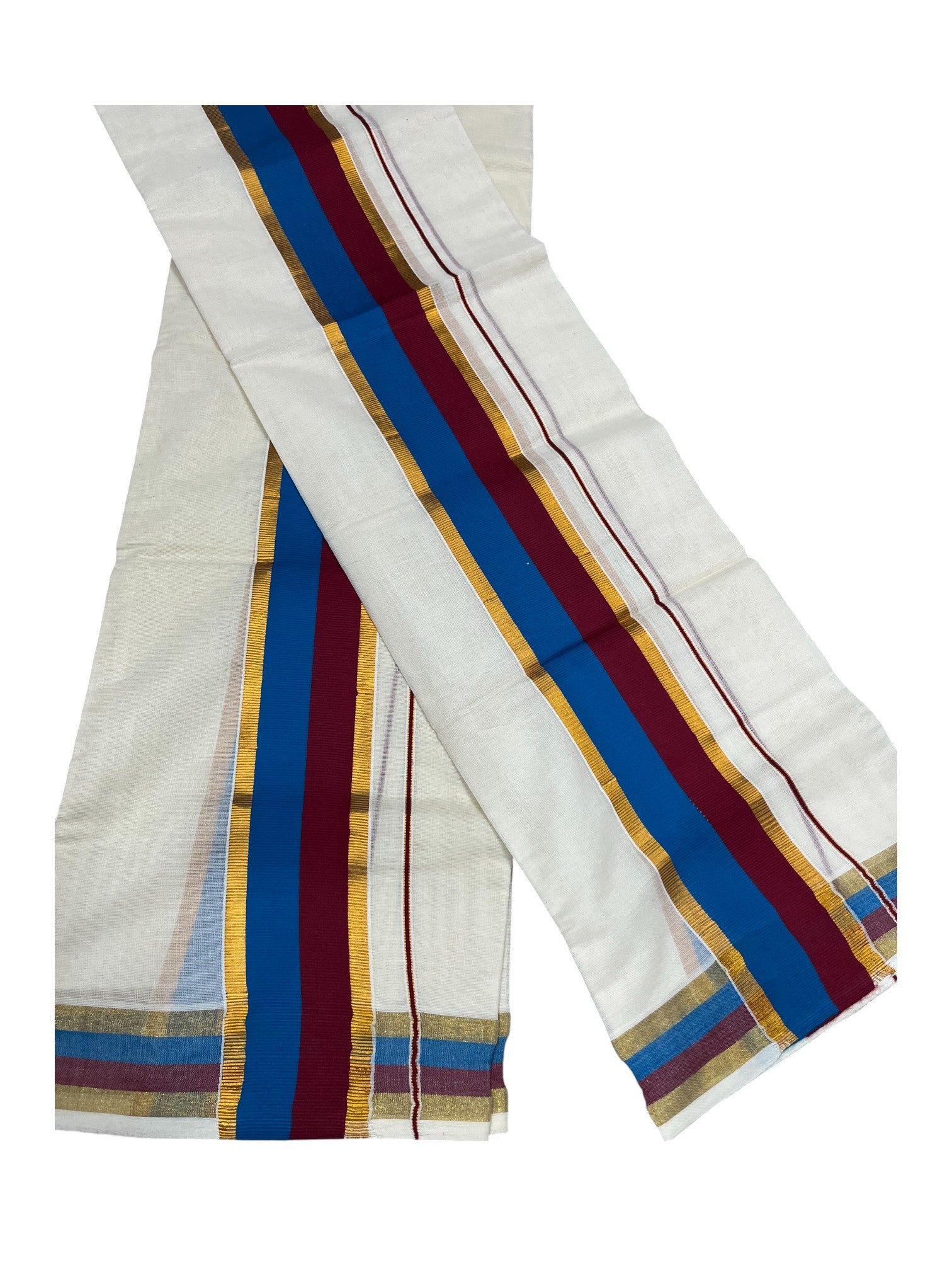 Kerala Cotton Kasavu Single Set Mundu (Mundum Neriyathum) with Maroon And Blue Kasavu Border