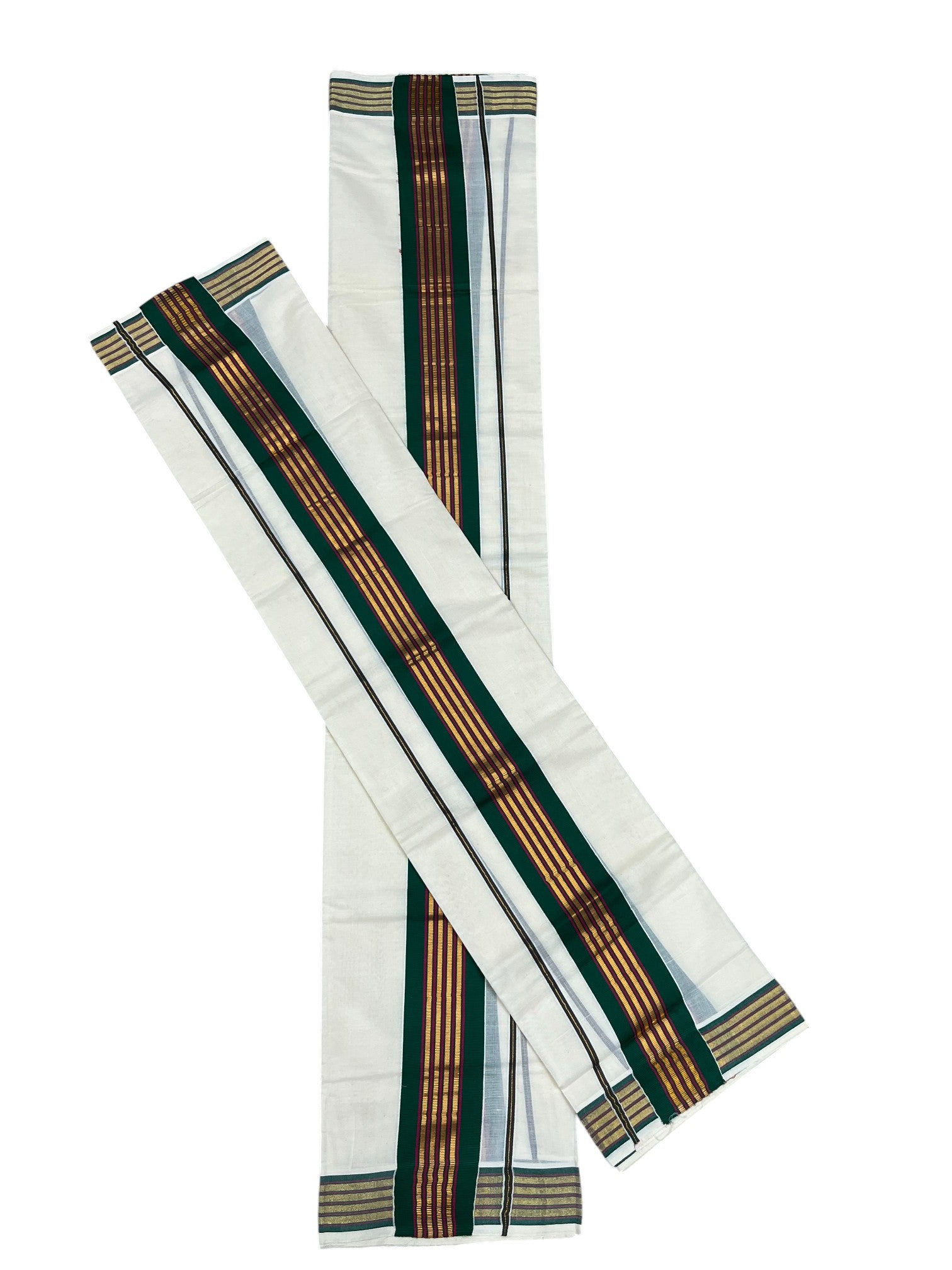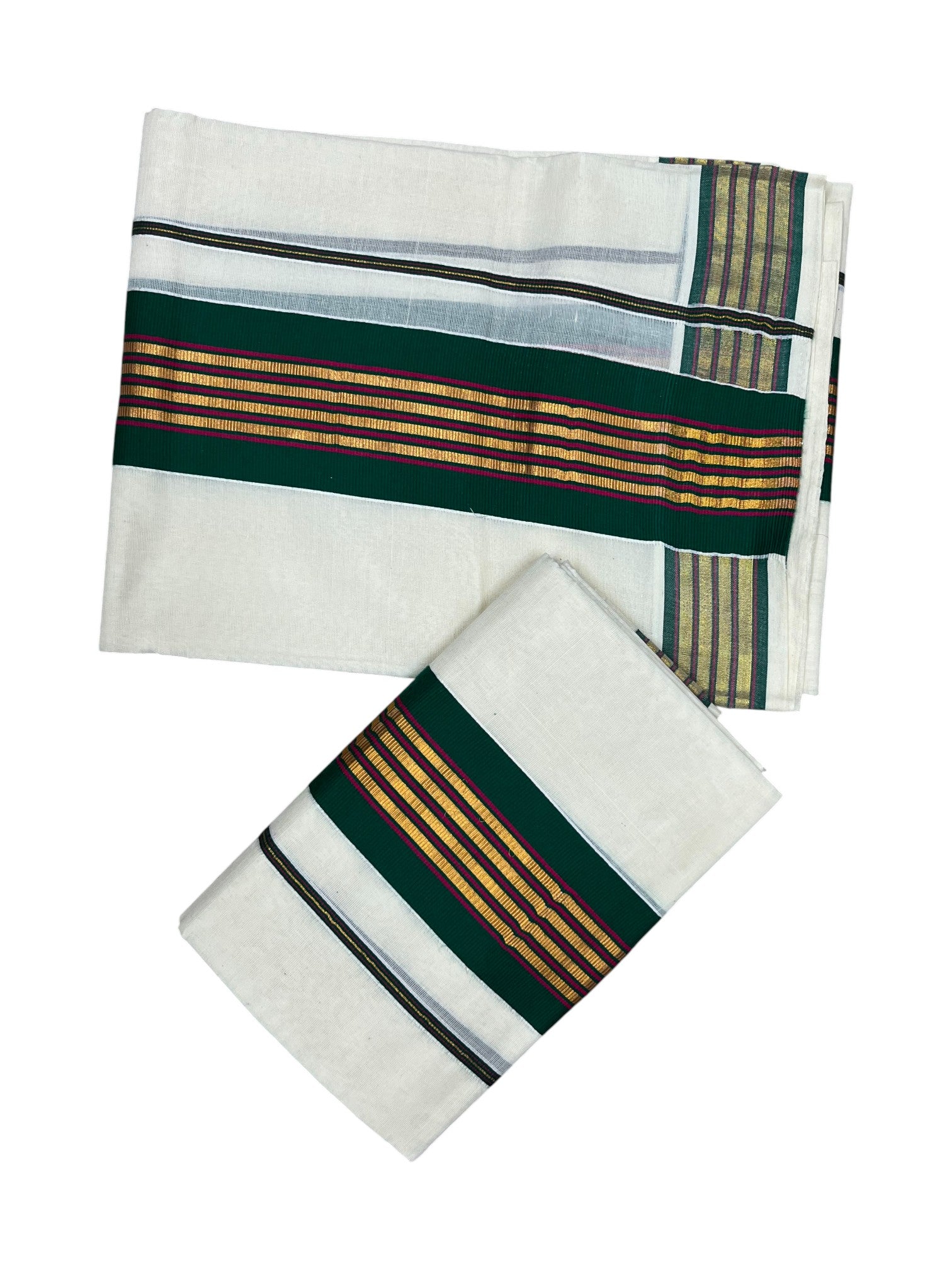 Kerala Cotton Kasavu Single Set Mundu (Mundum Neriyathum) with Pink and Gold Lines Green Border