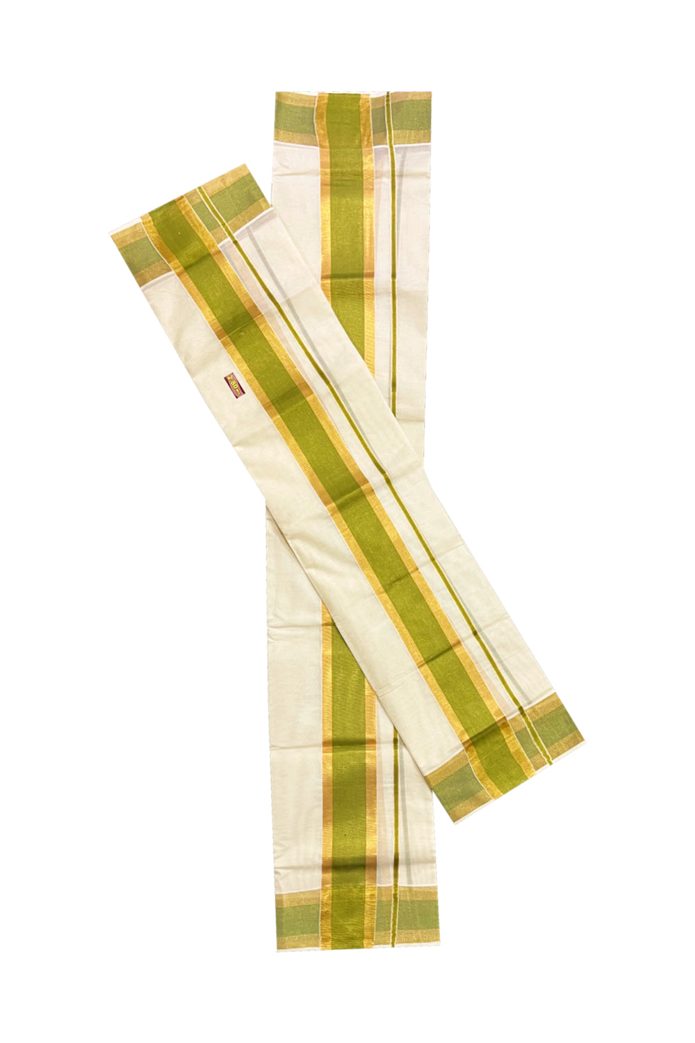 Kerala Cotton Mundum Neriyathum Single (Set Mundu) with Light Green and Kasavu Border 2.80 Mtrs