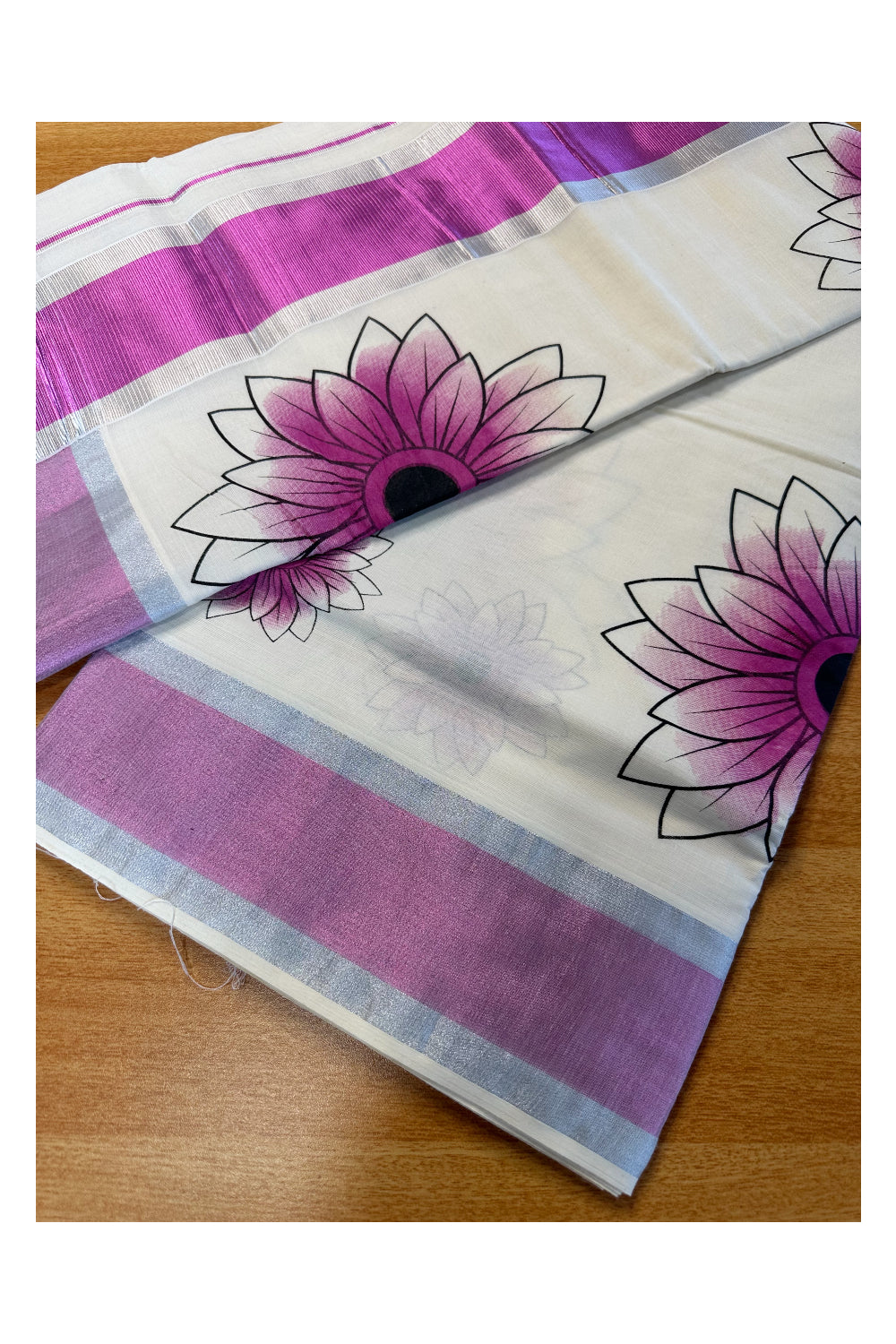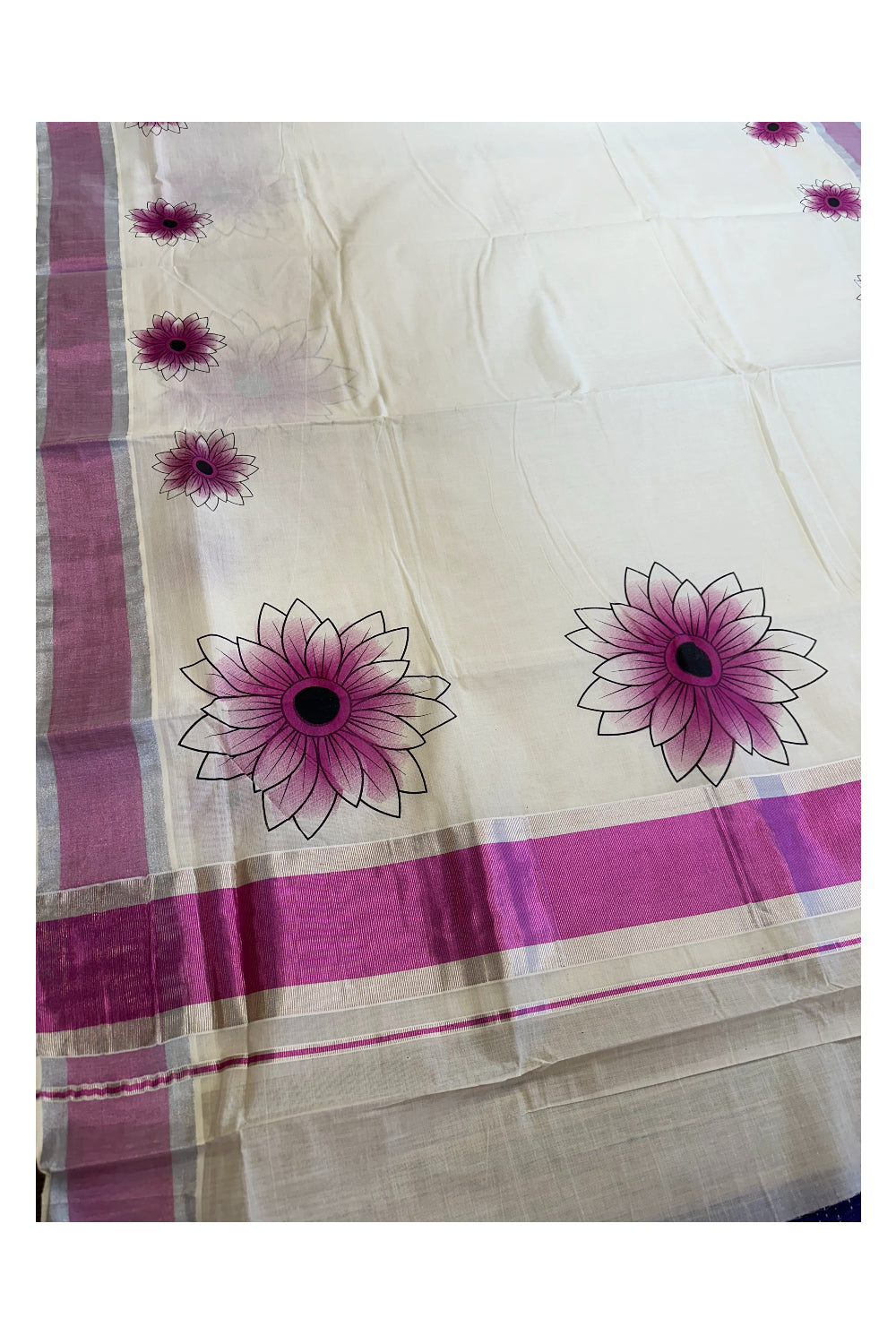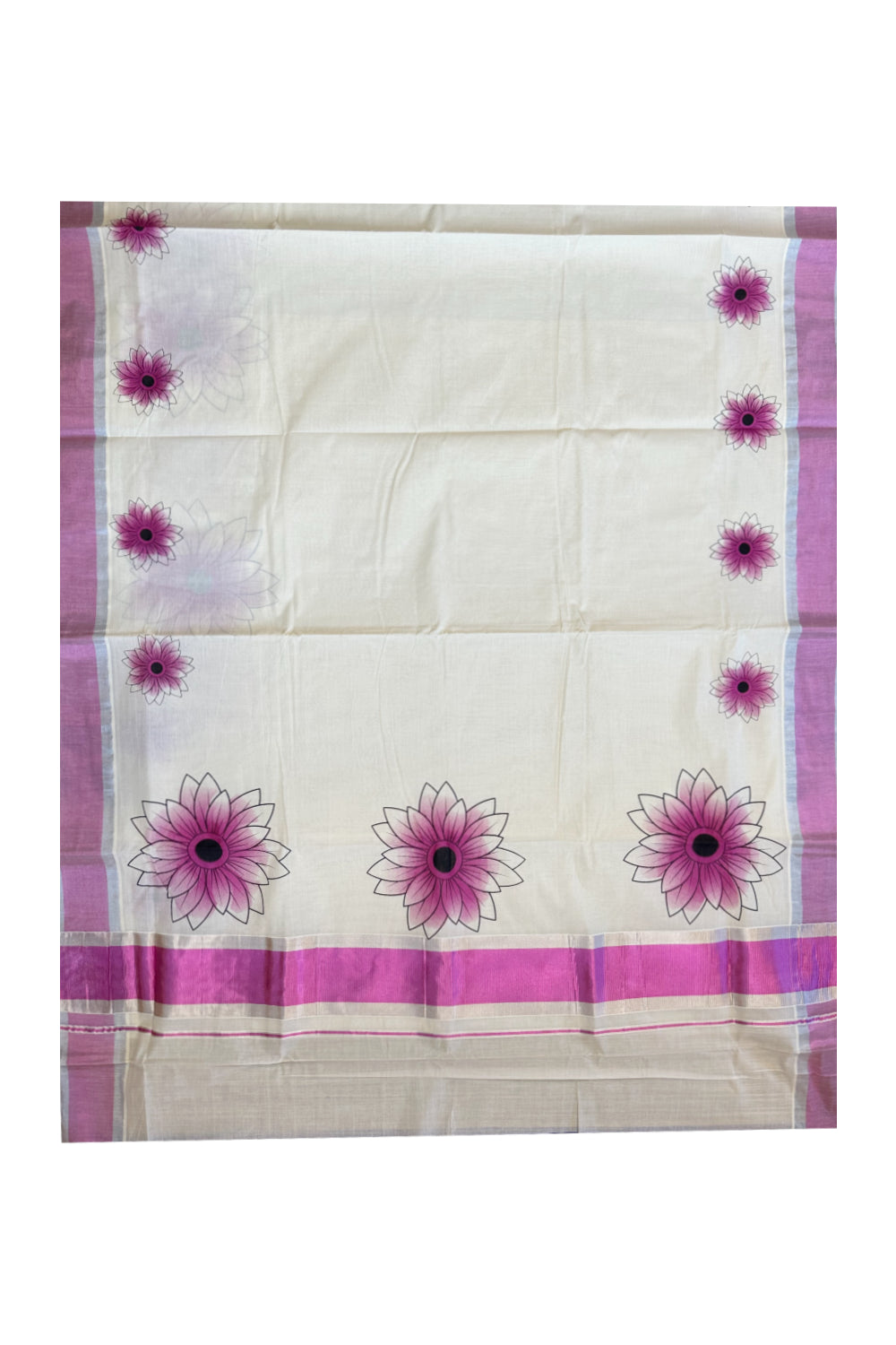 Kerala Cotton Saree with Floral Block Prints in Pink and Silver Border