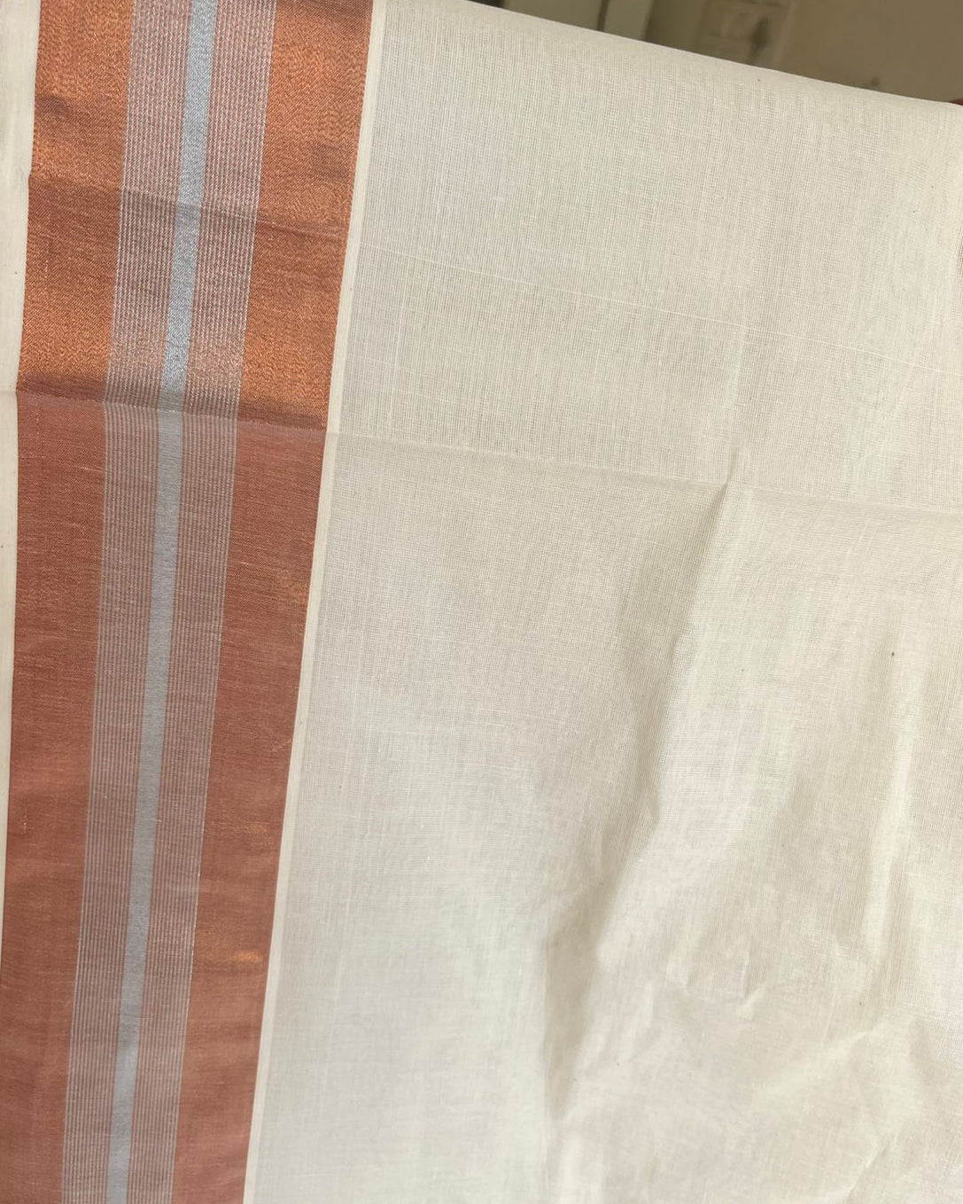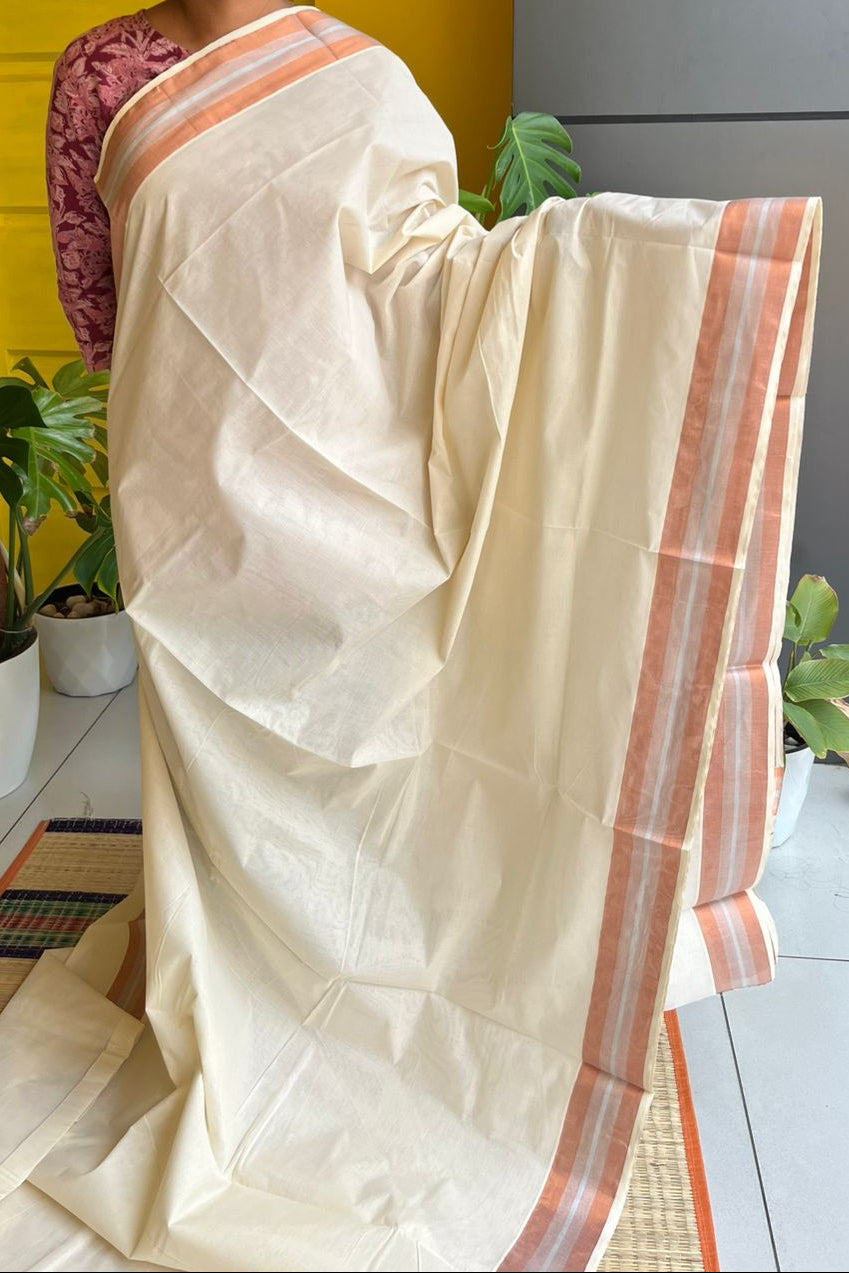 Kerala Cotton Saree with Orange and Silver Border SL216