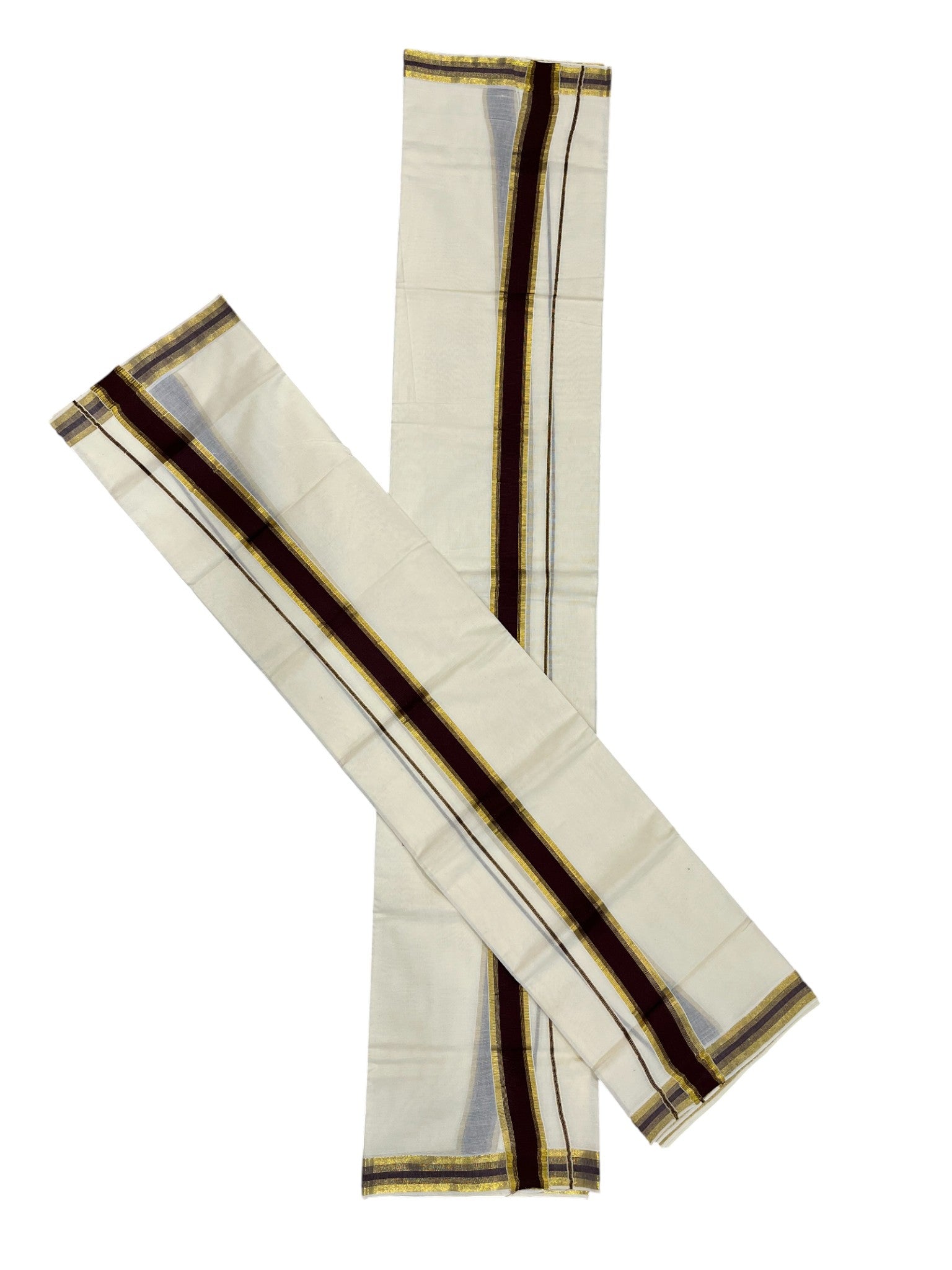 Kerala Cotton Set Mundu (Mundum Neriyathum) with Kasavu and Brown Border