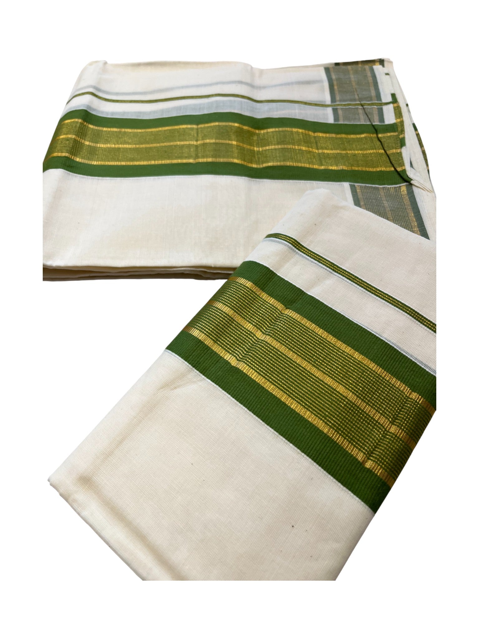 Kerala Cotton Set Mundu (Mundum Neriyathum) with Kasavu and Green Border