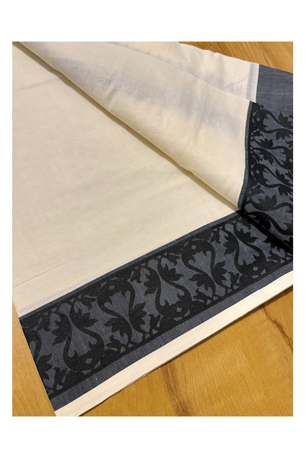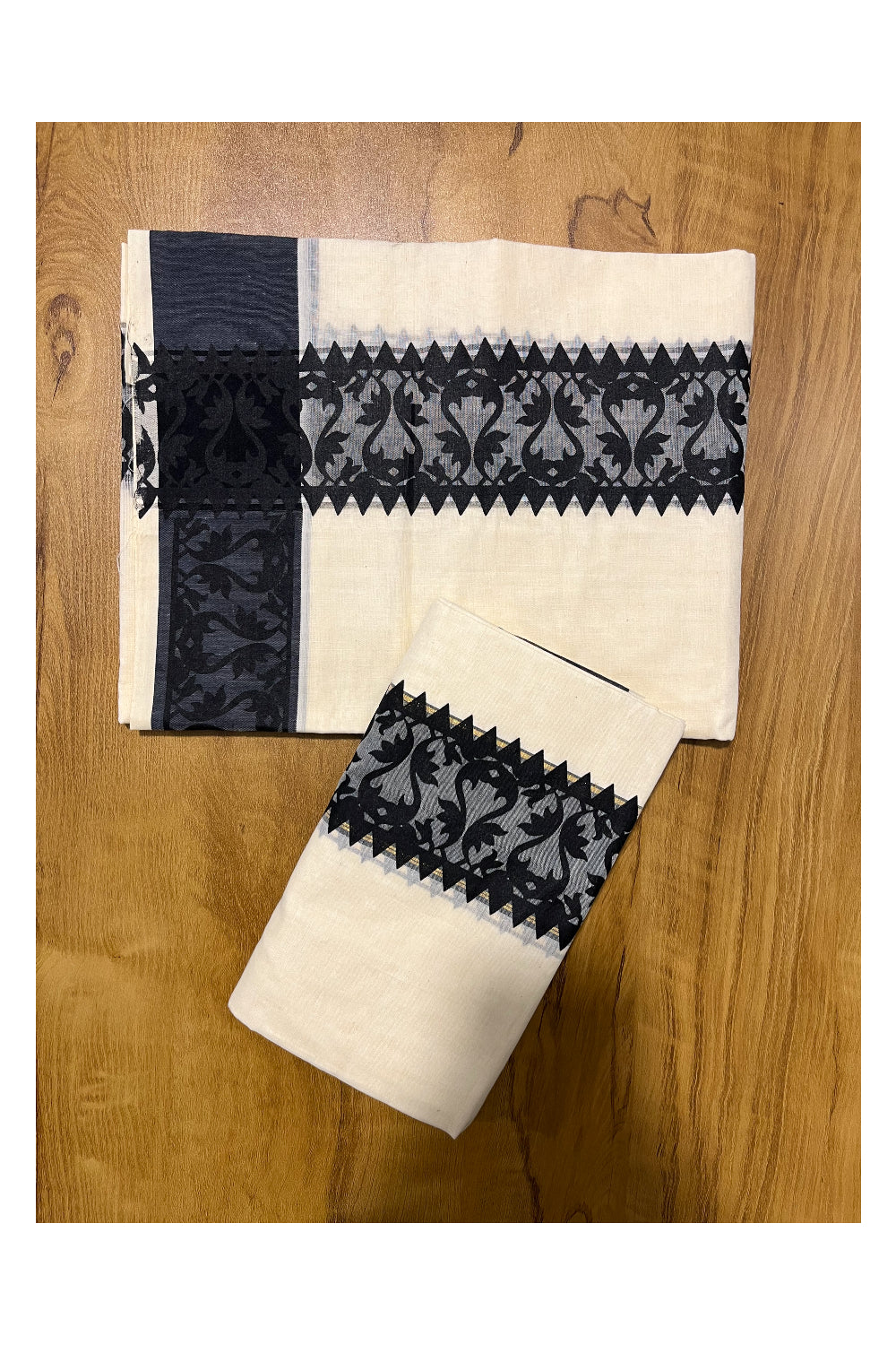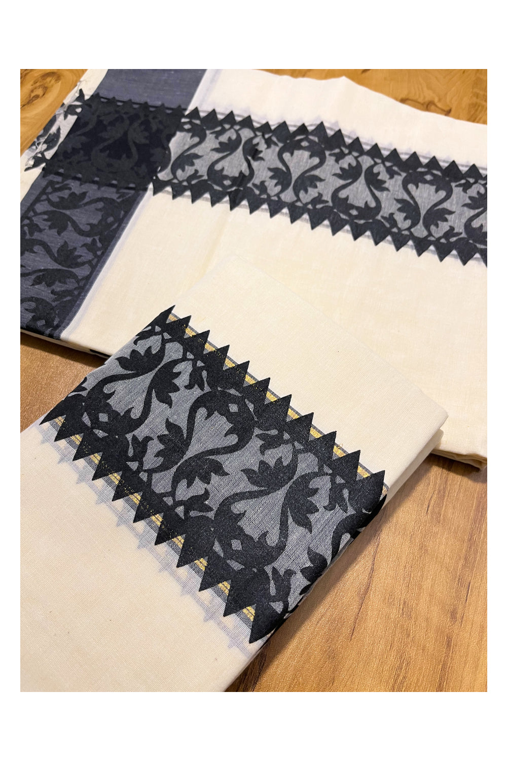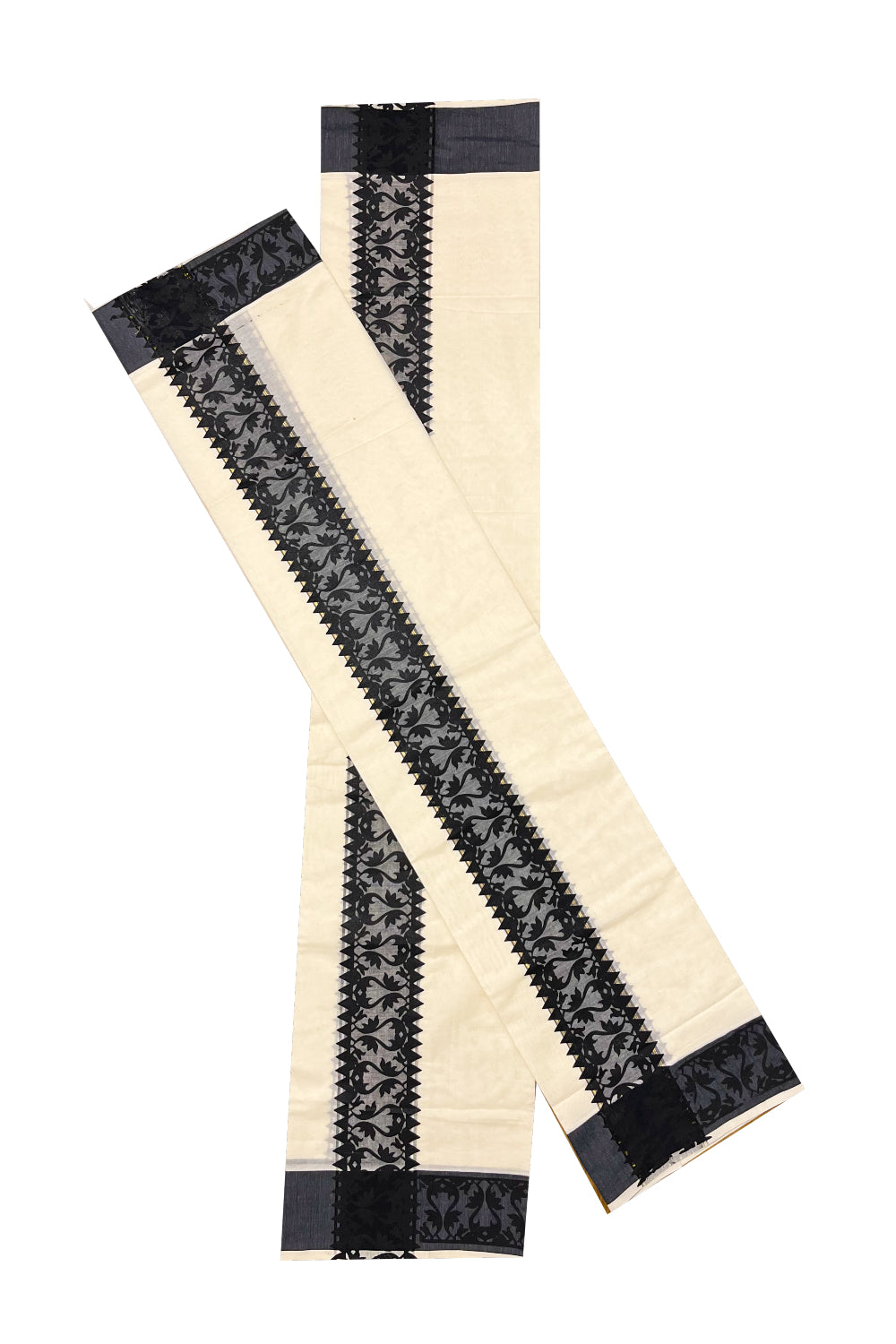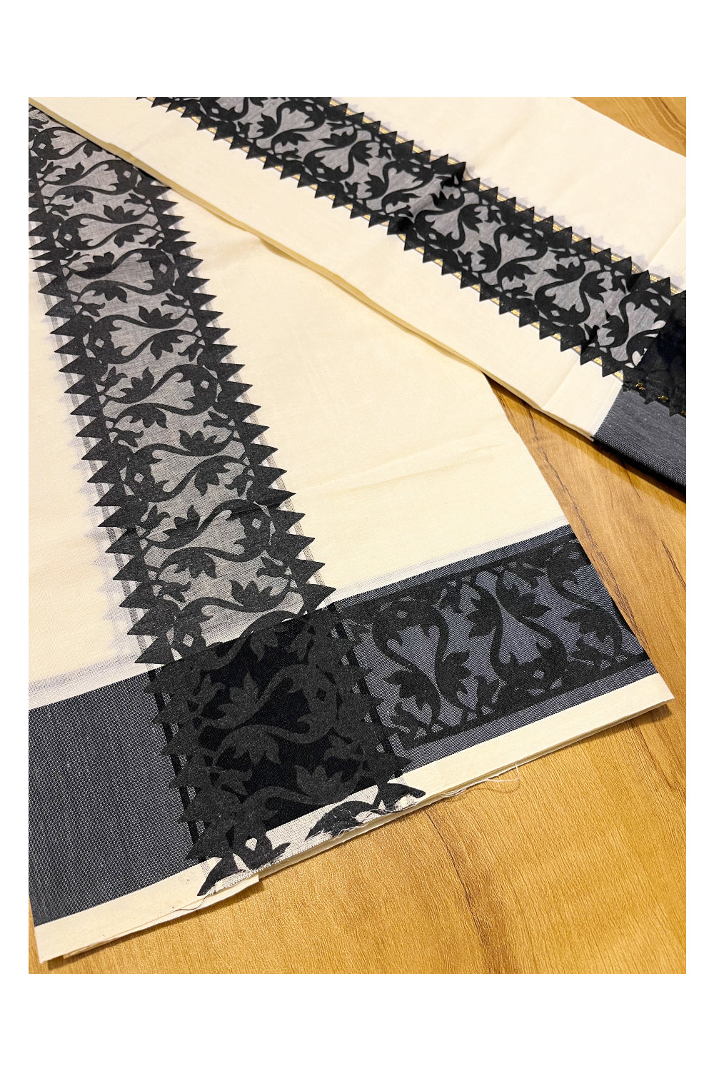 Kerala Cotton Single Set Mundu (Mundum Neriyathum) with Black Temple Block printed Border