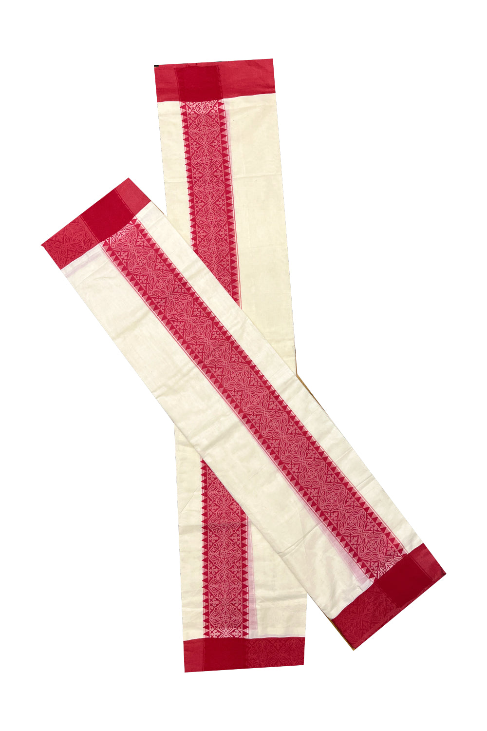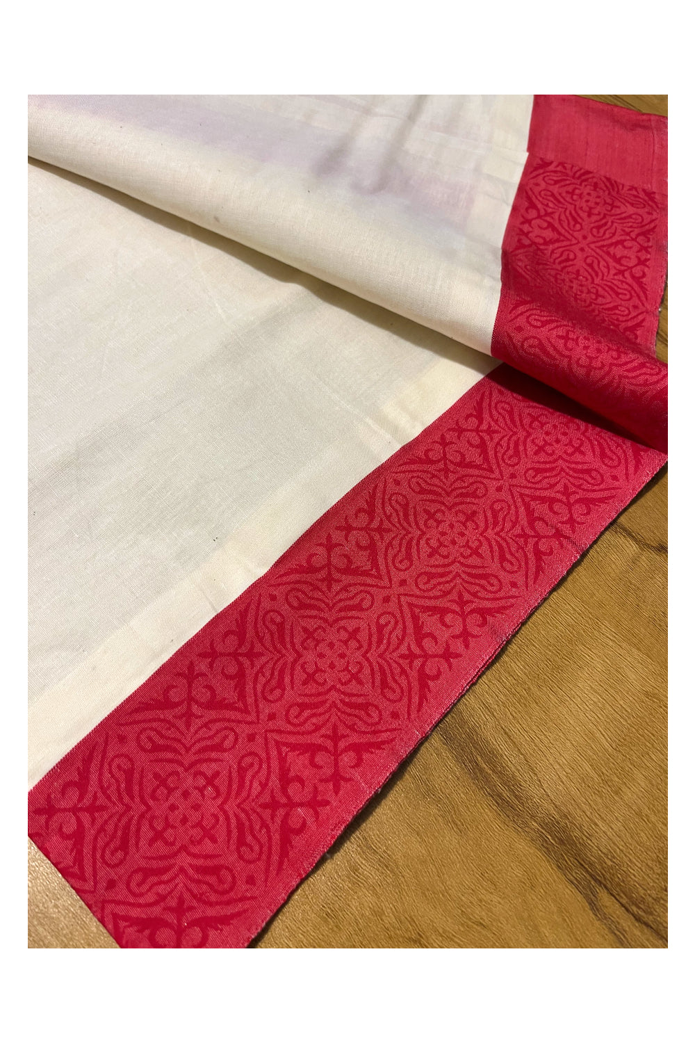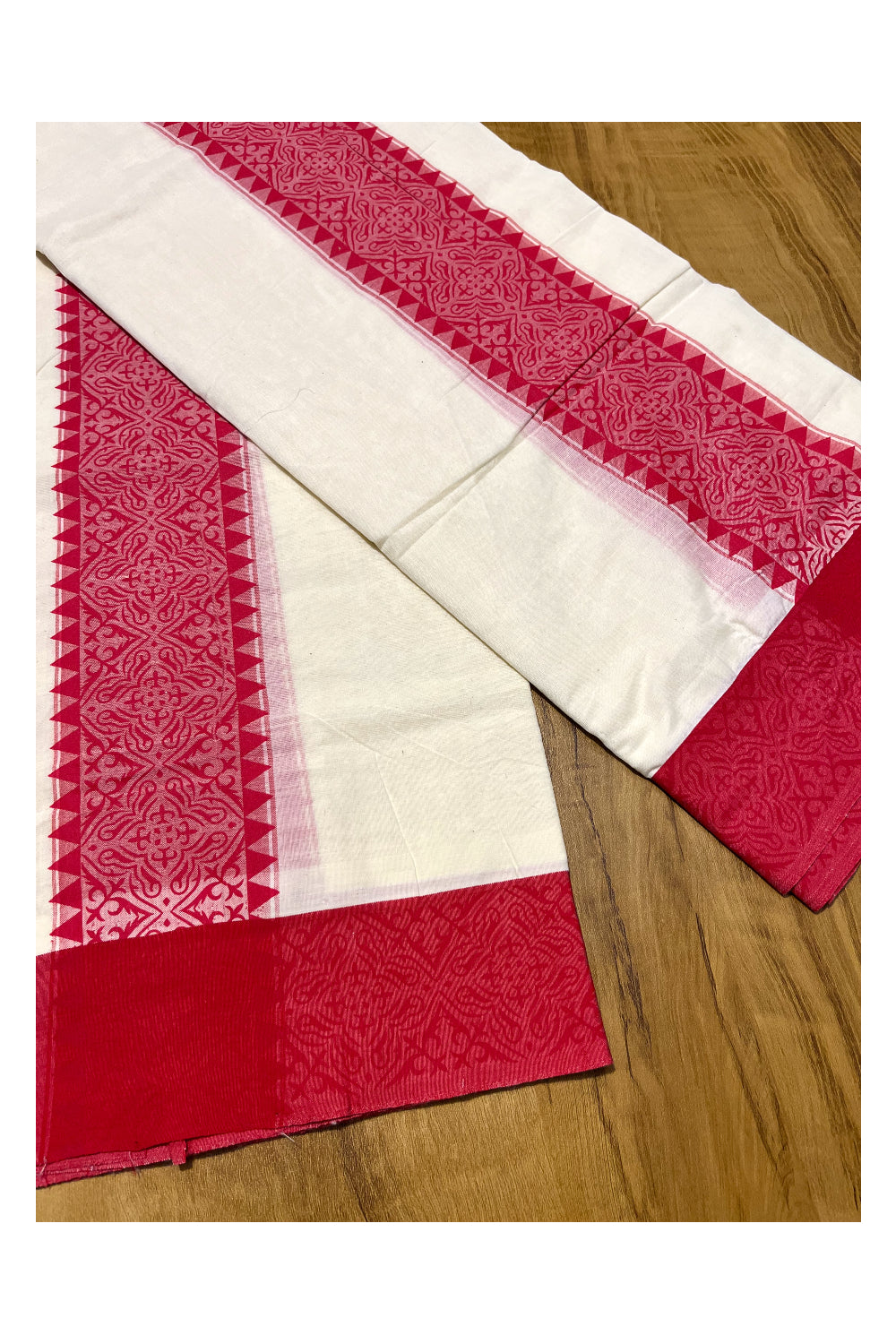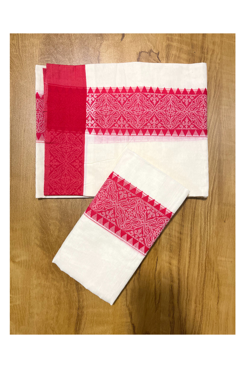 Kerala Cotton Single Set Mundu (Mundum Neriyathum) with Pink Temple Block printed Border 2.80 mtr
