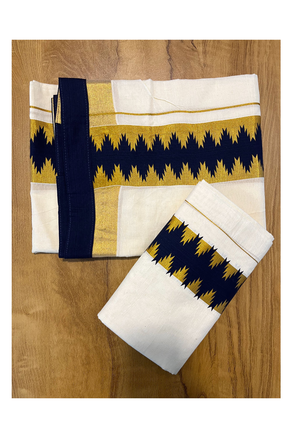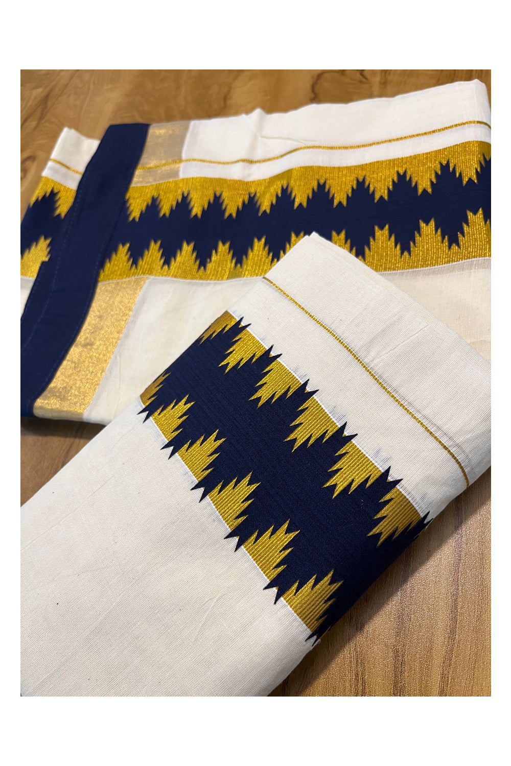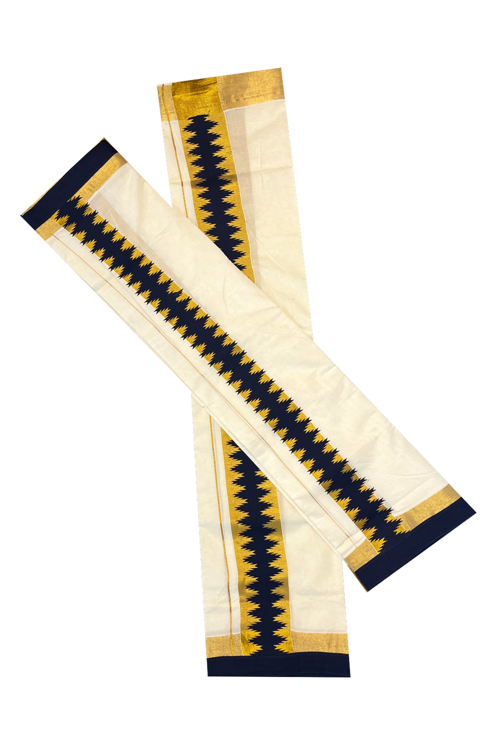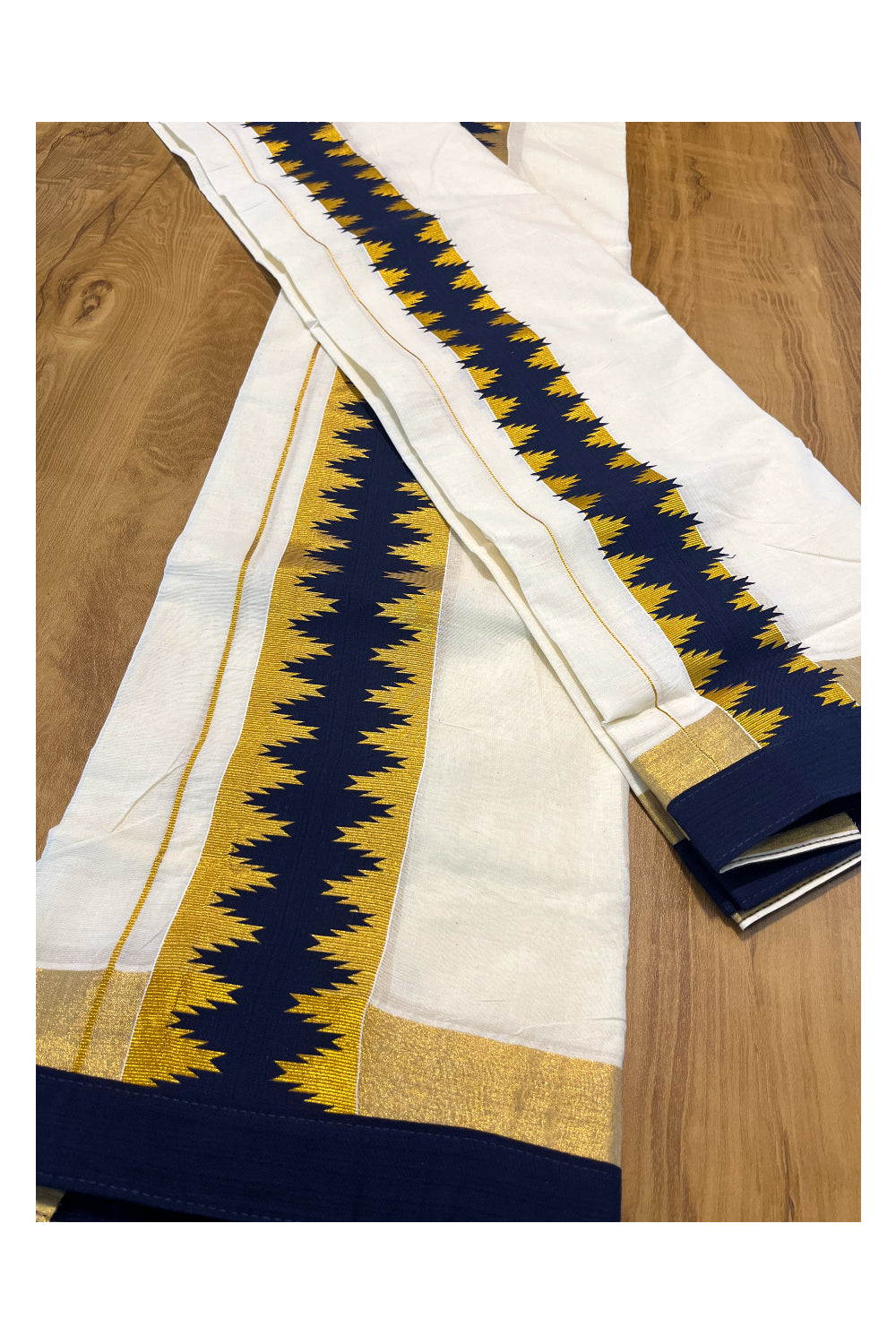 Kerala Cotton Single Set Mundu (Mundum Neriyathum) with Kasav Blue Temple Applique Work Border 2.80Mtrs