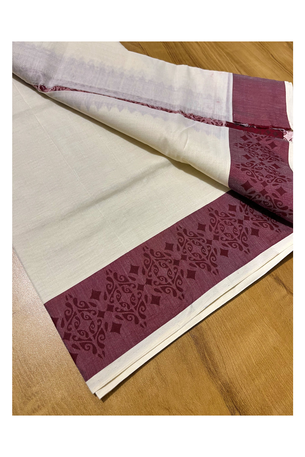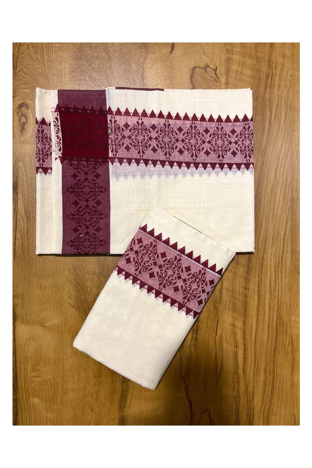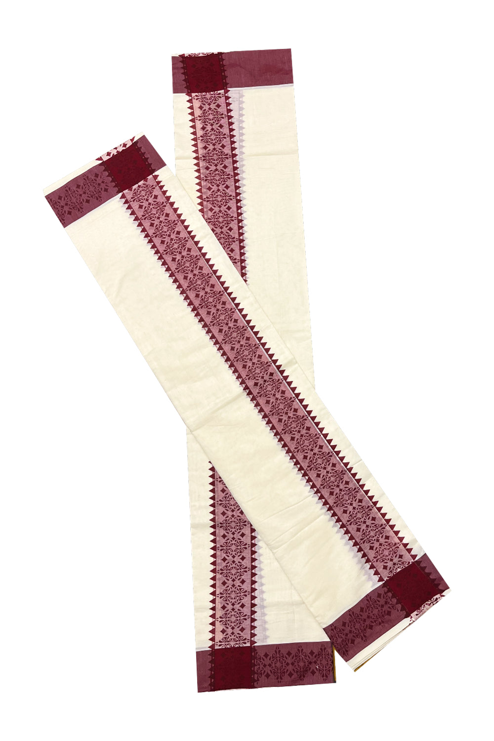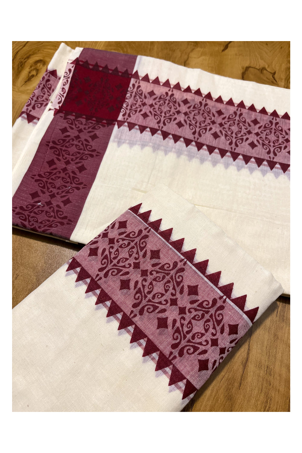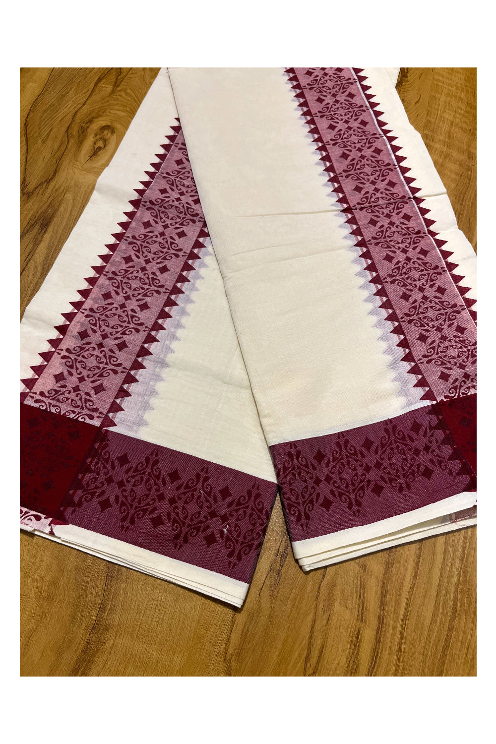Kerala Cotton Single Set Mundu (Mundum Neriyathum) with Maroon Temple Block printed Border 2.80 mtr