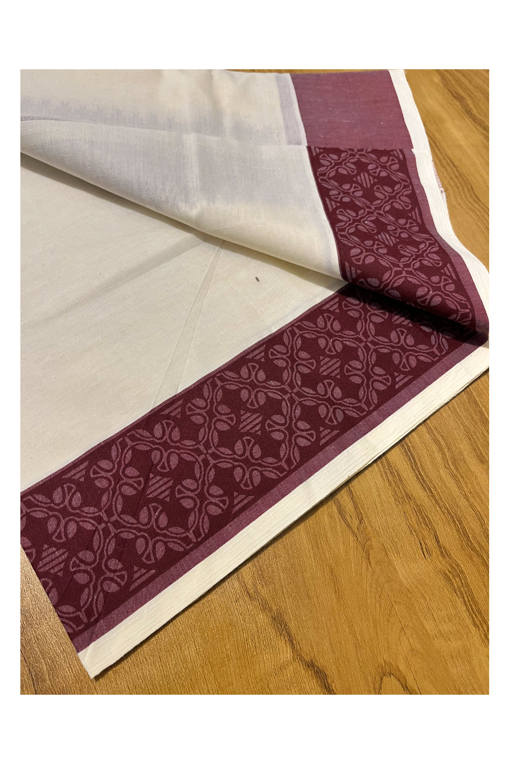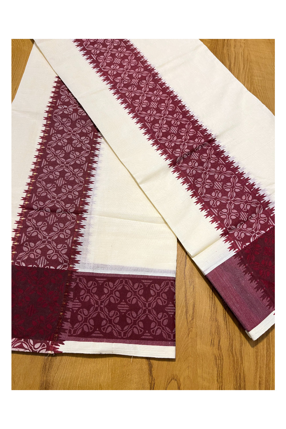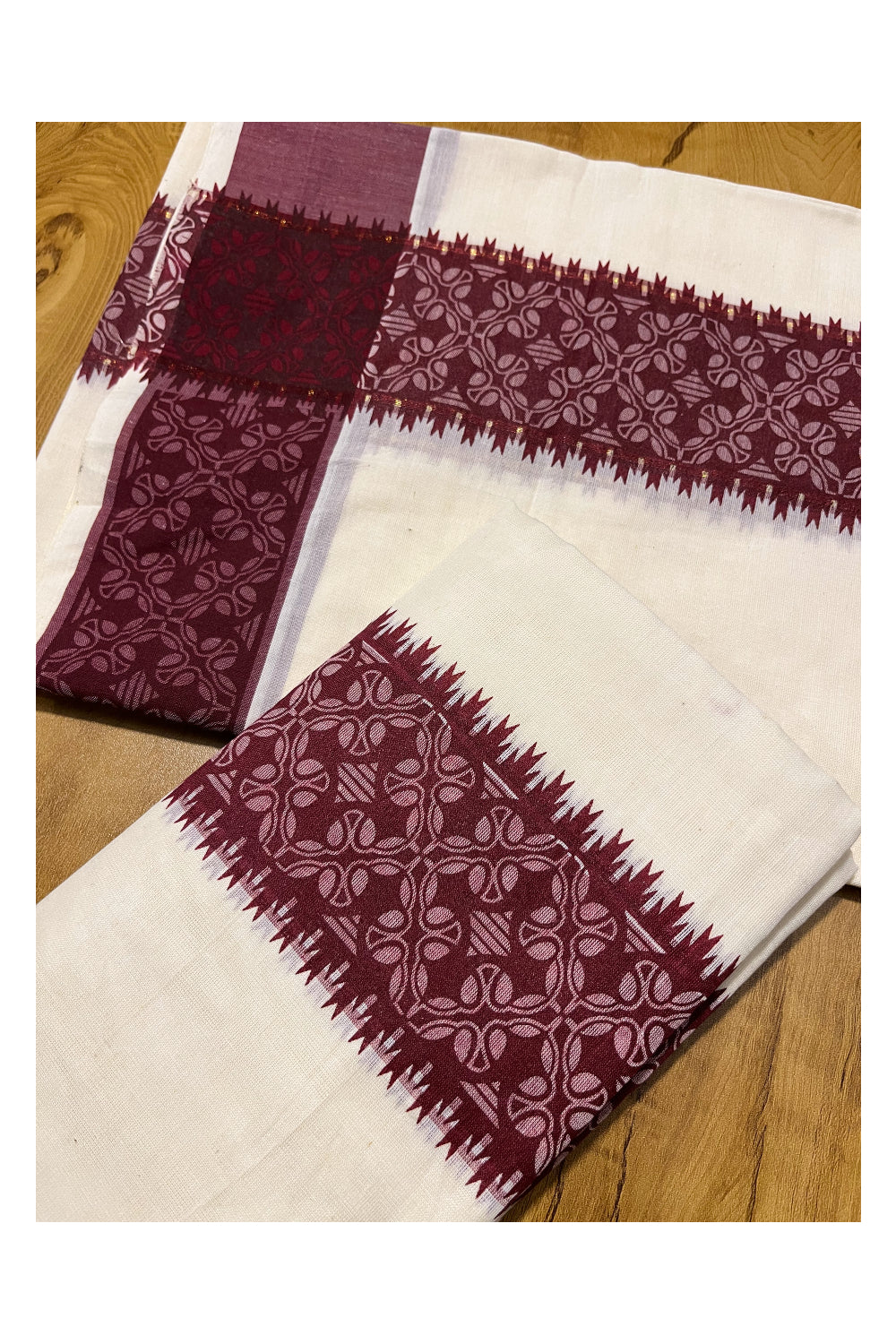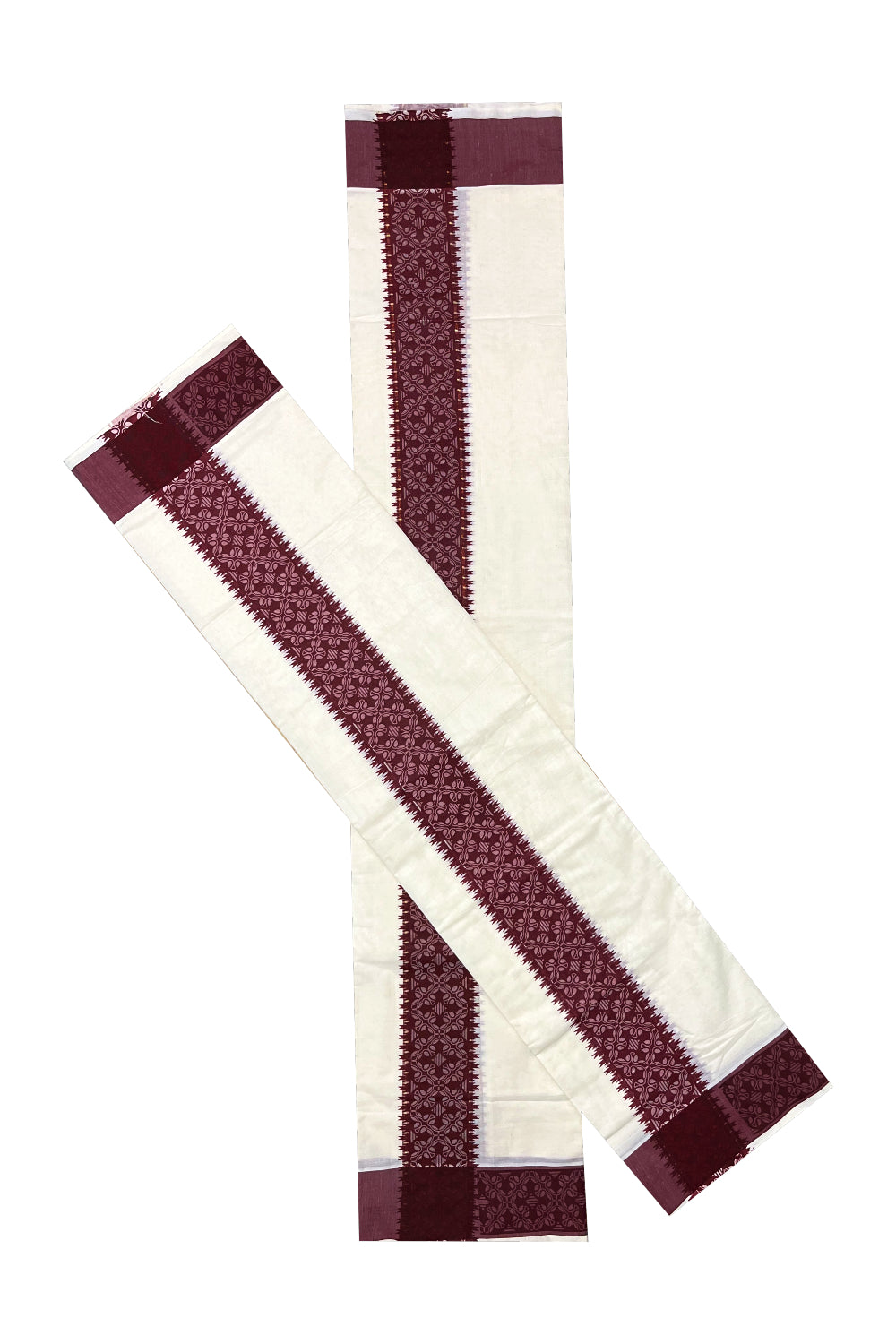 Kerala Cotton Single Set Mundu (Mundum Neriyathum) with Maroon Block printed Border 2.80 mtr