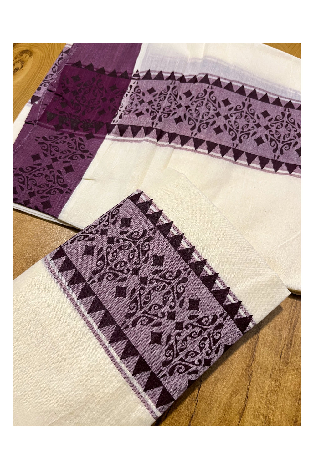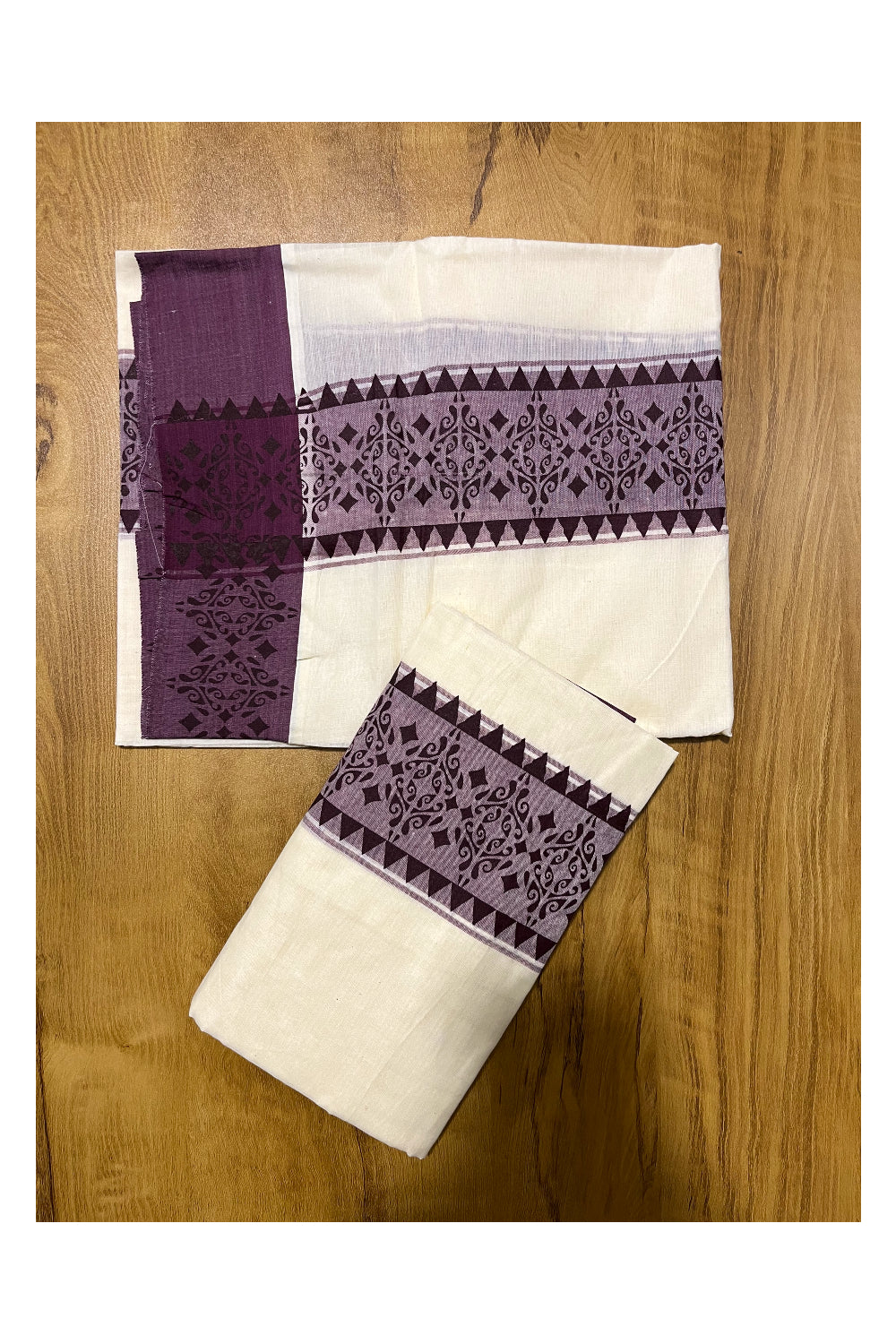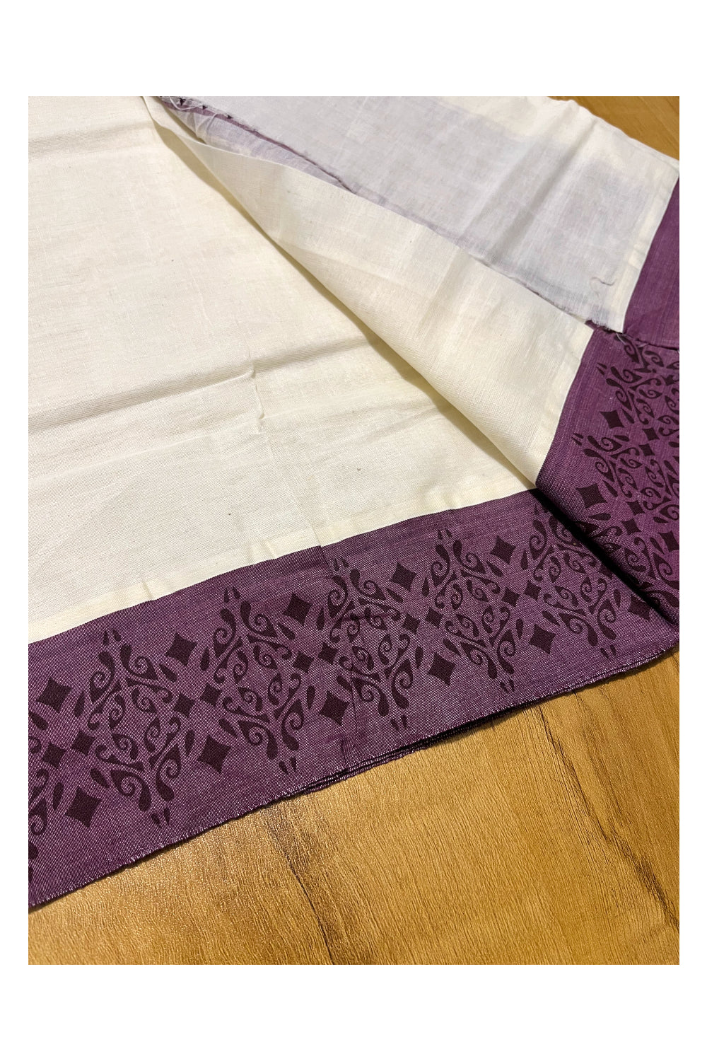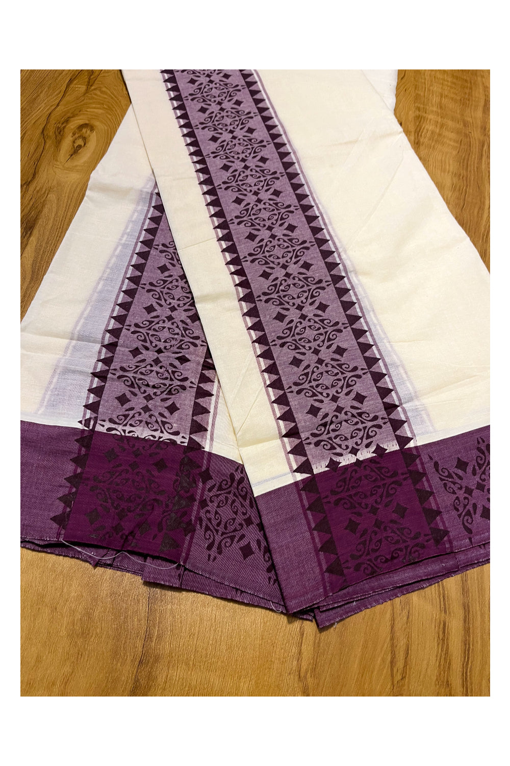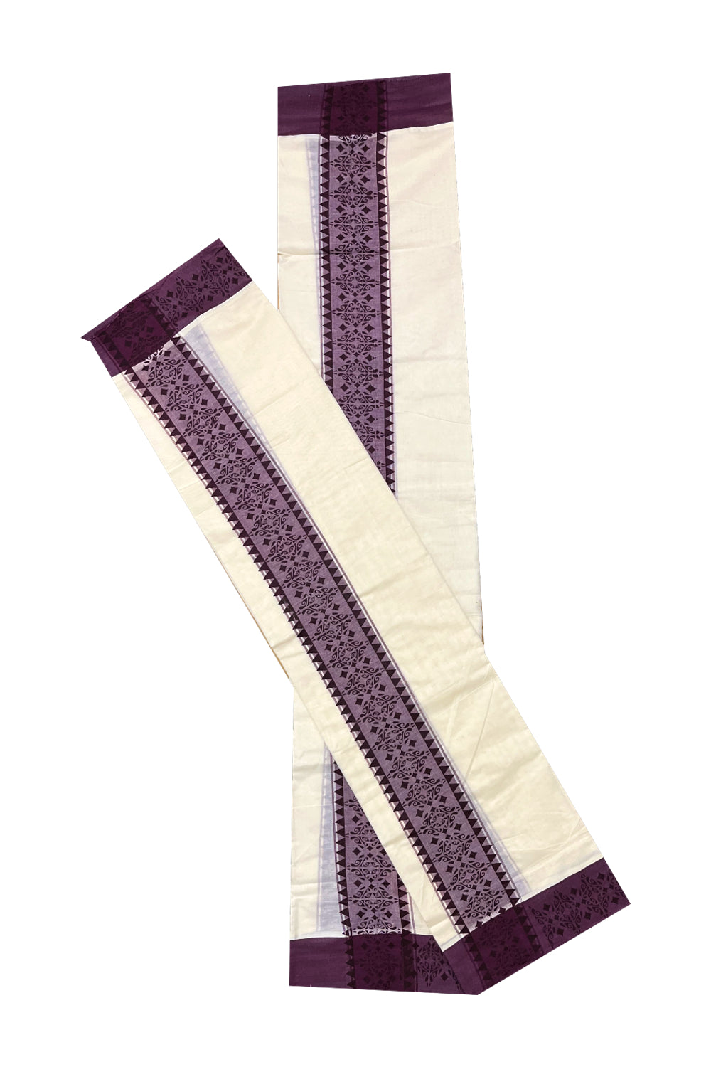 Kerala Cotton Single Set Mundu (Mundum Neriyathum) with Violet Temple Block printed Border 2.80 mtr