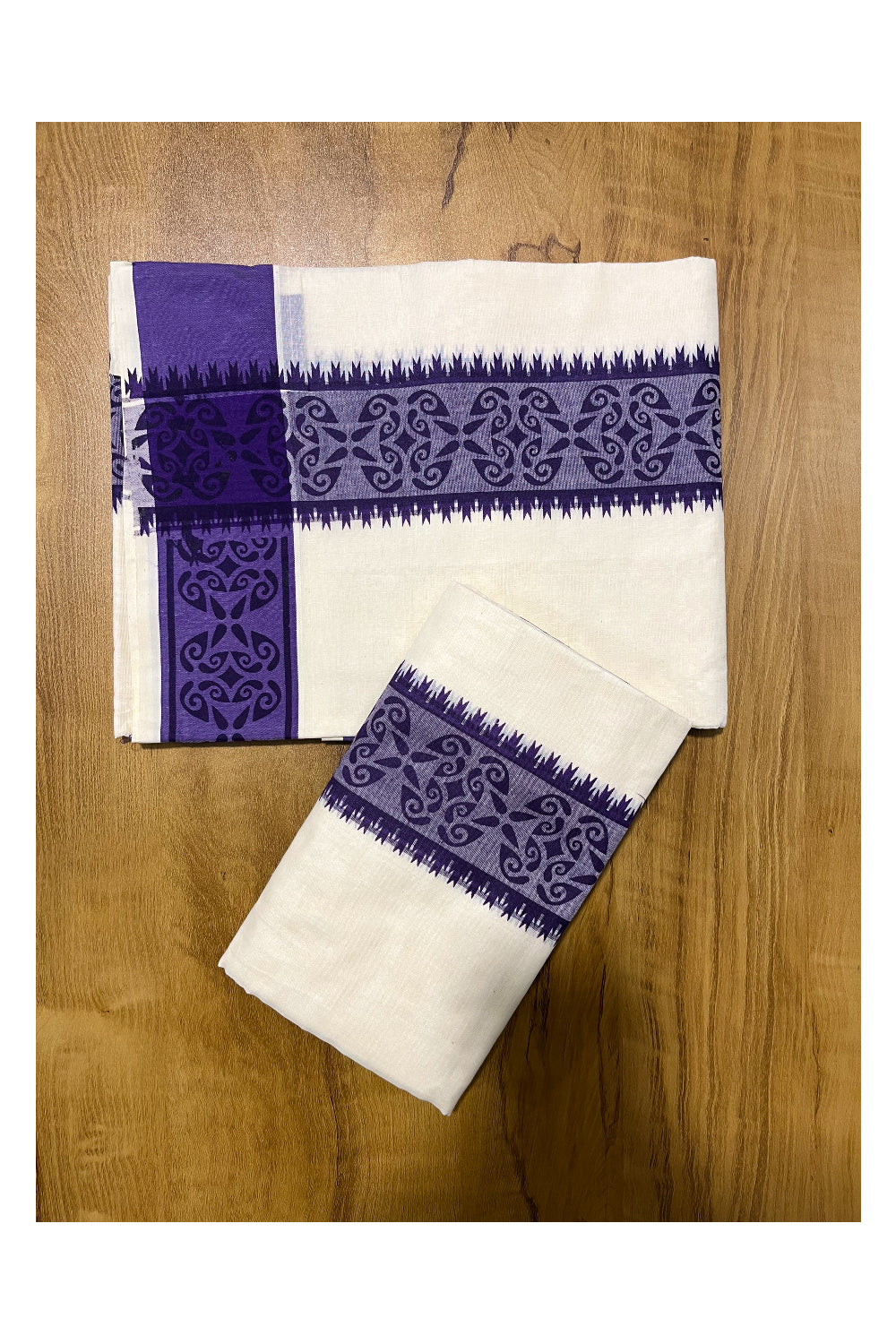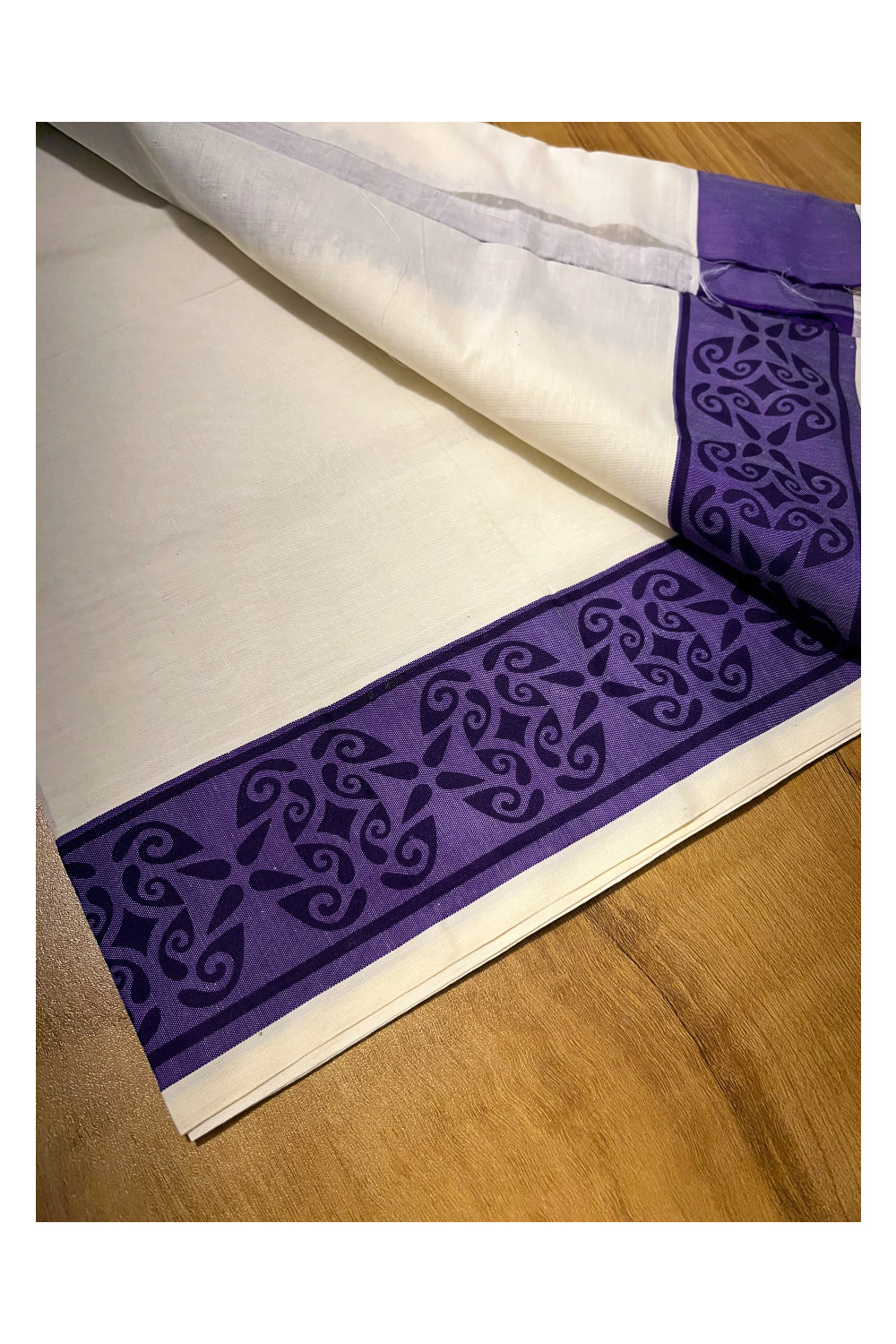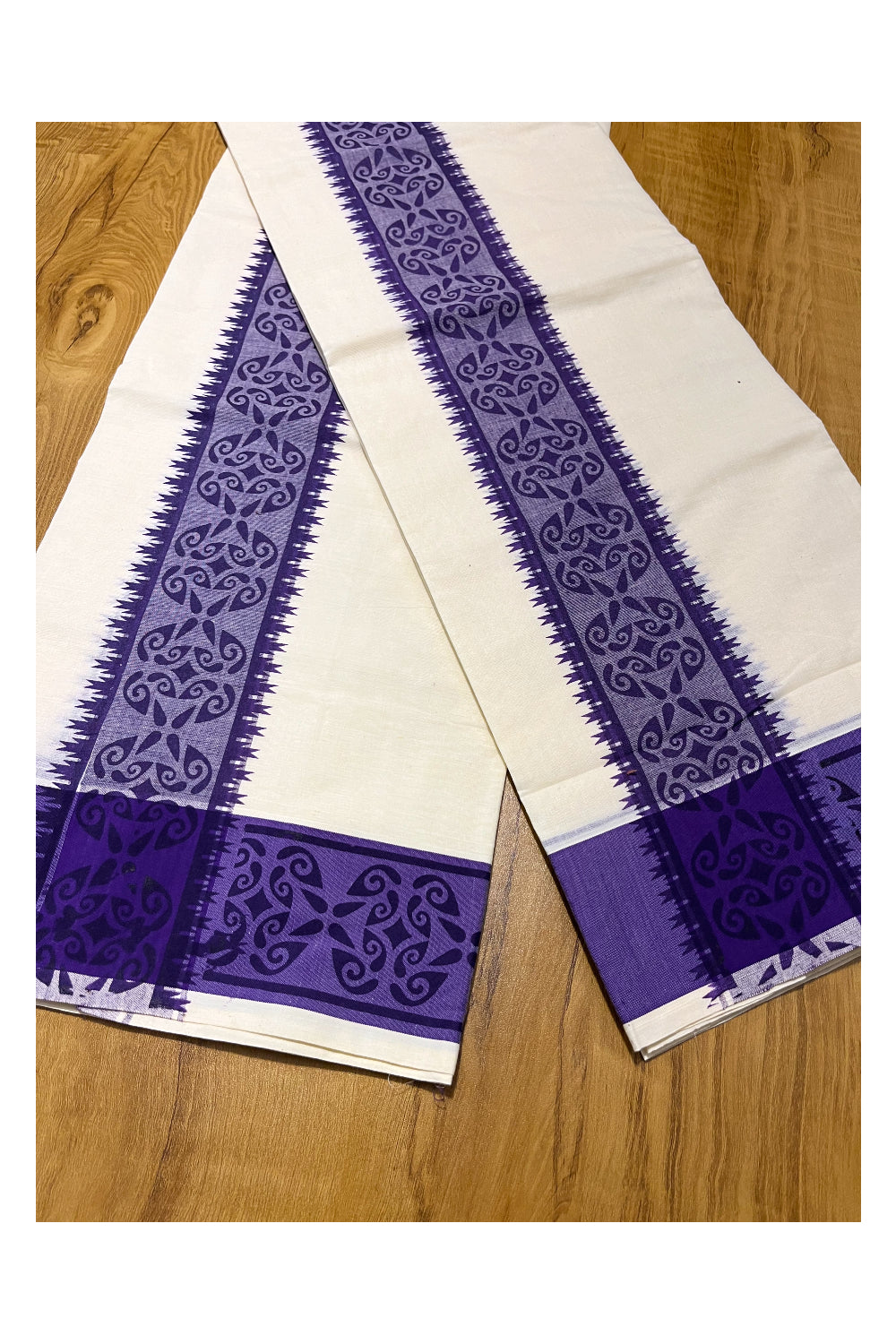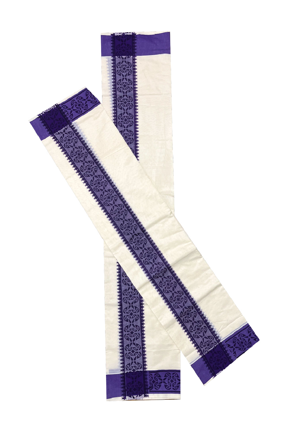 Kerala Cotton Single Set Mundu (Mundum Neriyathum) with Violet Block printed Border 2.80 mtr