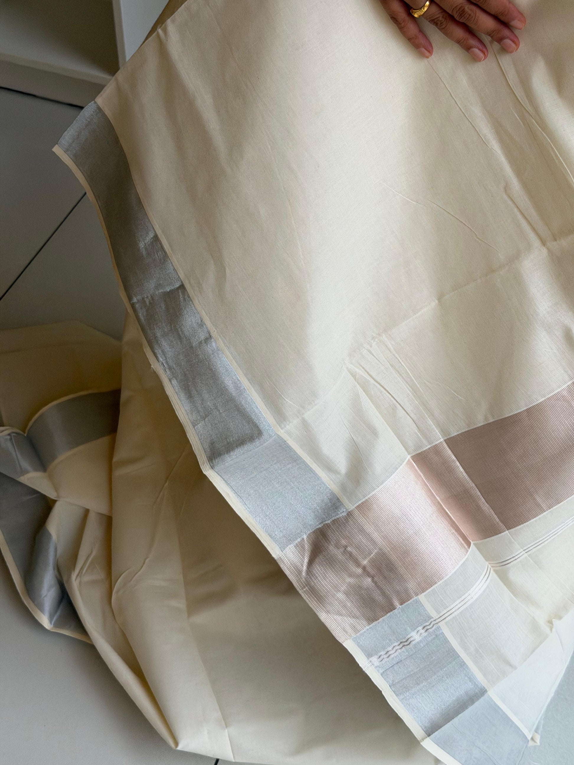Kerala Plain Cotton Silver Kasavu 3 Inch Saree SL153