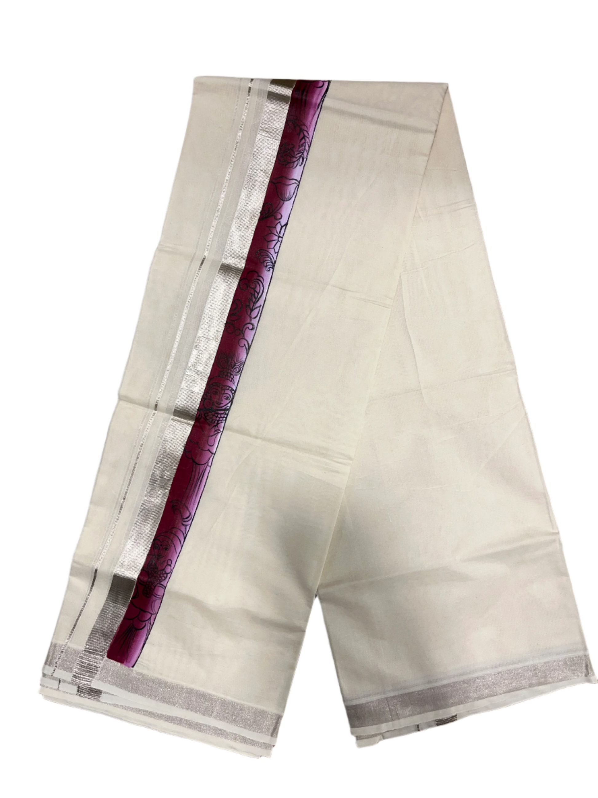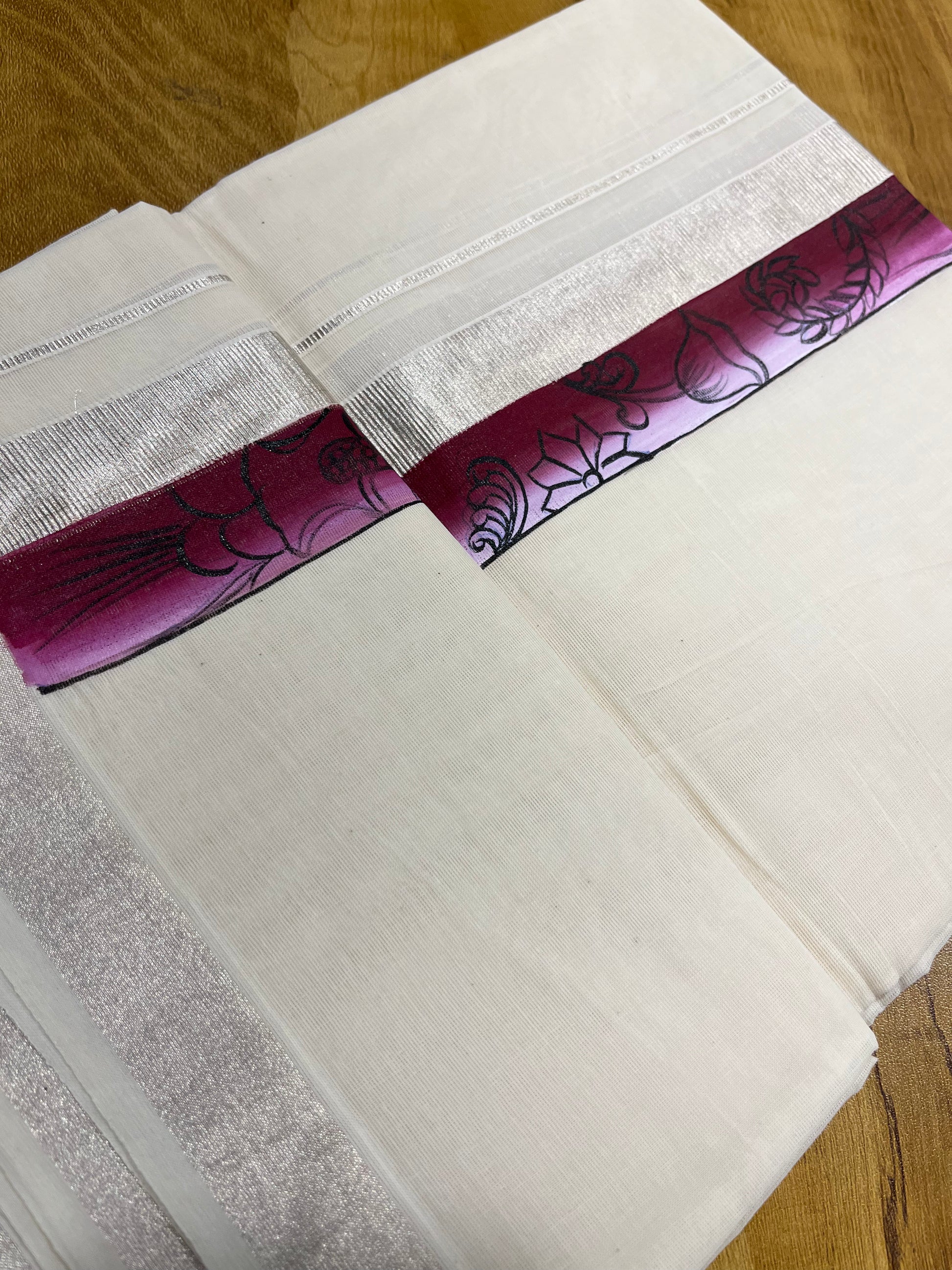 Kerala Pure Cotton Double Mundu with Mural Hand Painted Design on Silver Kasavu Border (Onam 2024 Special)