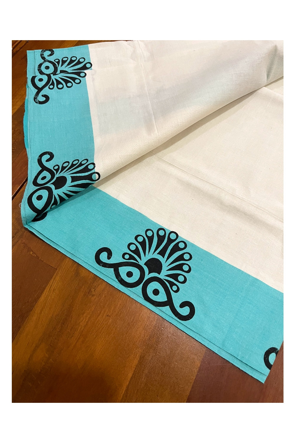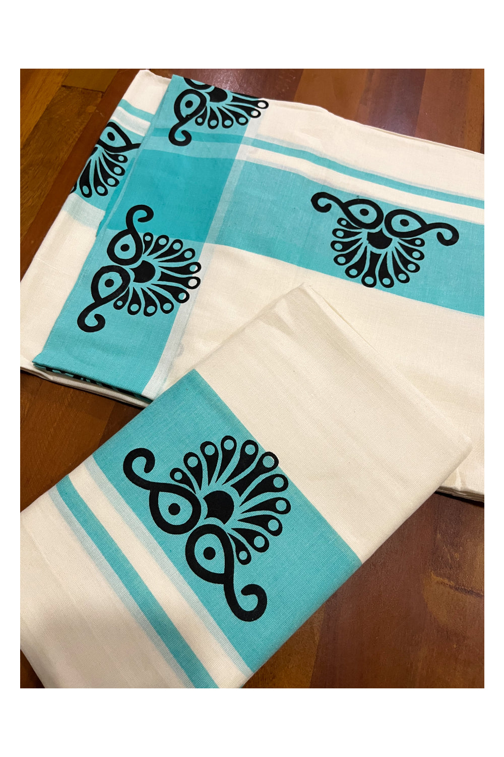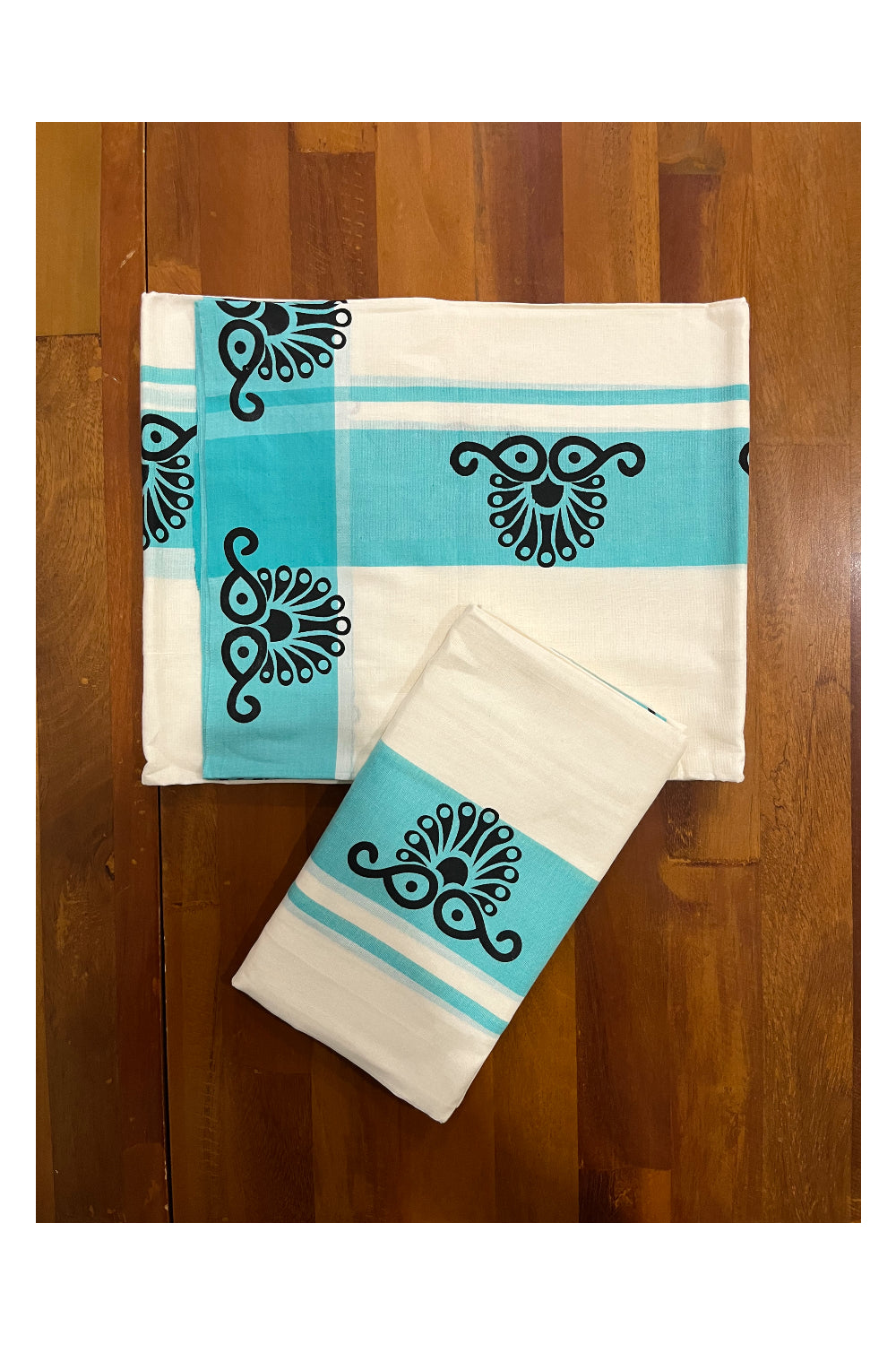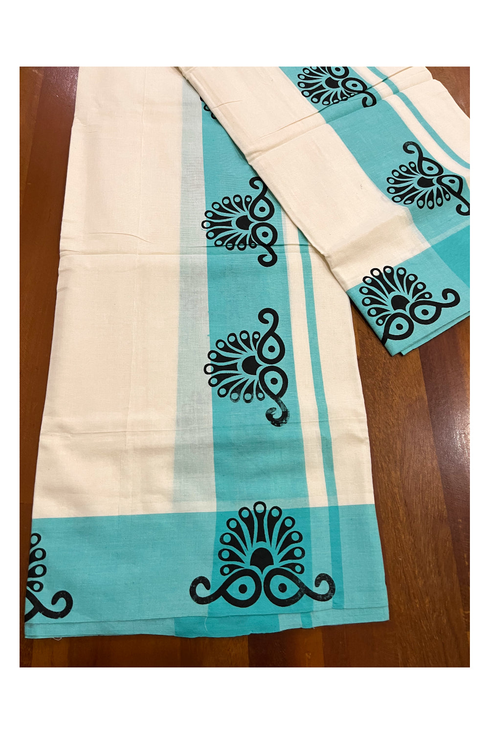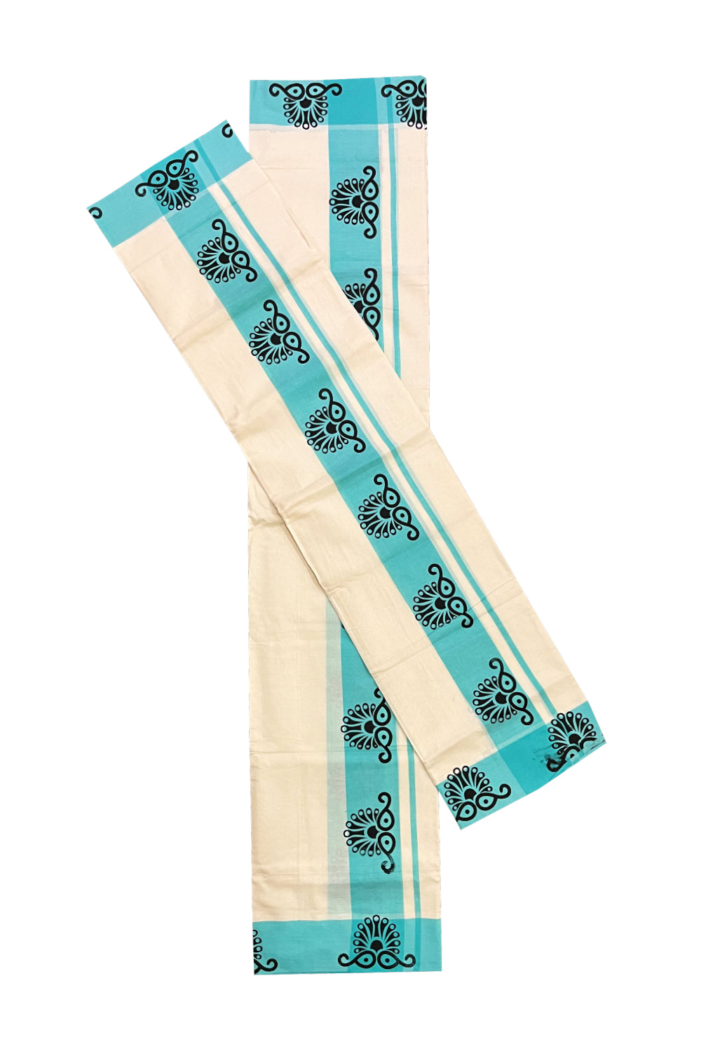 Kerala Pure Cotton Set Mundu (Mundum Neriyathum) with Block Printed Turquoise Border (Onam Set Mundu 2023)