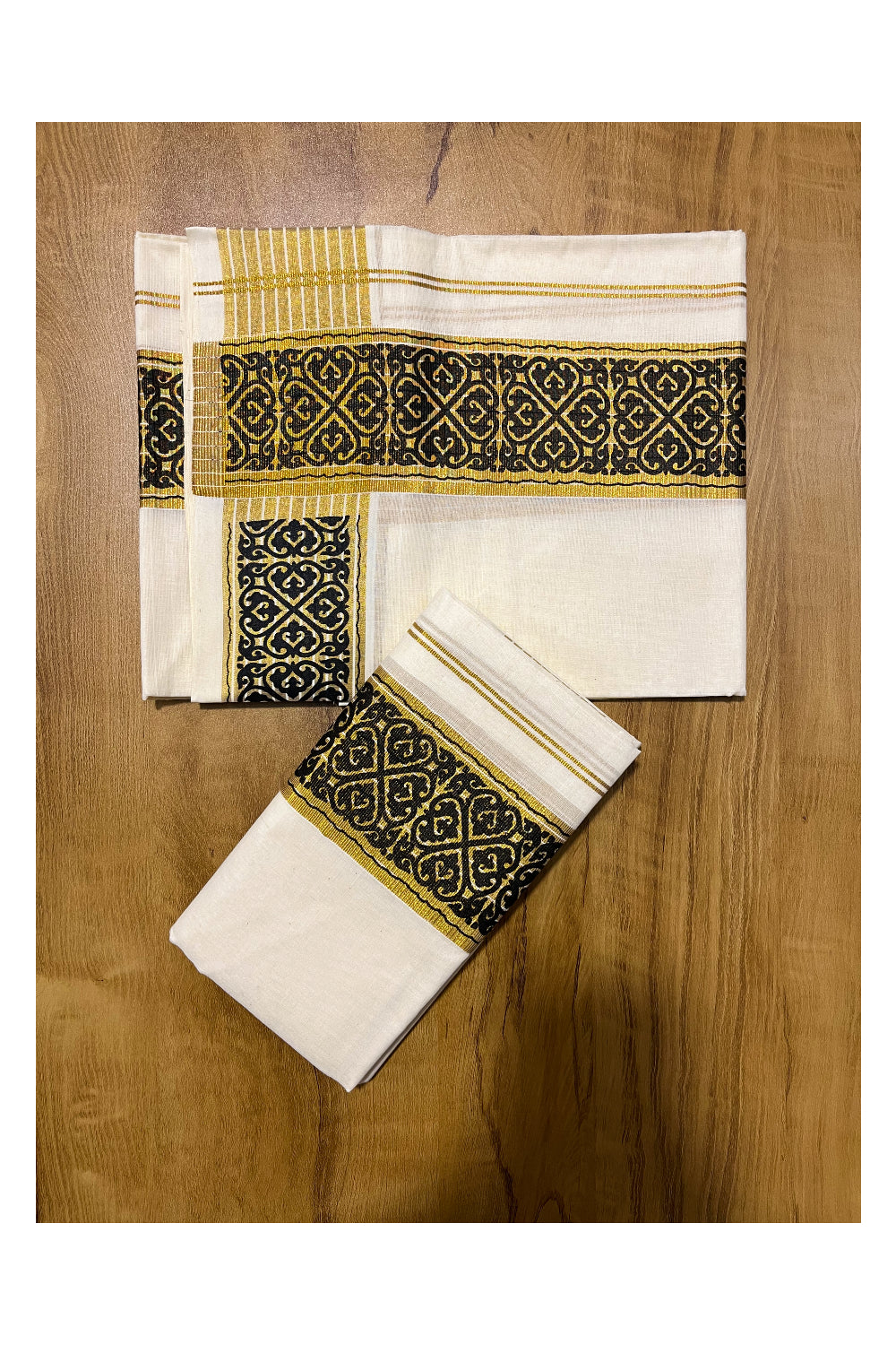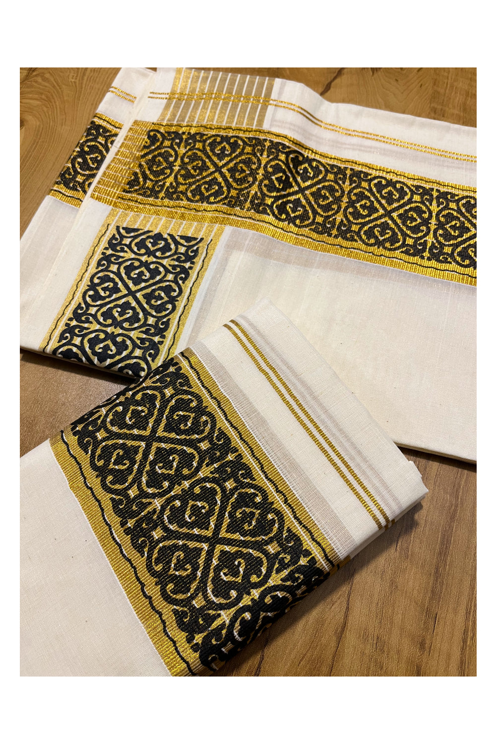 Kerala Pure Cotton Set Mundu Single (Mundum Neriyathum) with Black Block Prints on Kasavu Border 2.80Mtrs
