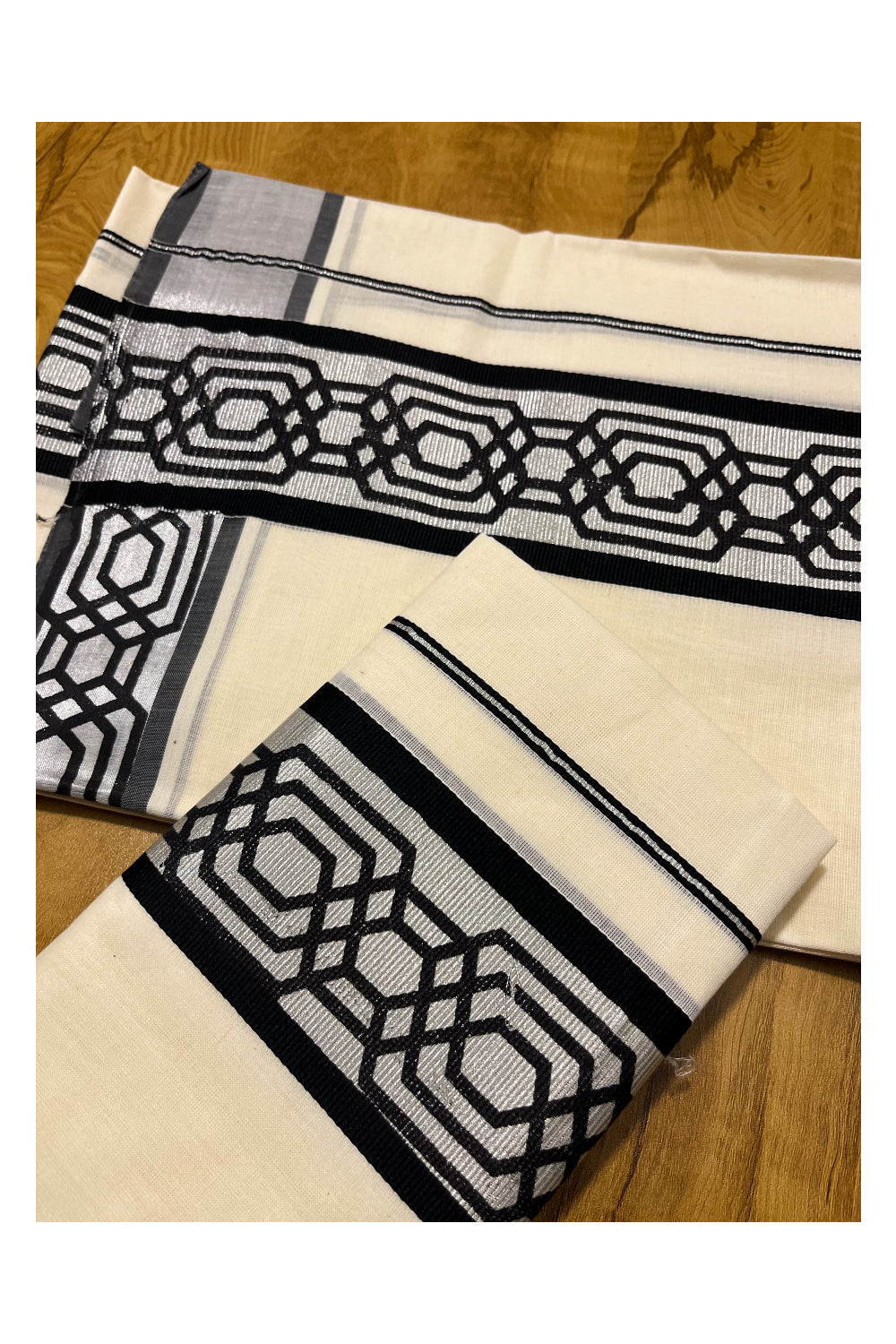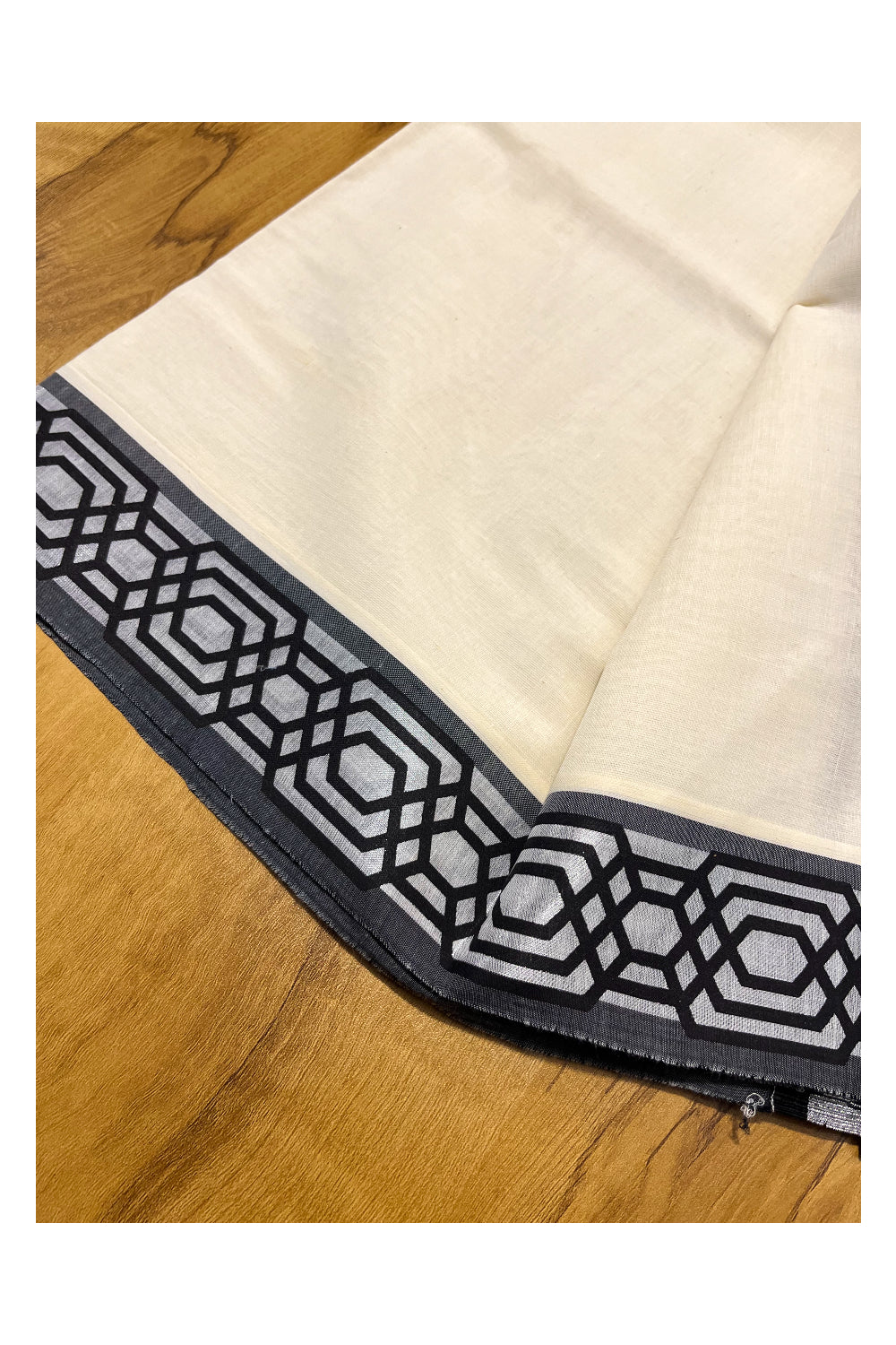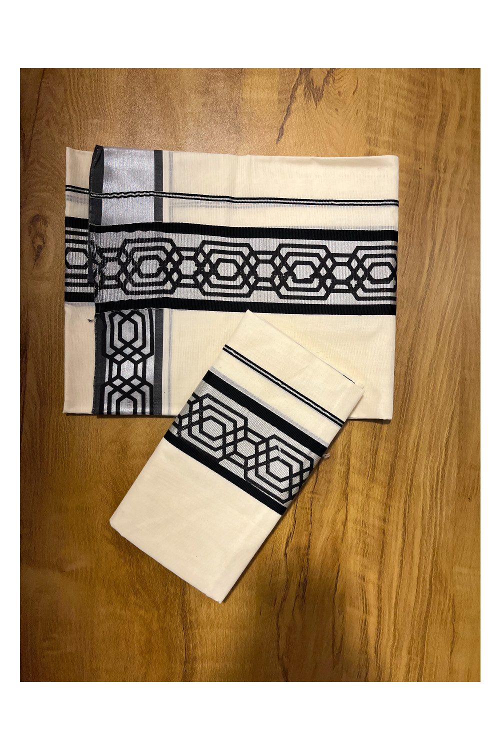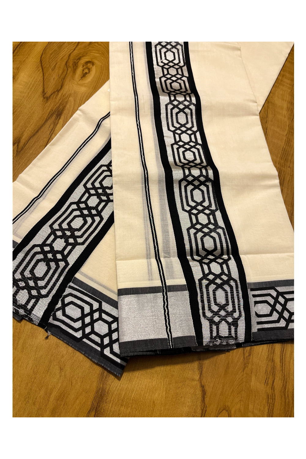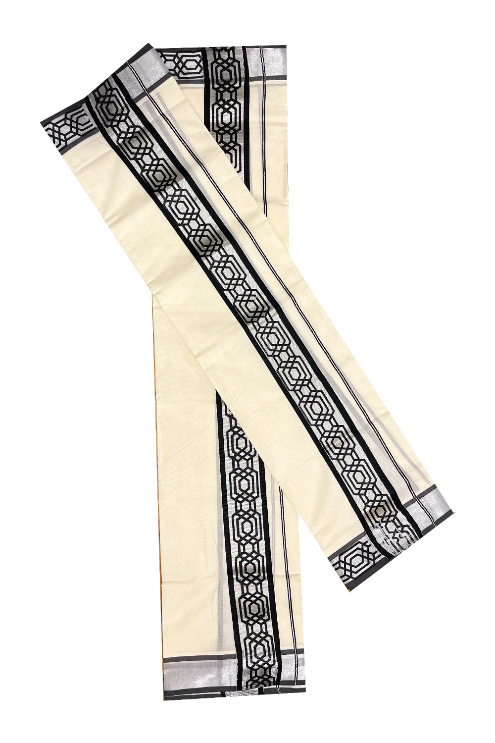 Kerala Pure Cotton Set Mundu Single (Mundum Neriyathum) with Black Block Prints on Silver Kasavu Border
