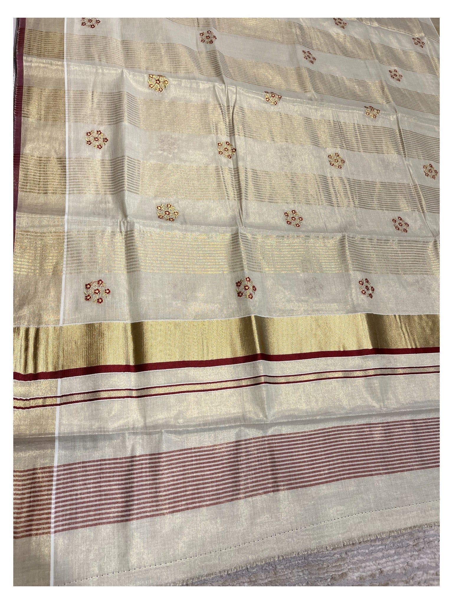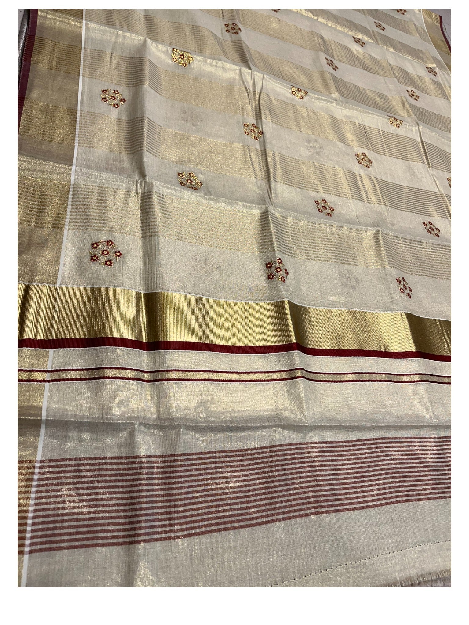 Kerala Tissue Kasavu Lines Saree with Golden And Maroon Embroidery Works