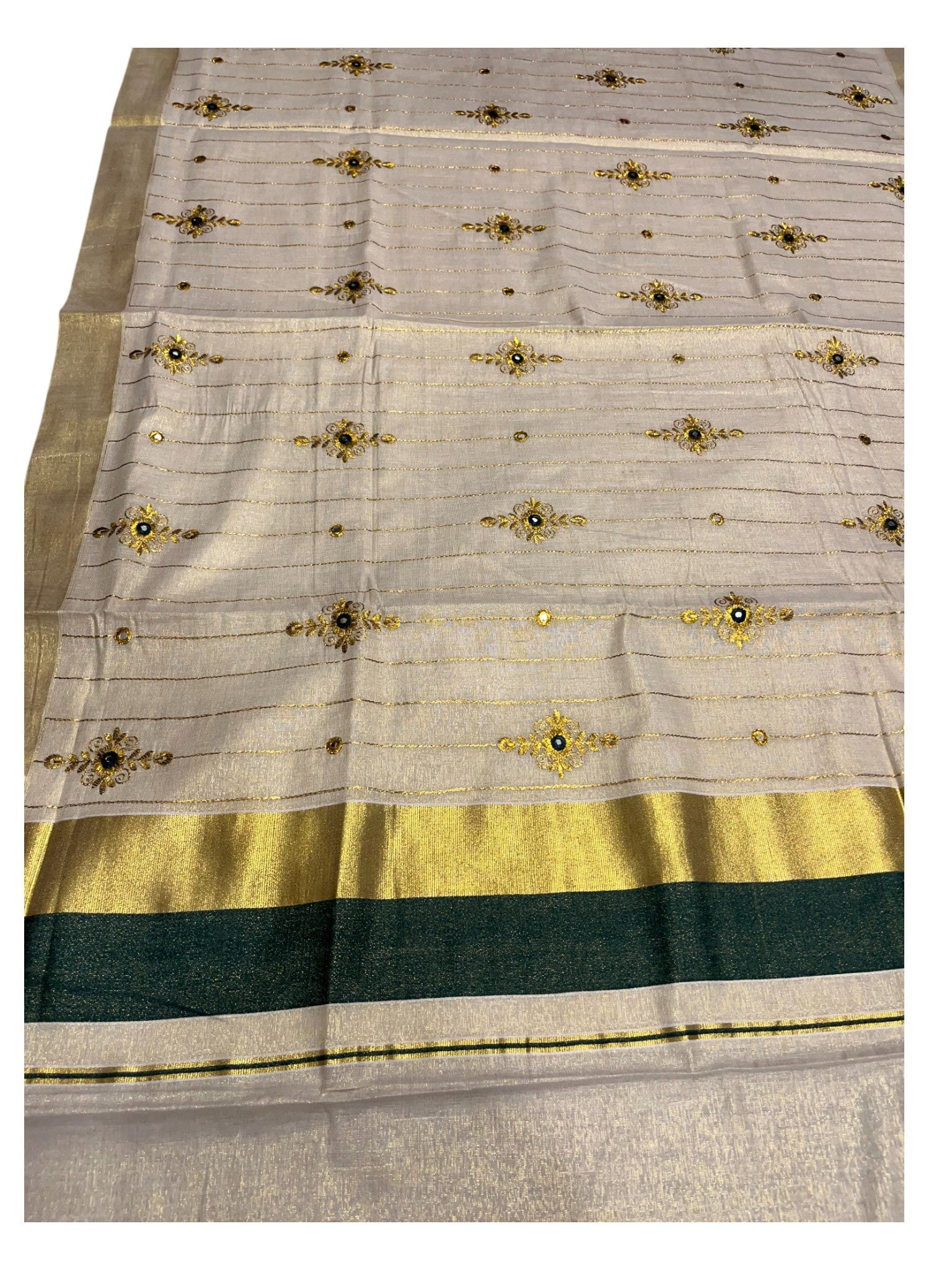 Kerala Tissue Kasavu Lines Saree with Golden And Green Embroidery Works