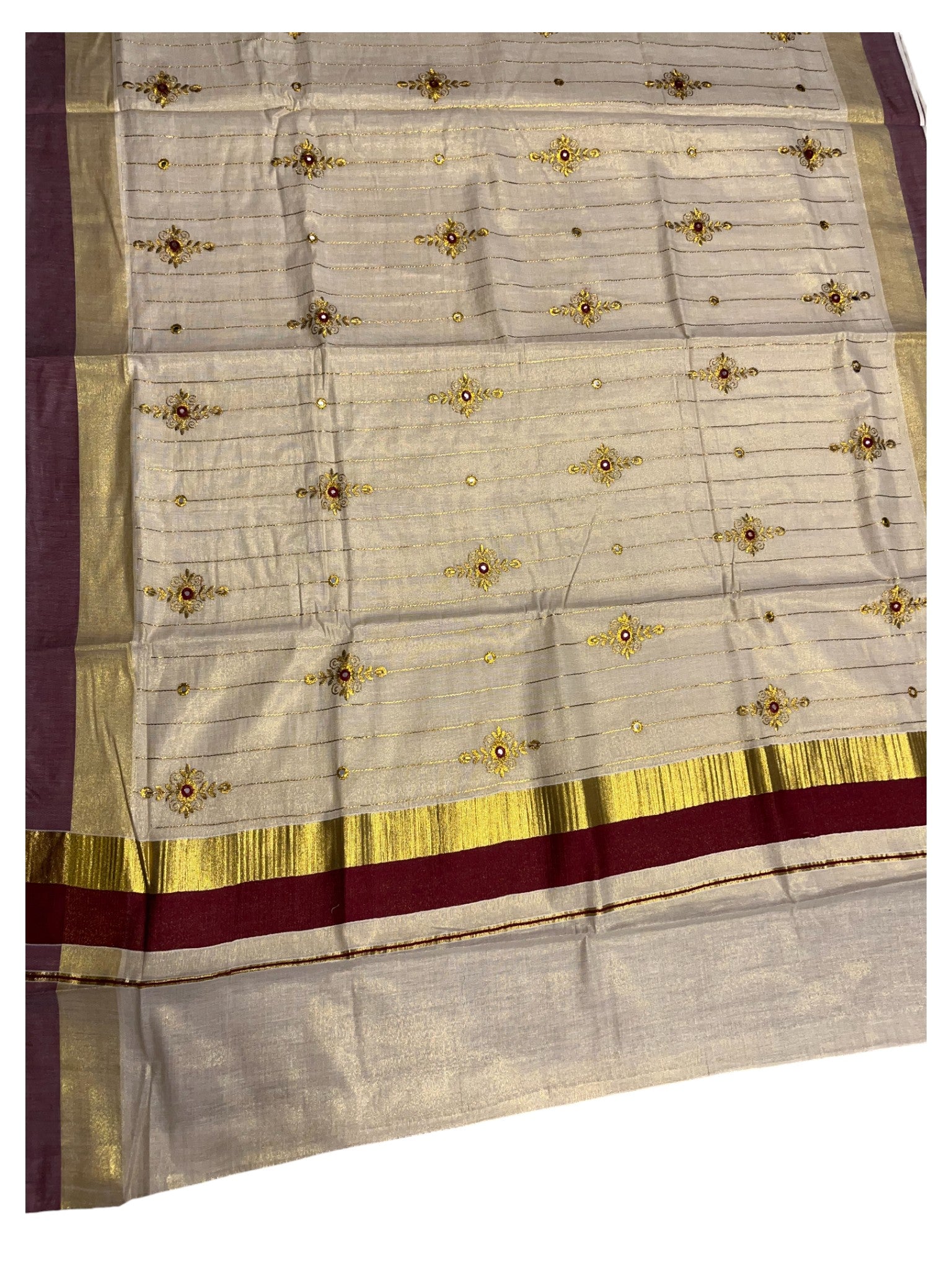 Tissue Kerala Saree with Embroidery Designs on Body. Simple saree for everyday wear, may it be to the office or to the temple.