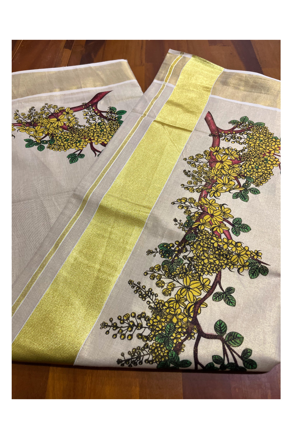 Kerala Tissue Kasavu Saree with Kanikonna Floral Prints on Body and Kasavu Border