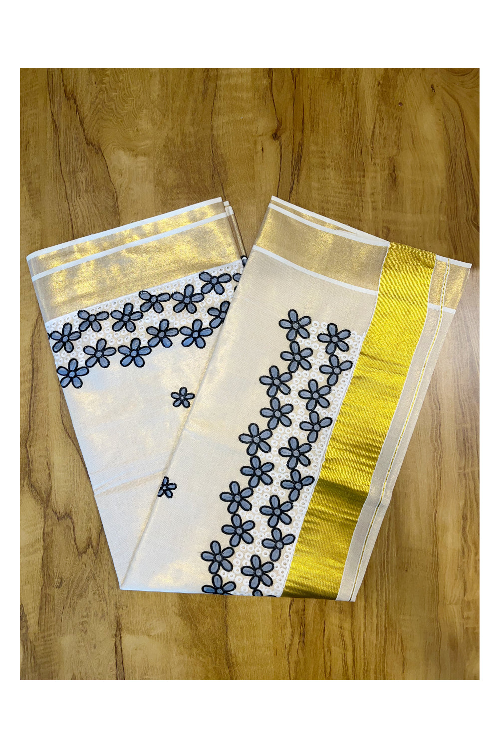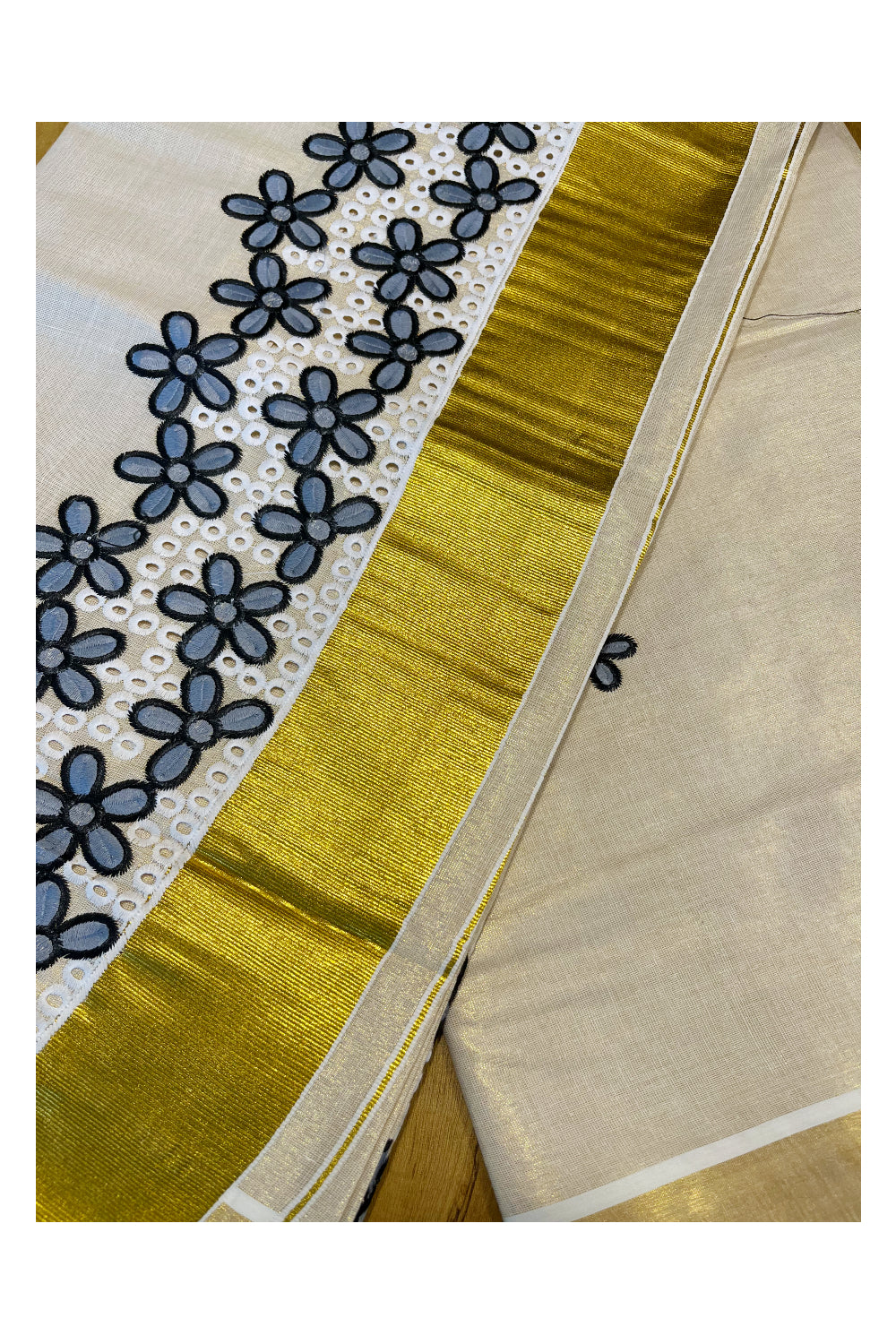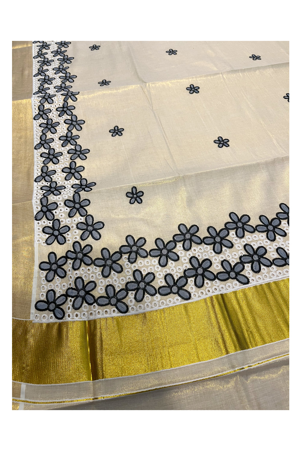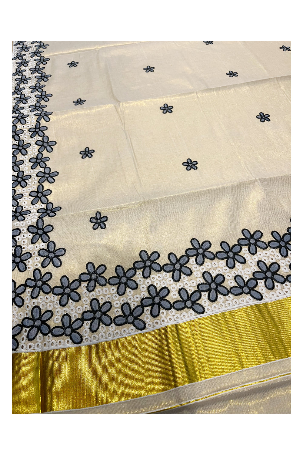 Kerala Tissue Kasavu Saree with Grey Floral Embroidery Works