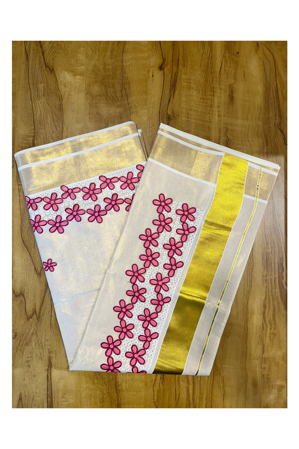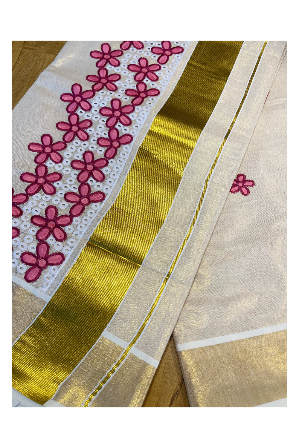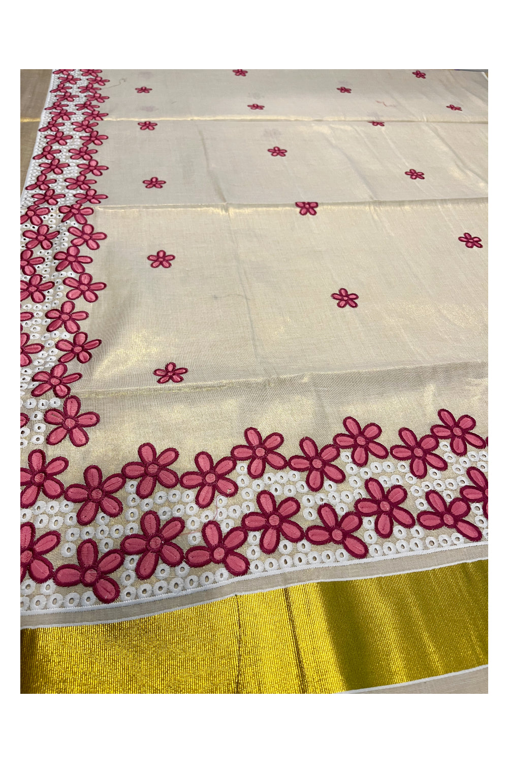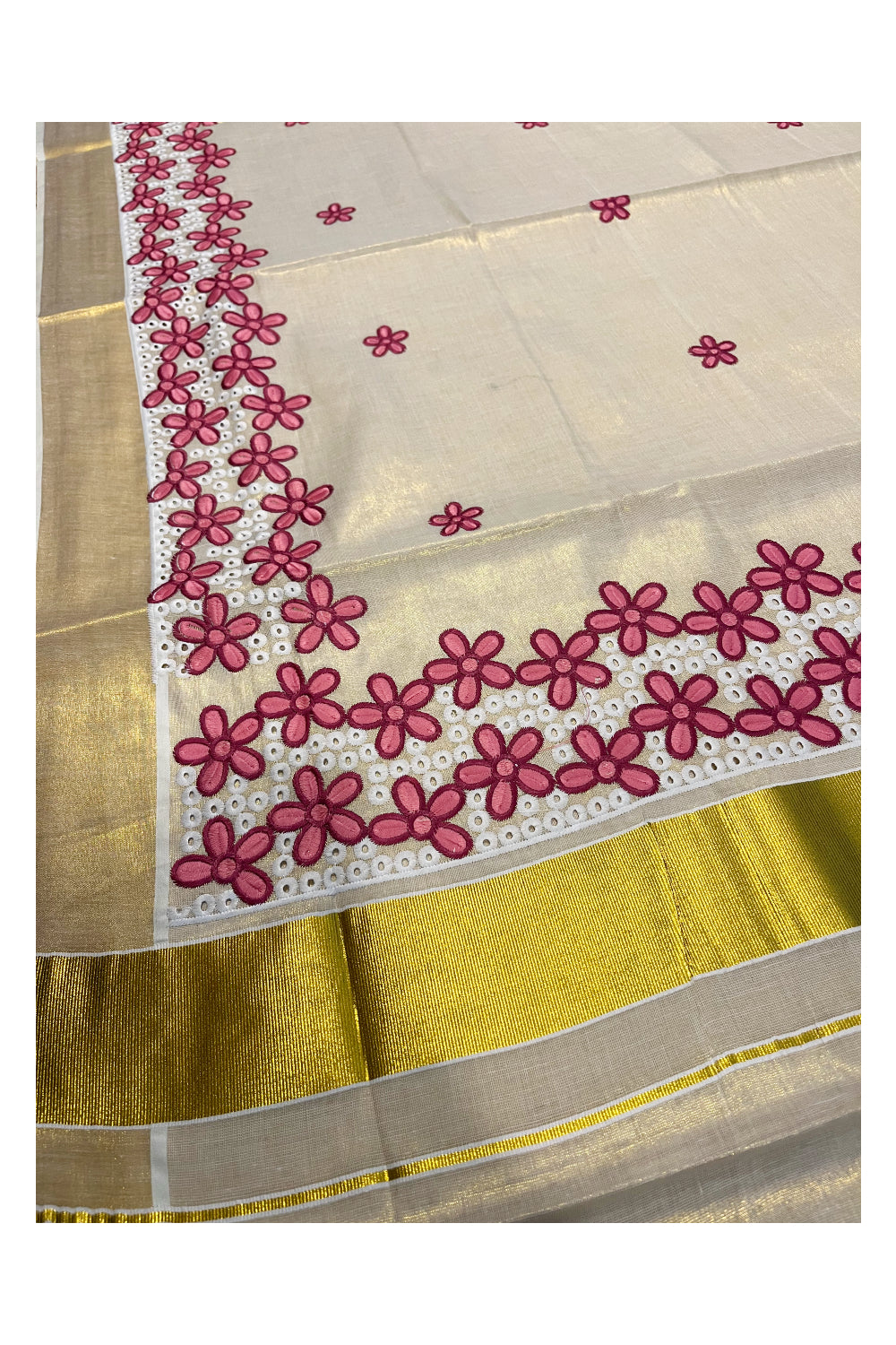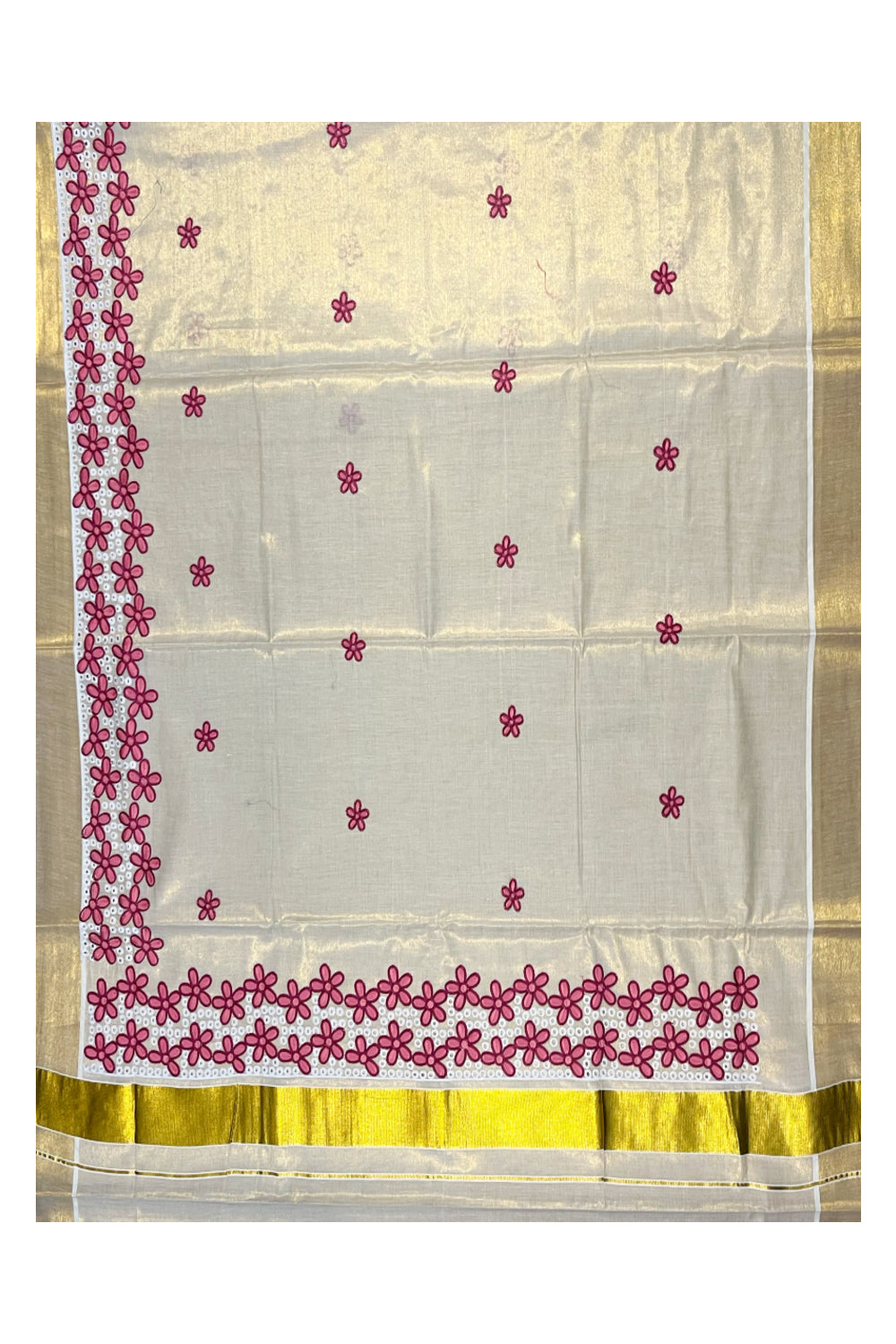 Kerala Tissue Kasavu Saree with Pink Floral Embroidery Works
