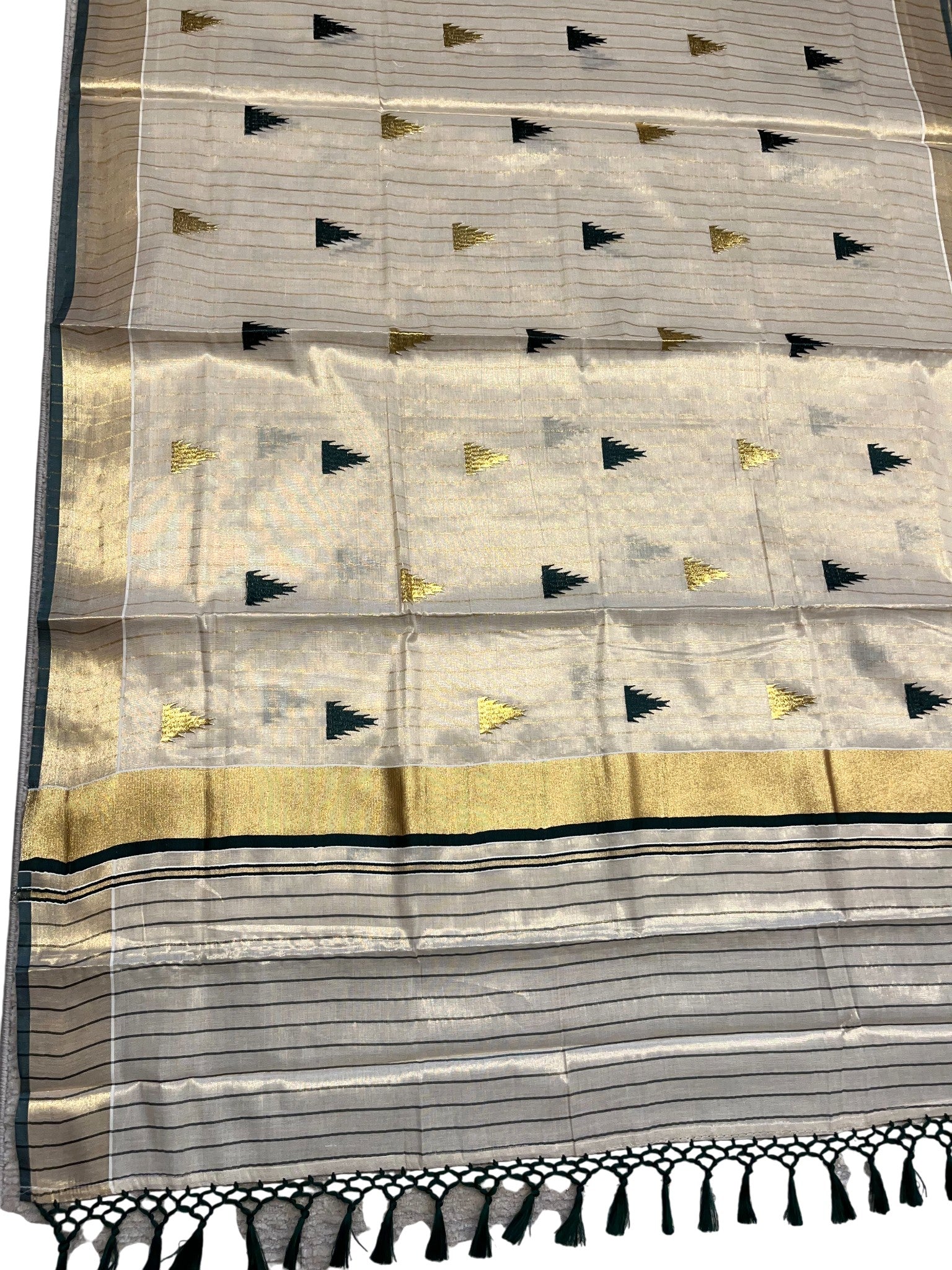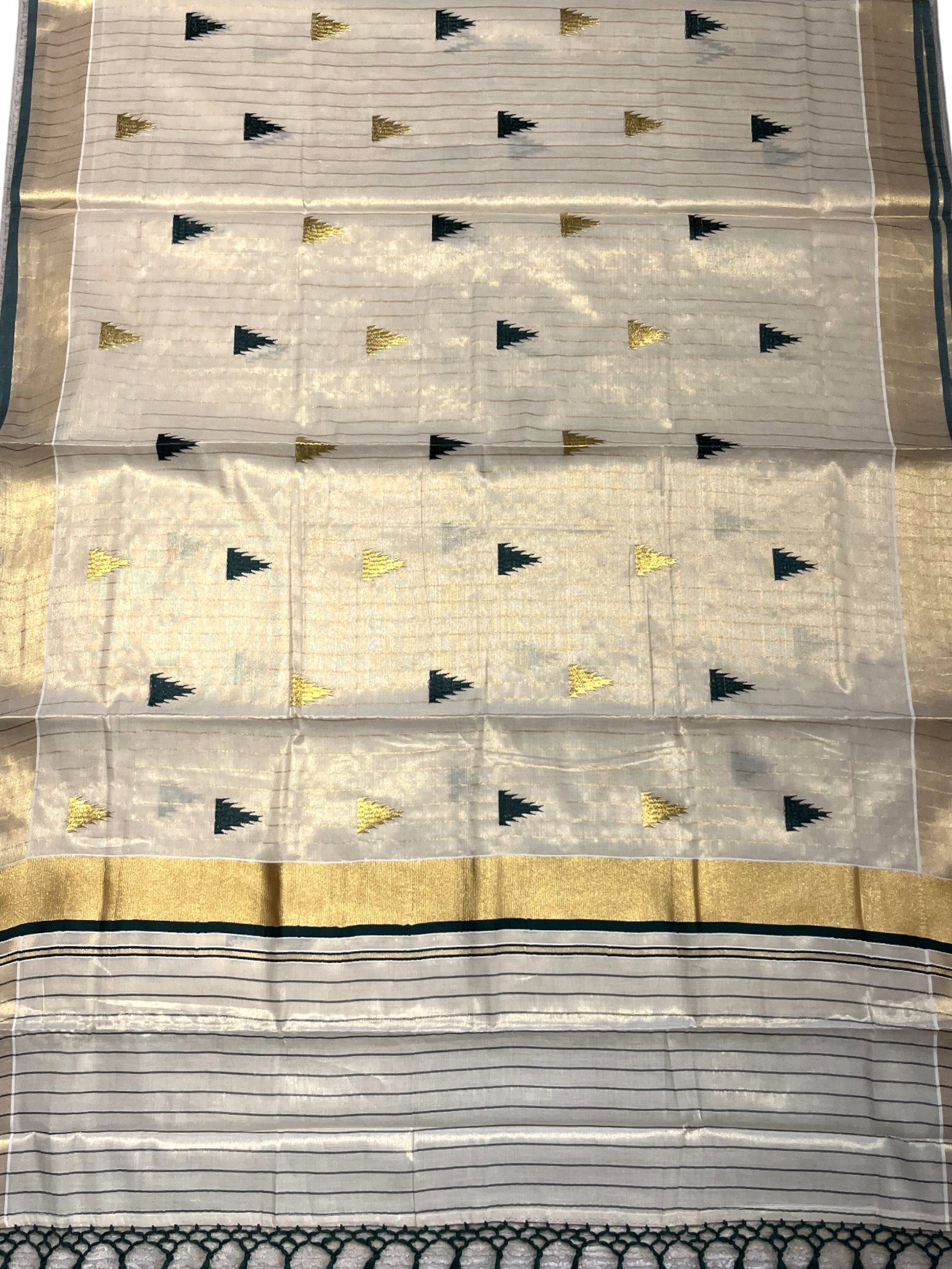 Kerala Tissue Kasavu Stripes Saree with Green and Gold Temple Embroidery Design on Body
