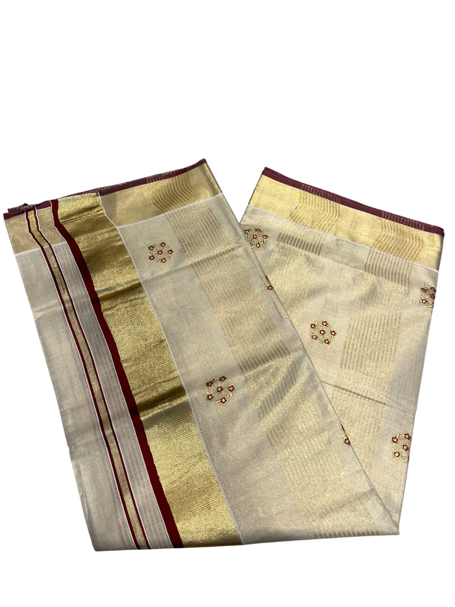 Kerala Tissue Kasavu Stripes Saree with Maroon and Gold Embroidery Design on Body