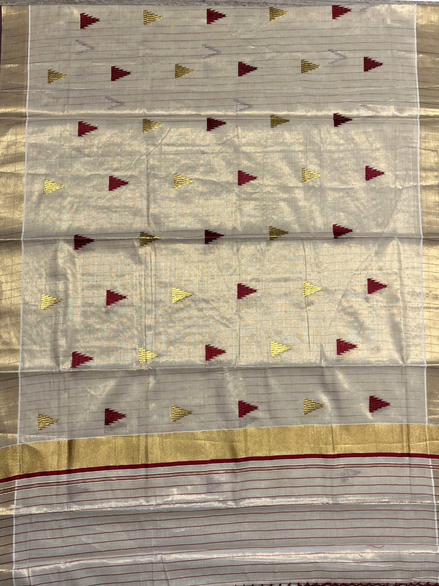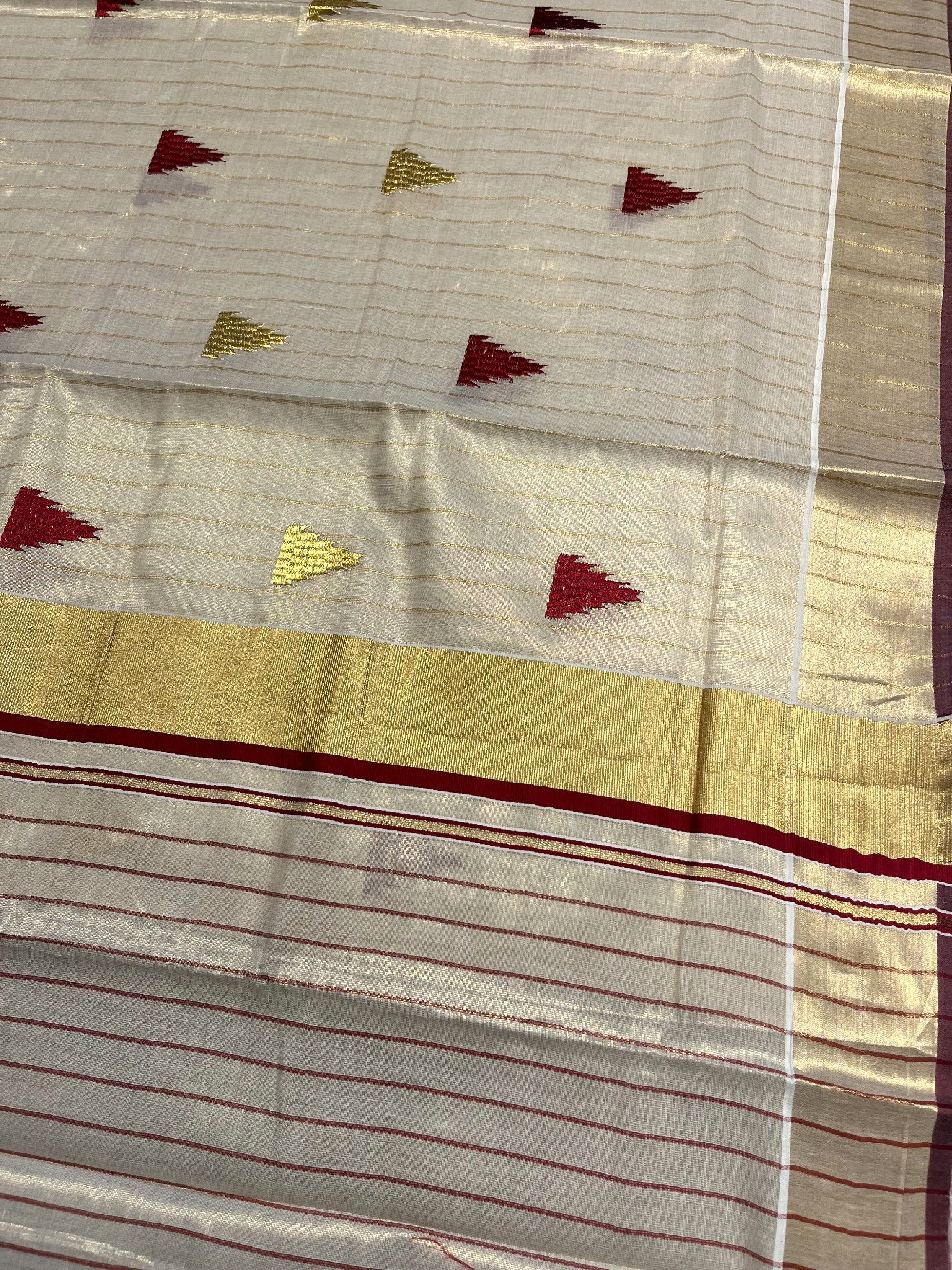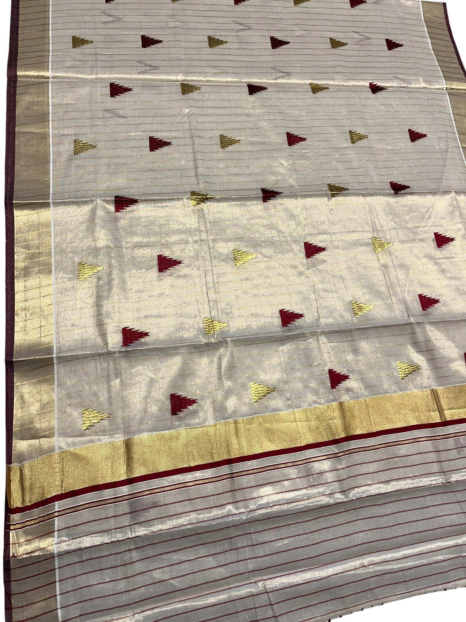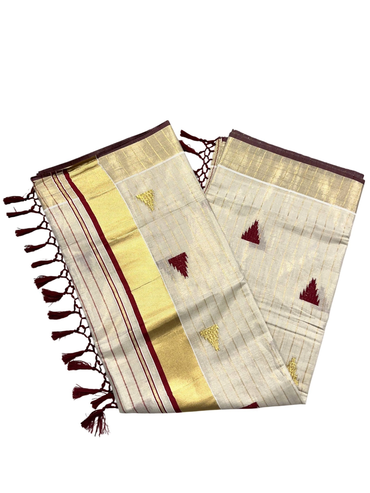 Kerala Tissue Kasavu Stripes Saree with Meroon and Gold Temple Embroidery Design on Body