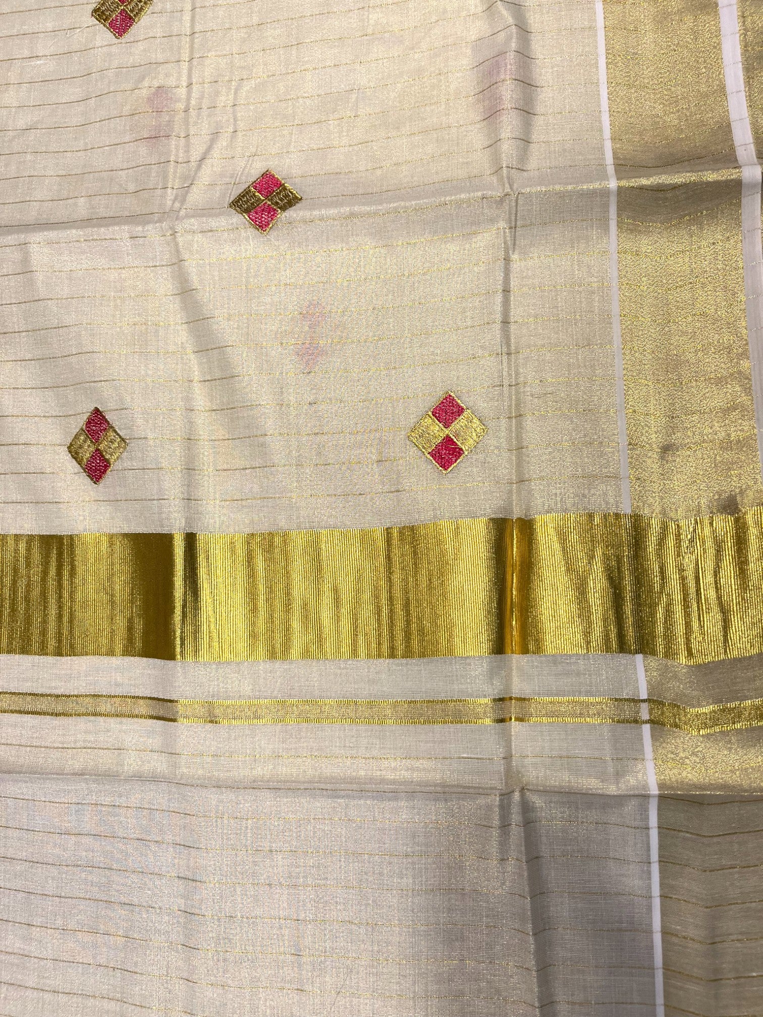 Kerala Tissue Kasavu Stripes Saree with Pink and Gold Embroidery Design on Body
