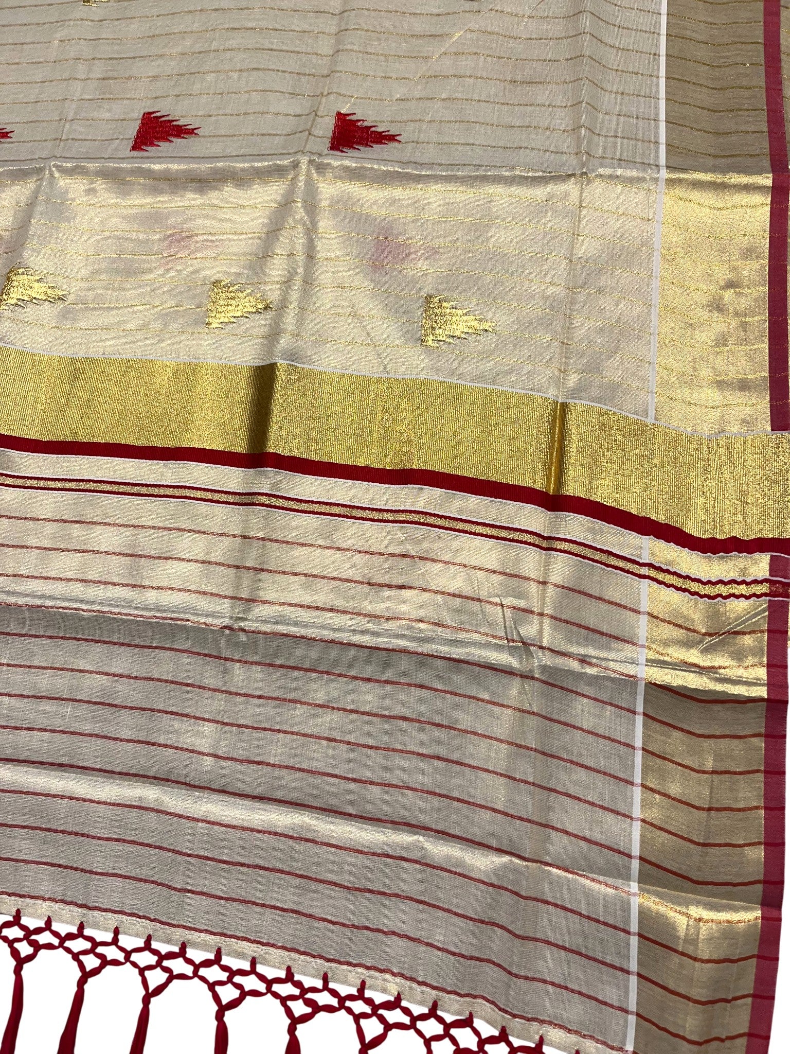 Kerala Tissue Kasavu Stripes Saree with Red and Gold Temple Embroidery Design on Body