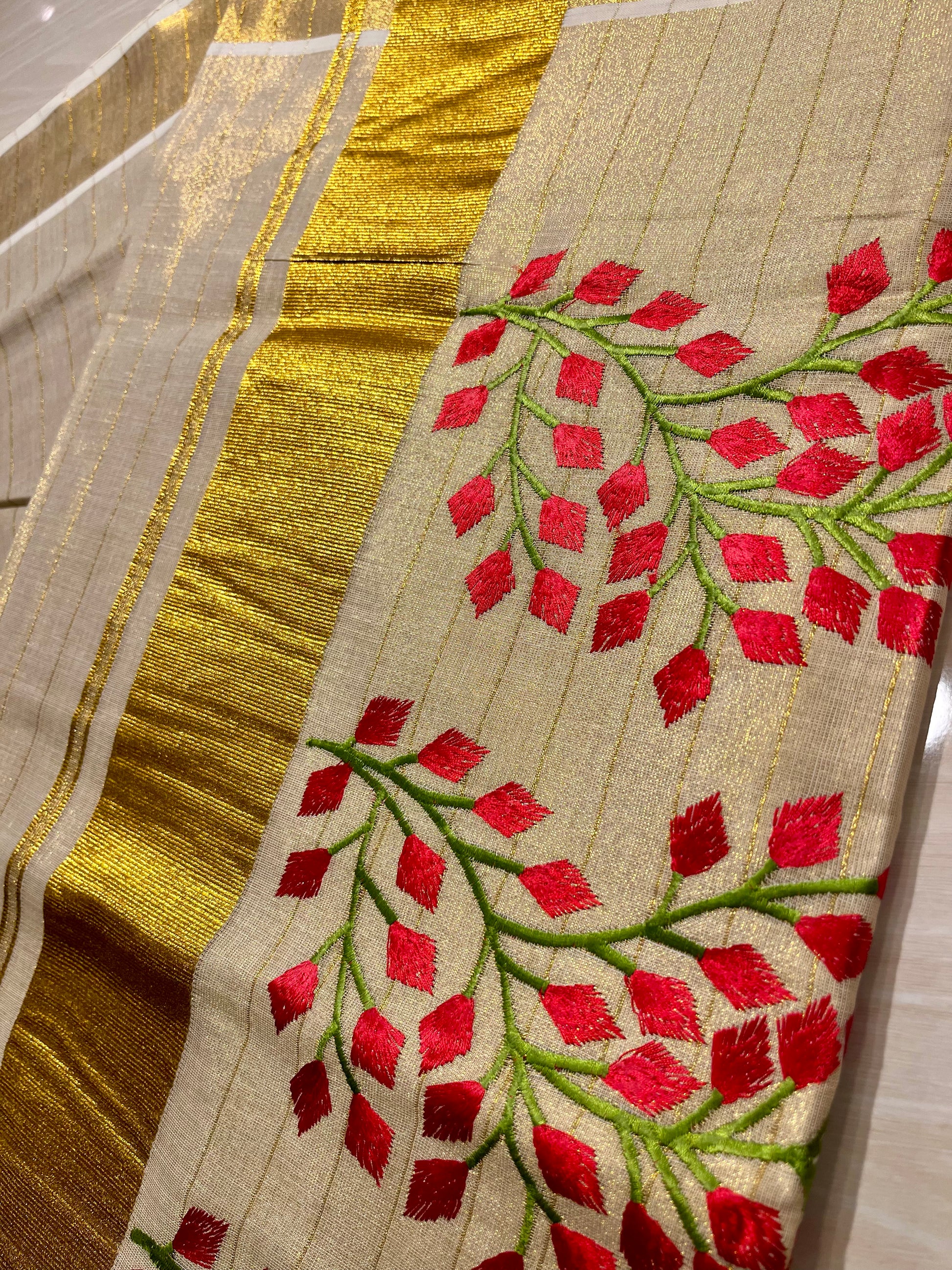 Kerala Tissue Saree With Red & Green Embroidery SL145
