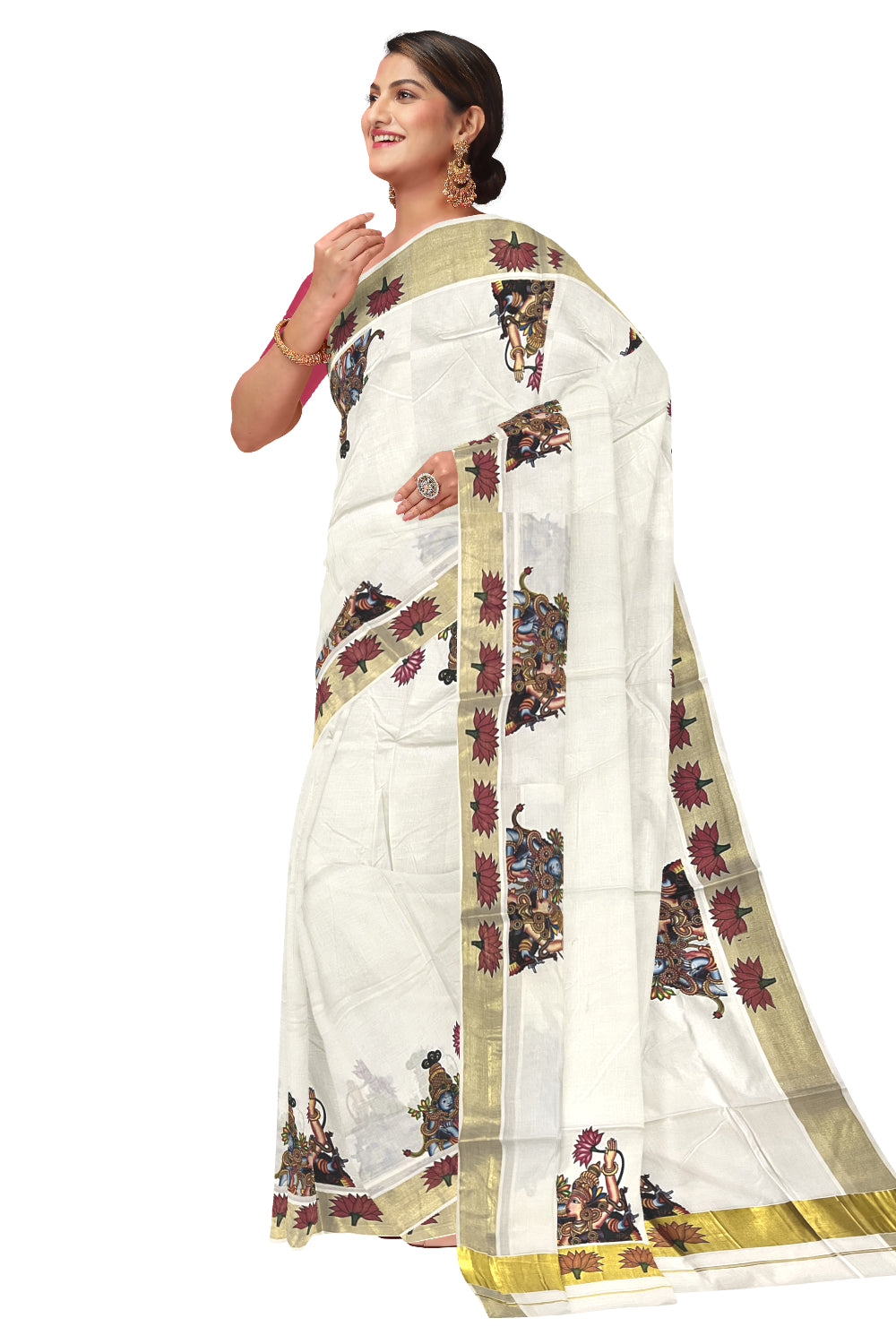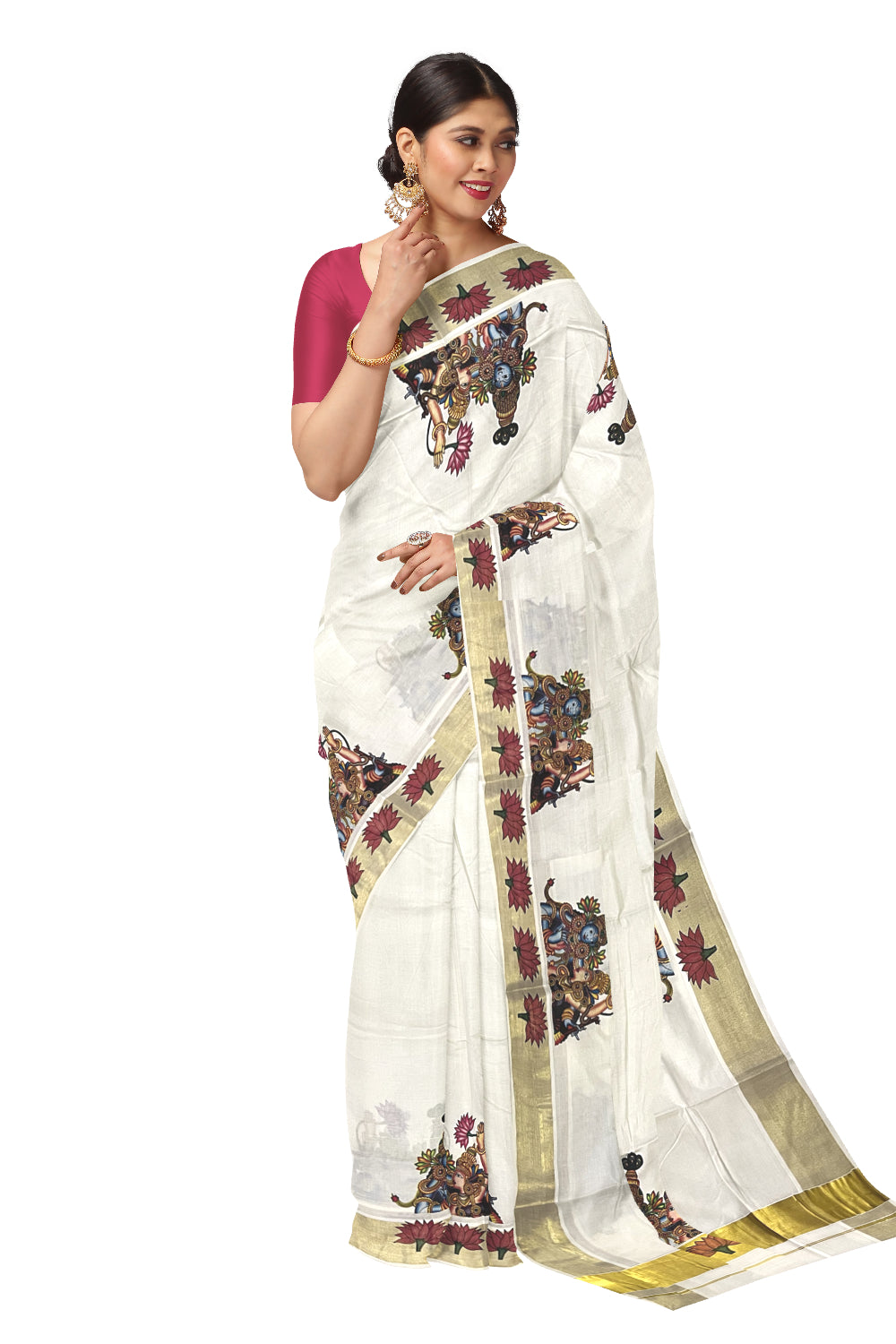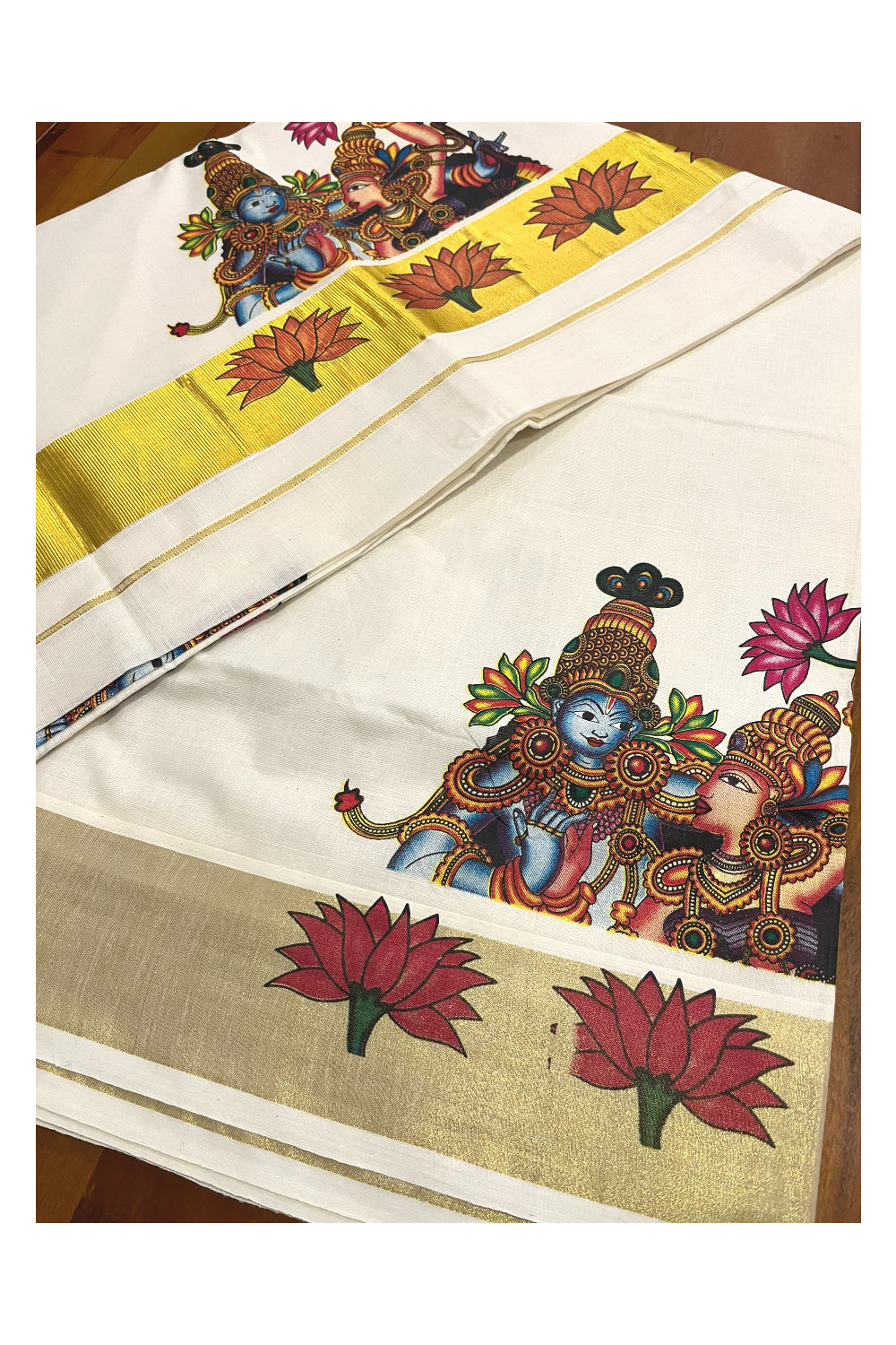 Pure Cotton Kerala Kasavu Saree with Krishna Radha Mural Printed Design