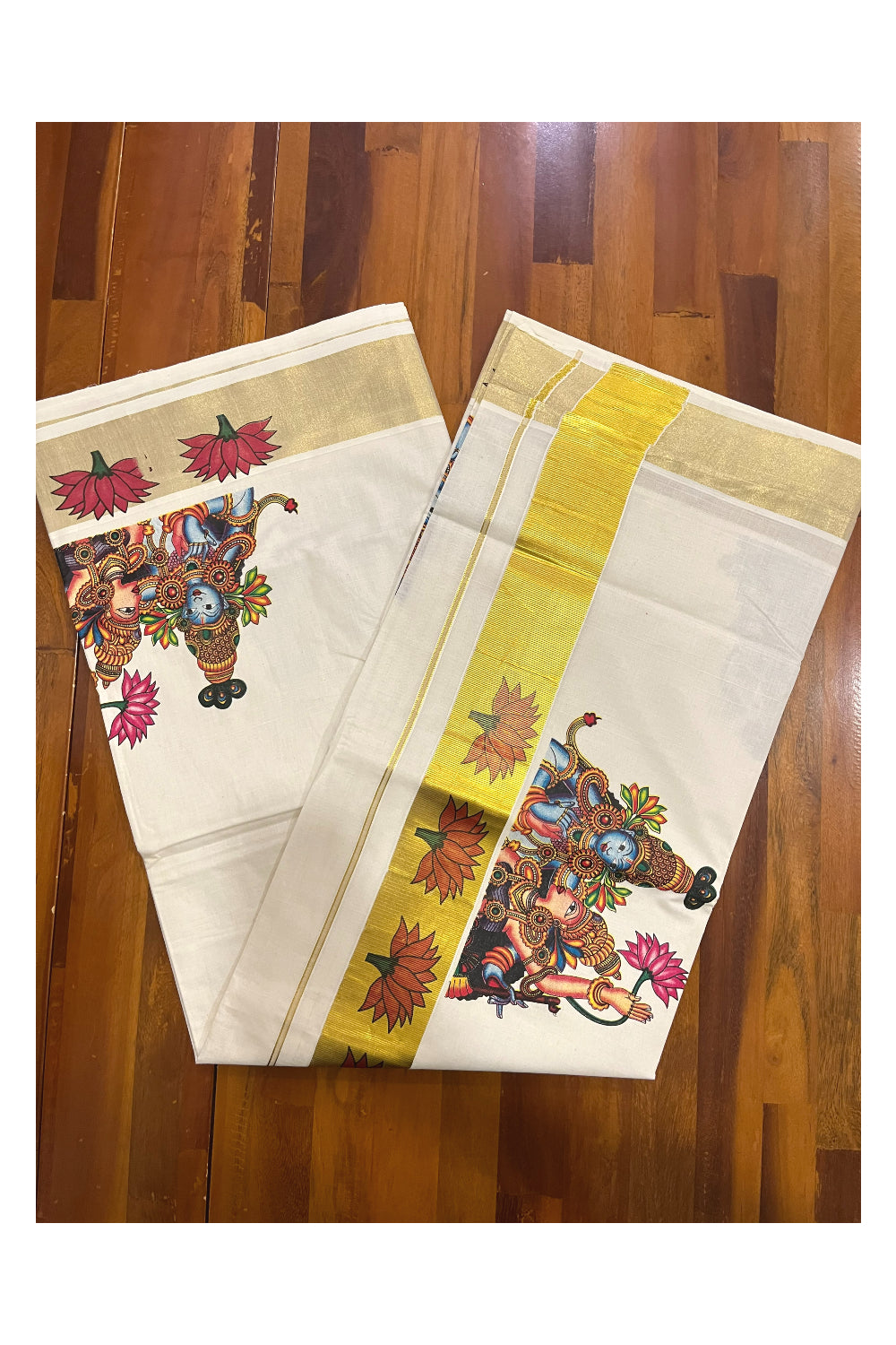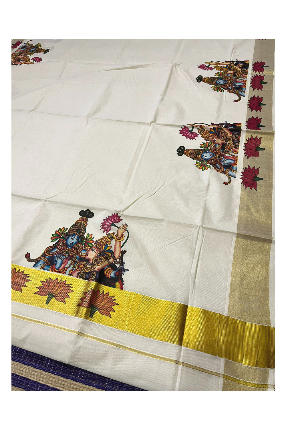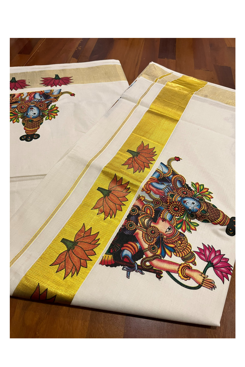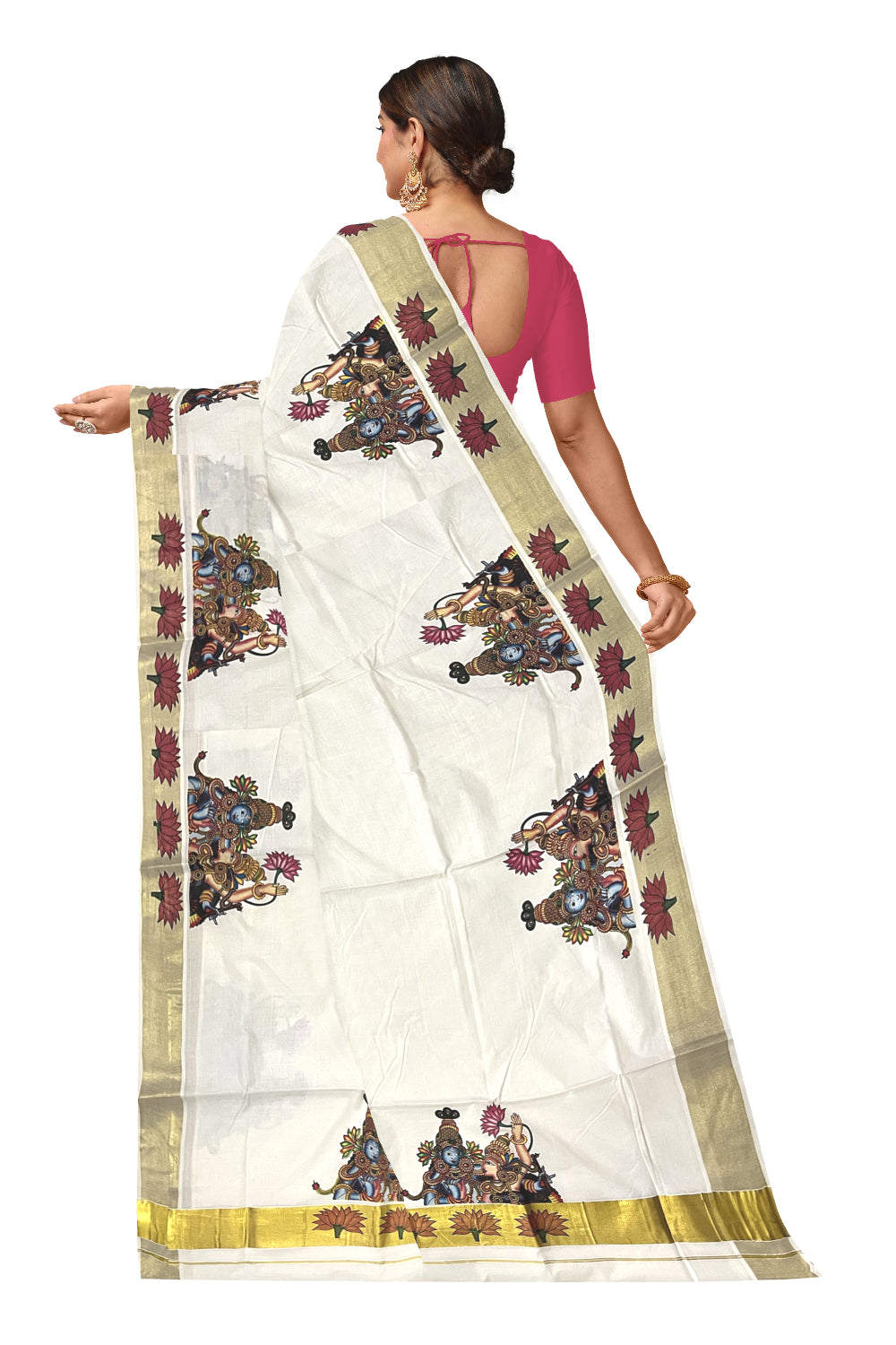 Pure Cotton Kerala Kasavu Saree with Krishna Radha Mural Printed Design