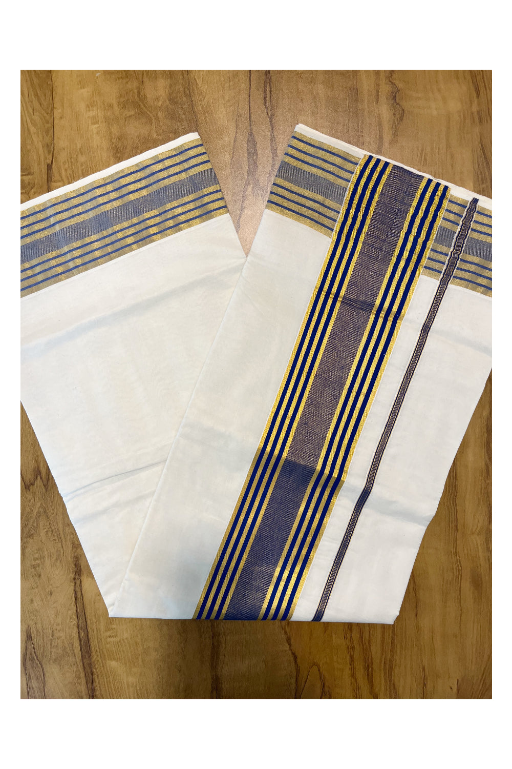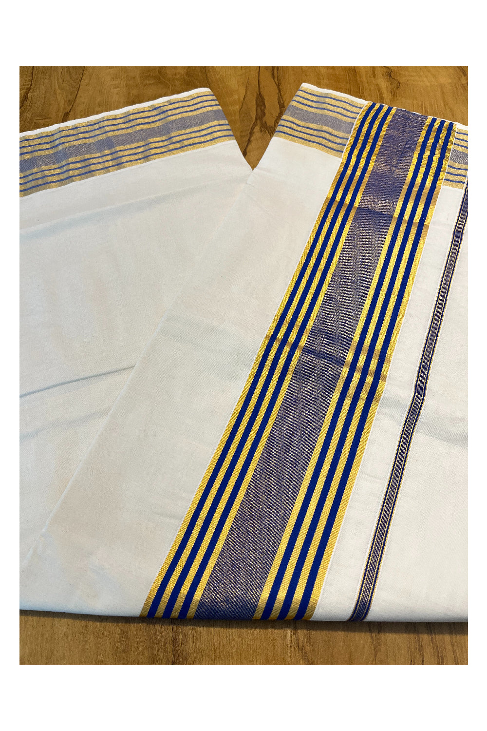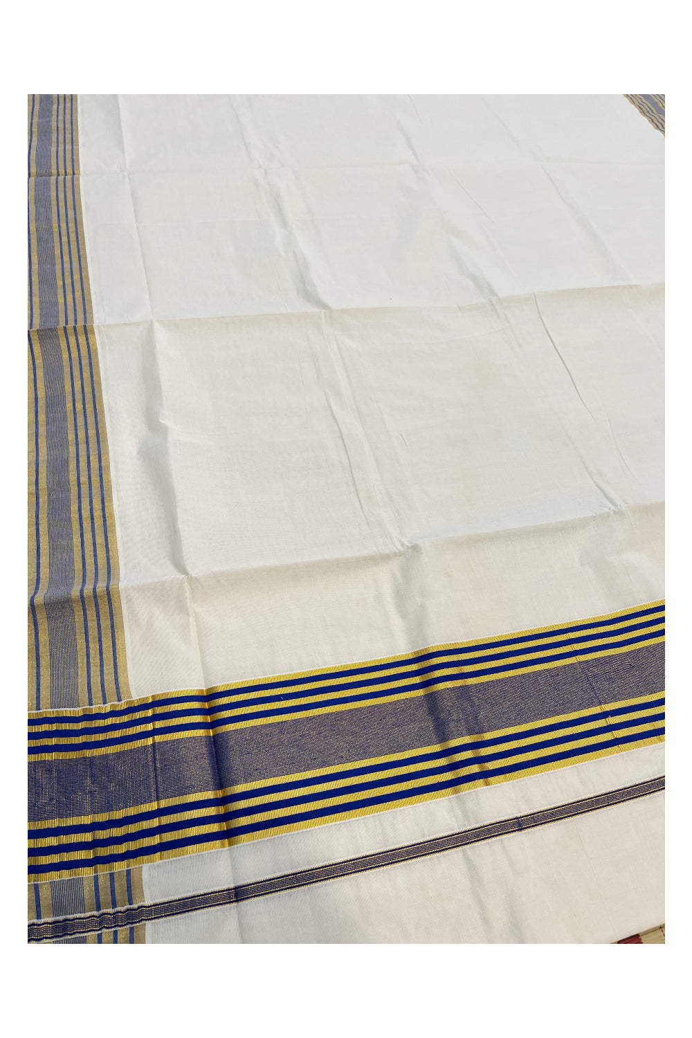 Pure Cotton Kerala Saree with Dark Blue and Kasavu Lines Border and Pallu
