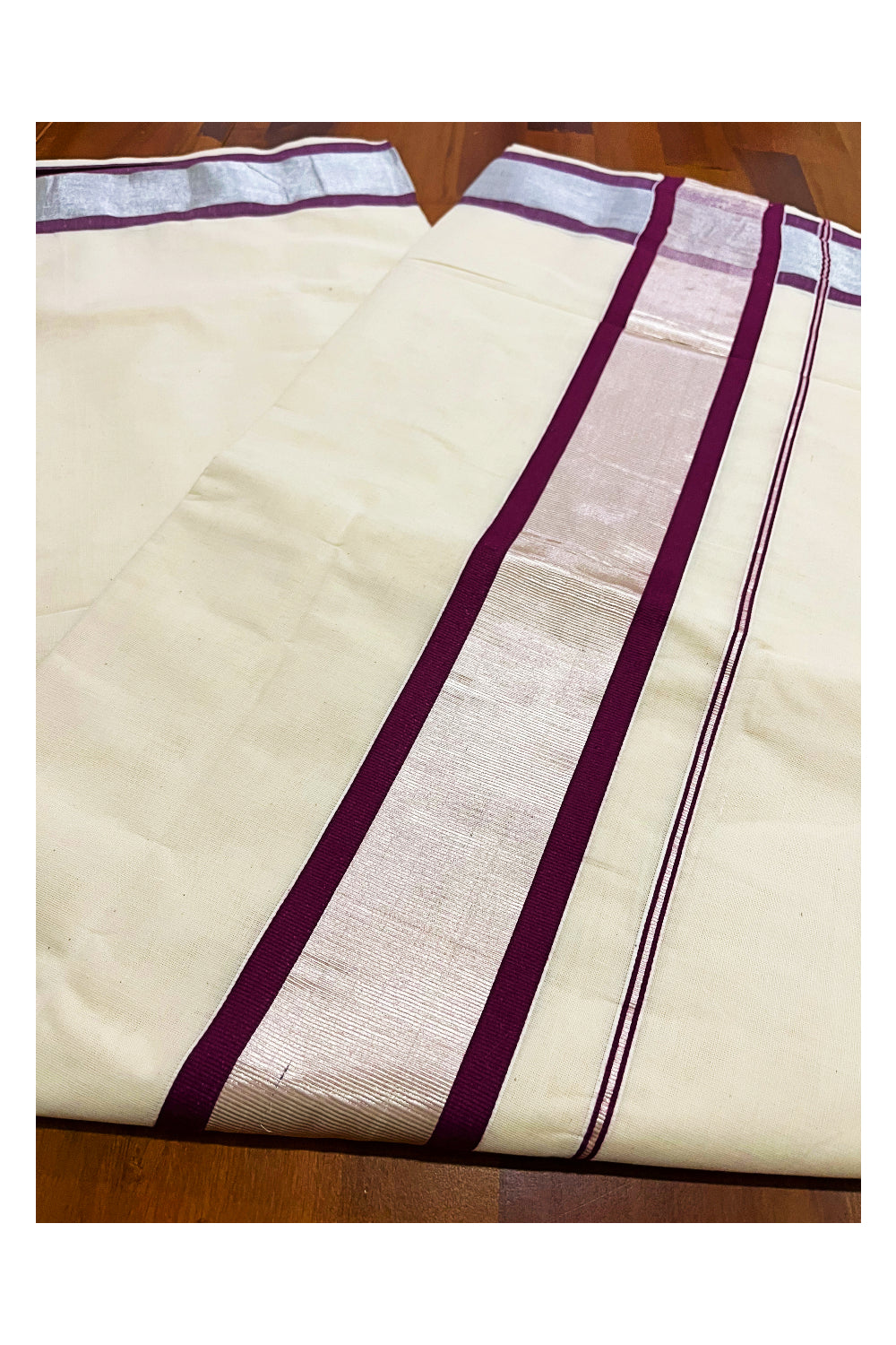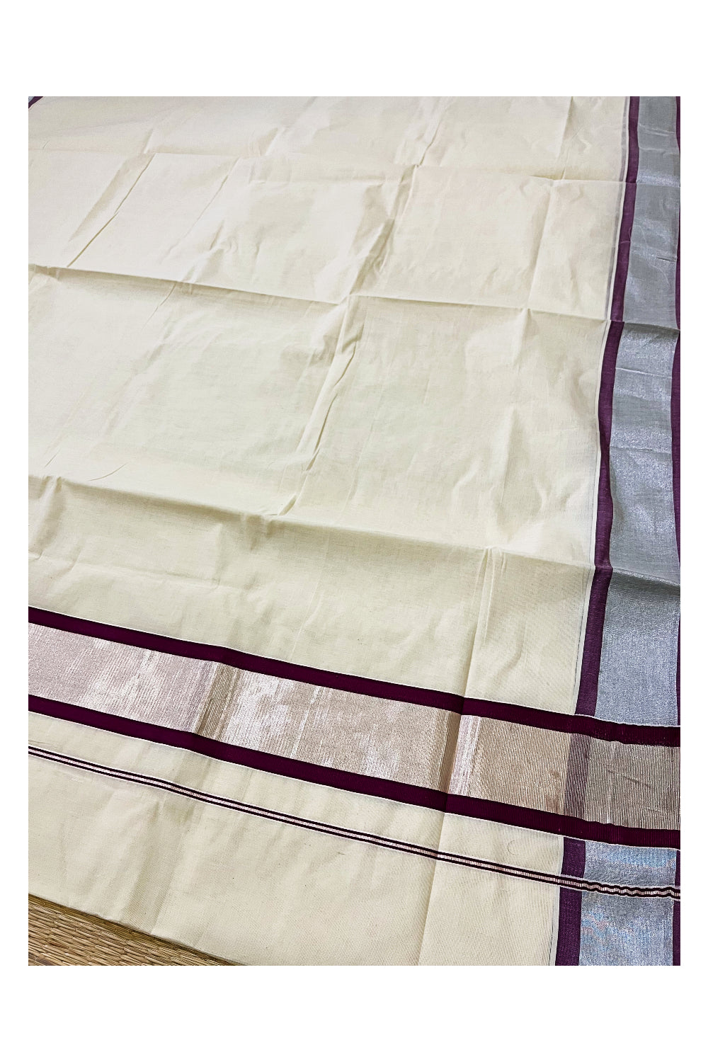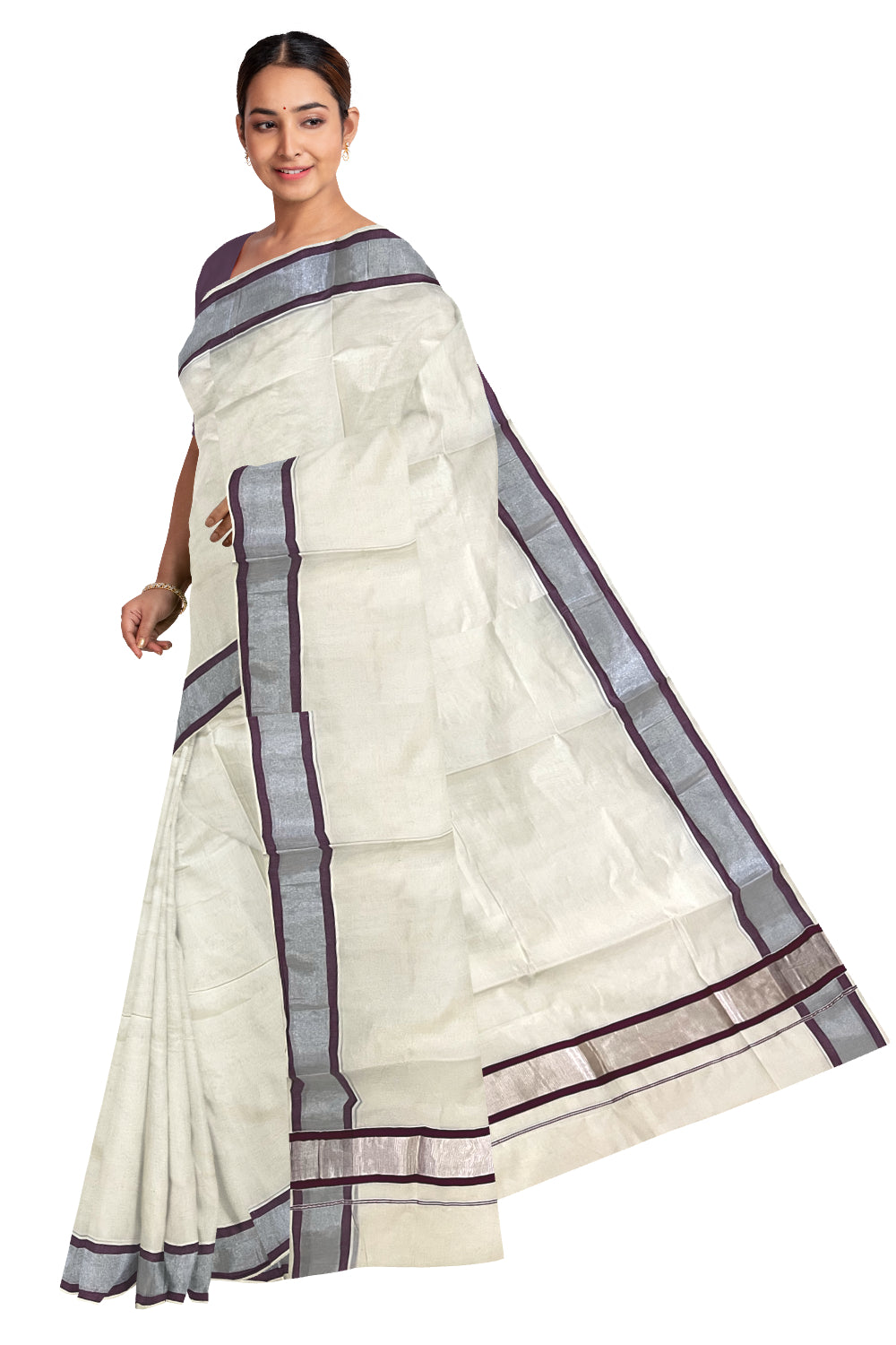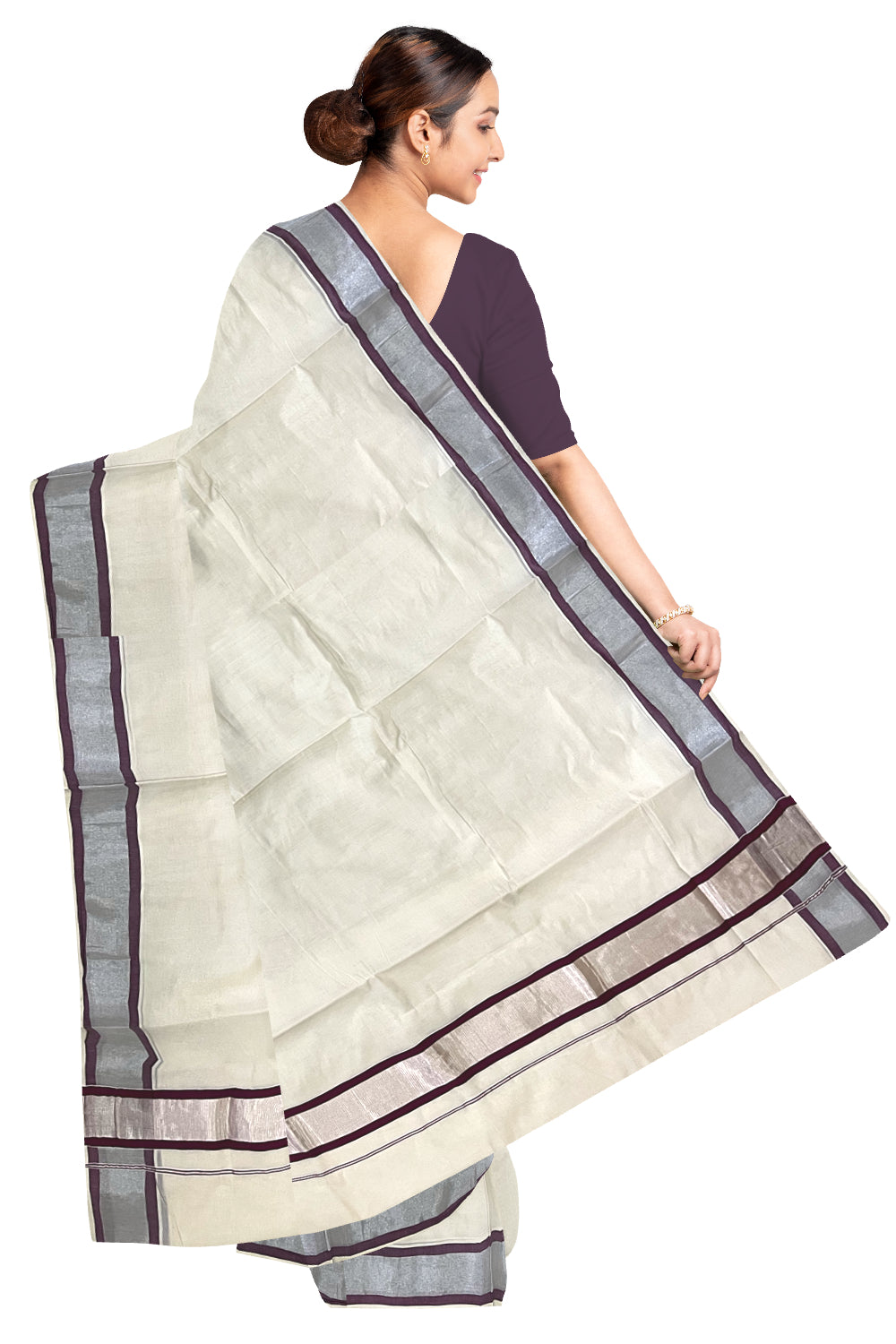 Pure Cotton Kerala Saree with Silver Kasavu and Purple Border