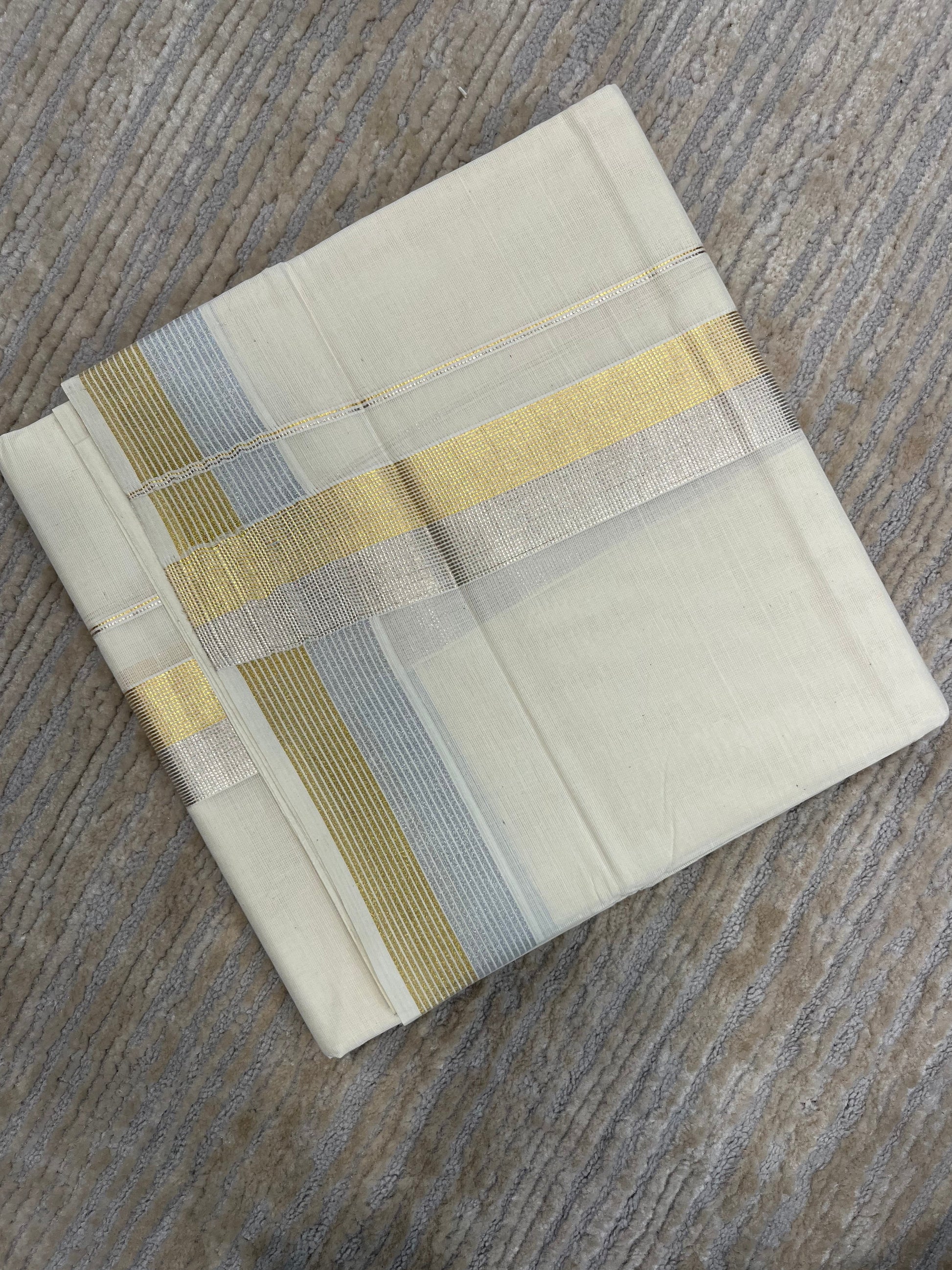 Pure Cotton Off White Double Mundu with Silver and Gold Kasavu Lines Kara (South Indian Kerala Dhoti)