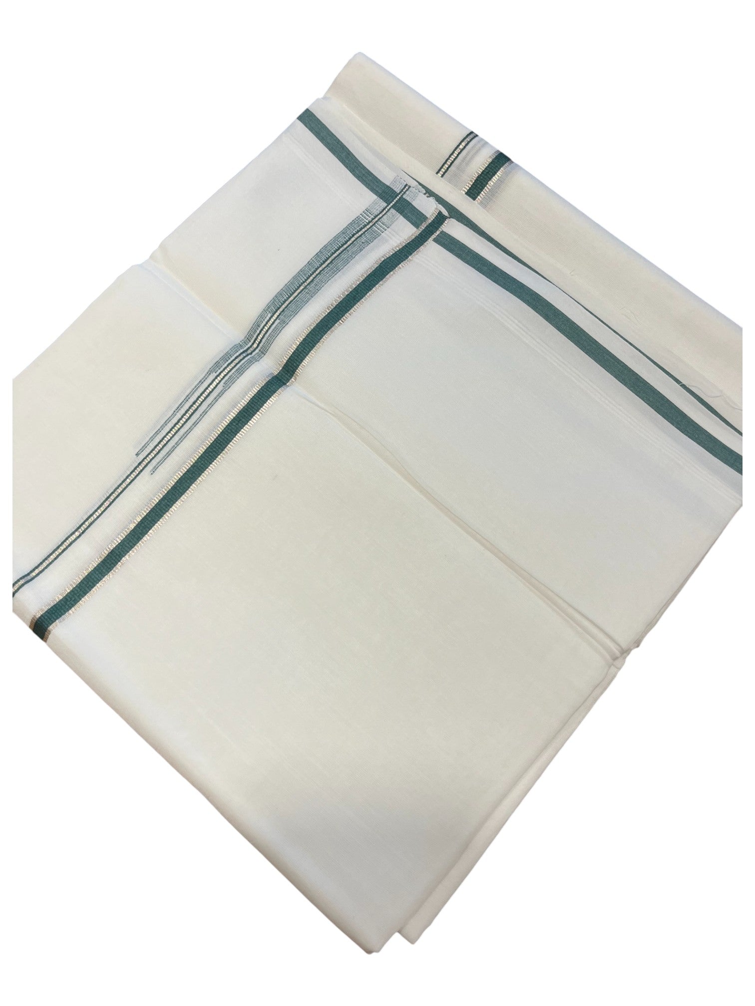 Pure White Cotton Double Mundu with Silver Green Chutti Kara (South Indian Dhoti)