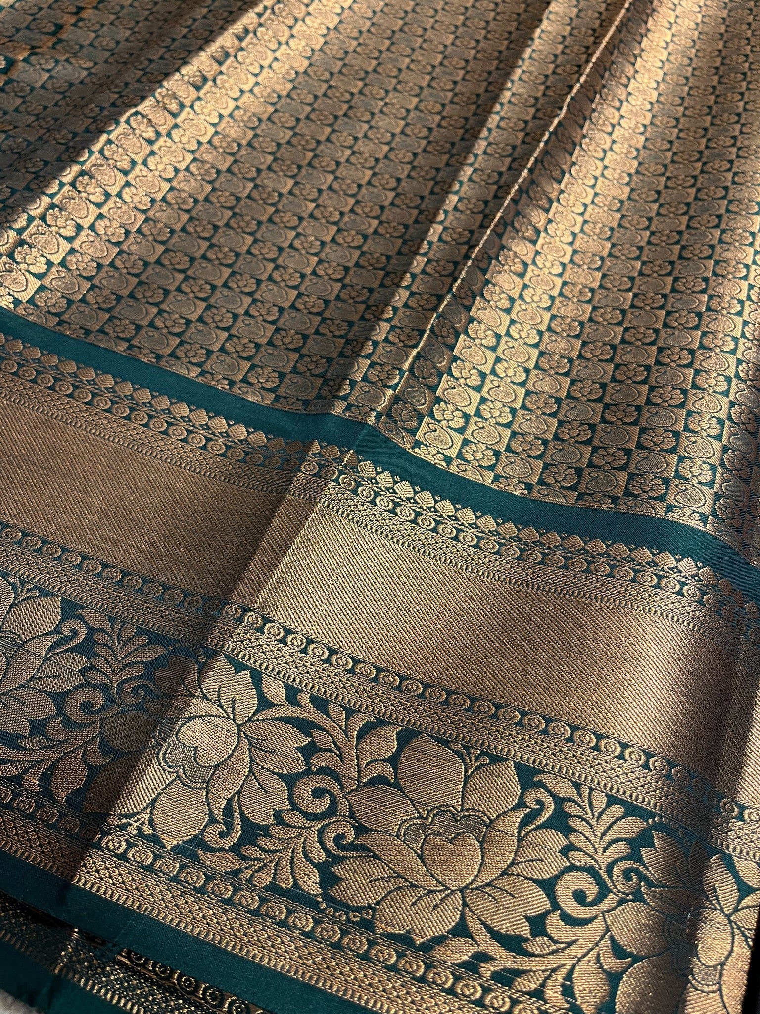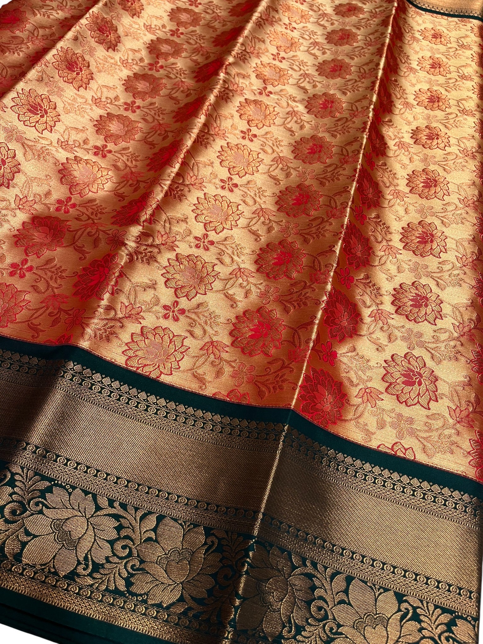 Southloom Banarasi Semi Silk Saree with Floral Zari Work Across Body (Peach & Green)