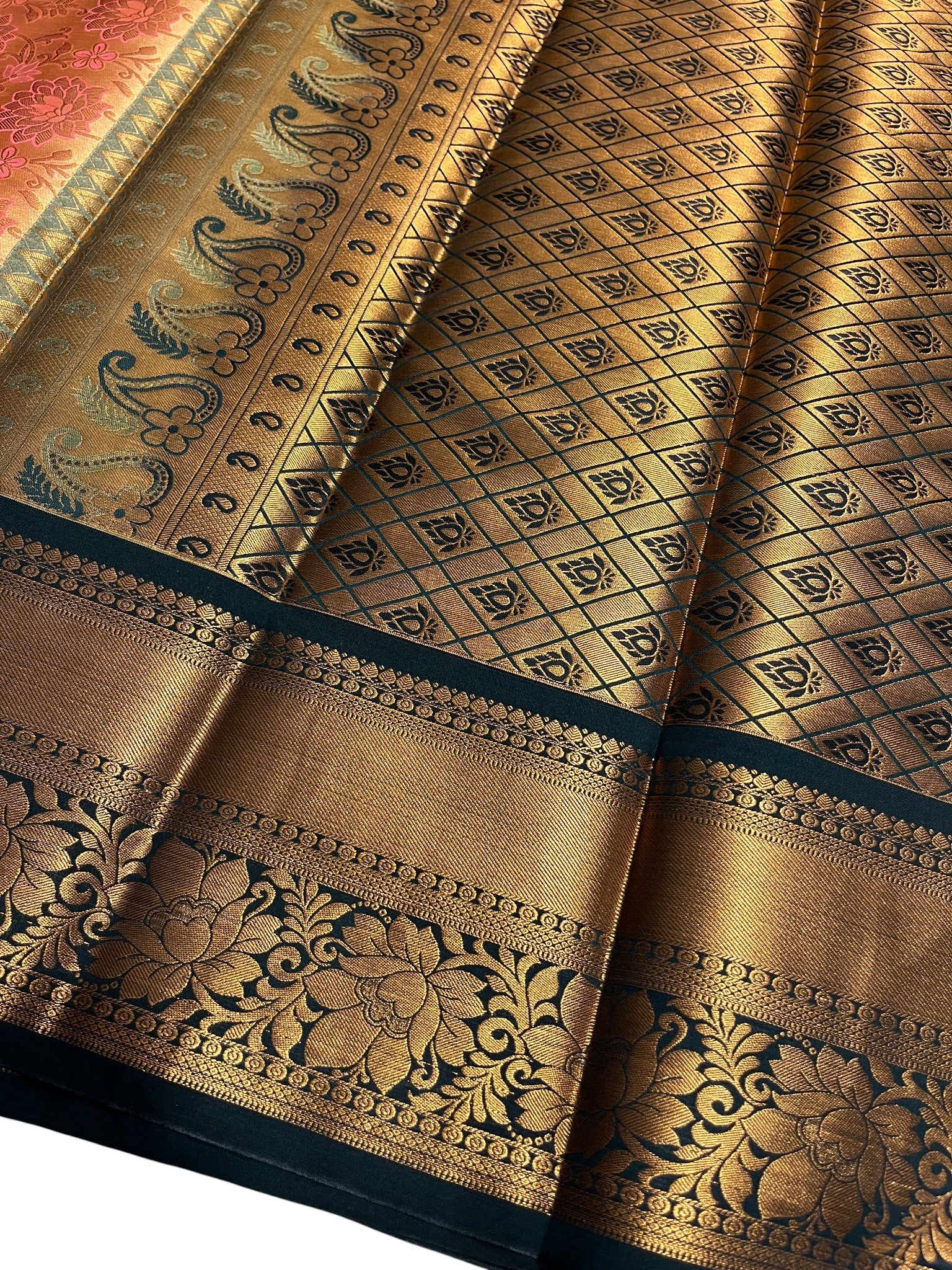 Southloom Banarasi Semi Silk Saree with Floral Zari Work Across Body (Peach & Green)