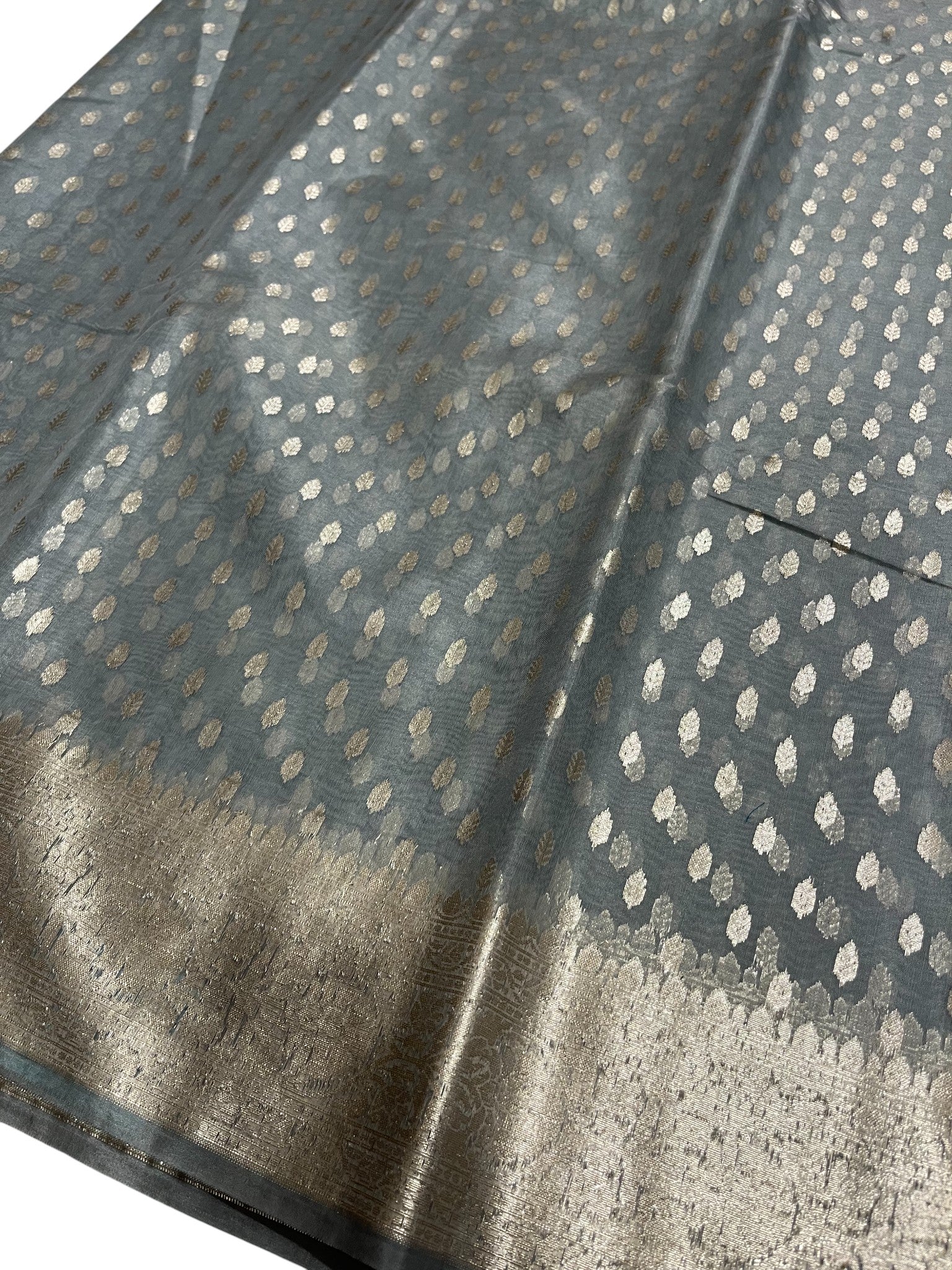 Southloom Cotton Banarasi Silk Saree with Woven Work on Body and Borders (Grey)