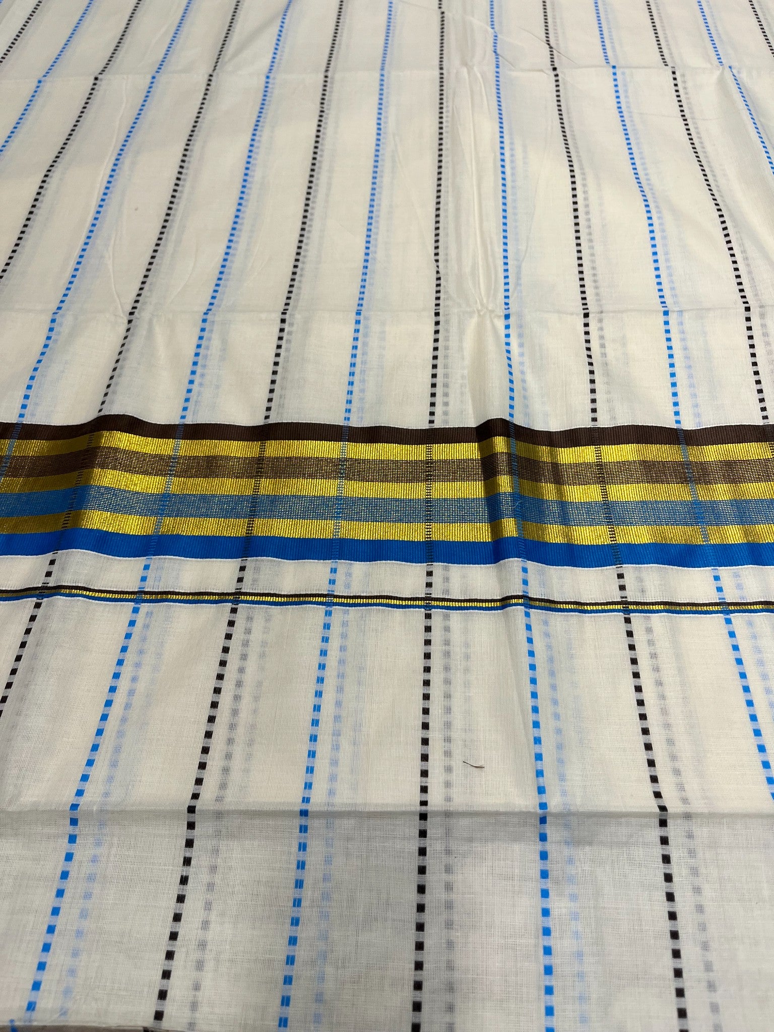 Southloom Cotton Kasavu Saree with Blue and Brown Thread Work Across Body