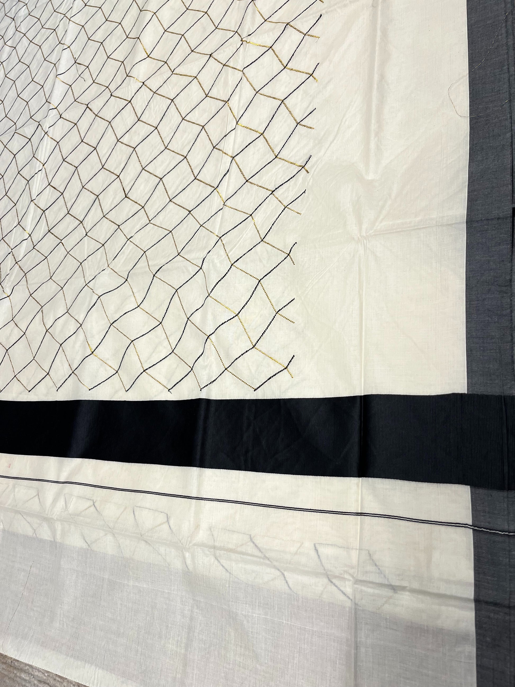 Off-white Kerala Saree with Floral Embroidery Designs on Body. Simple saree for everyday wear, may it be to the office or to the temple.