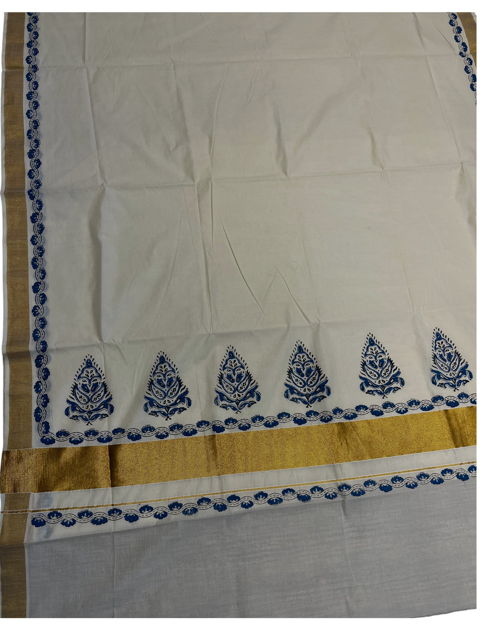Southloom Cotton Kerala Kasavu Saree with Blue and Black Block Prints On Border