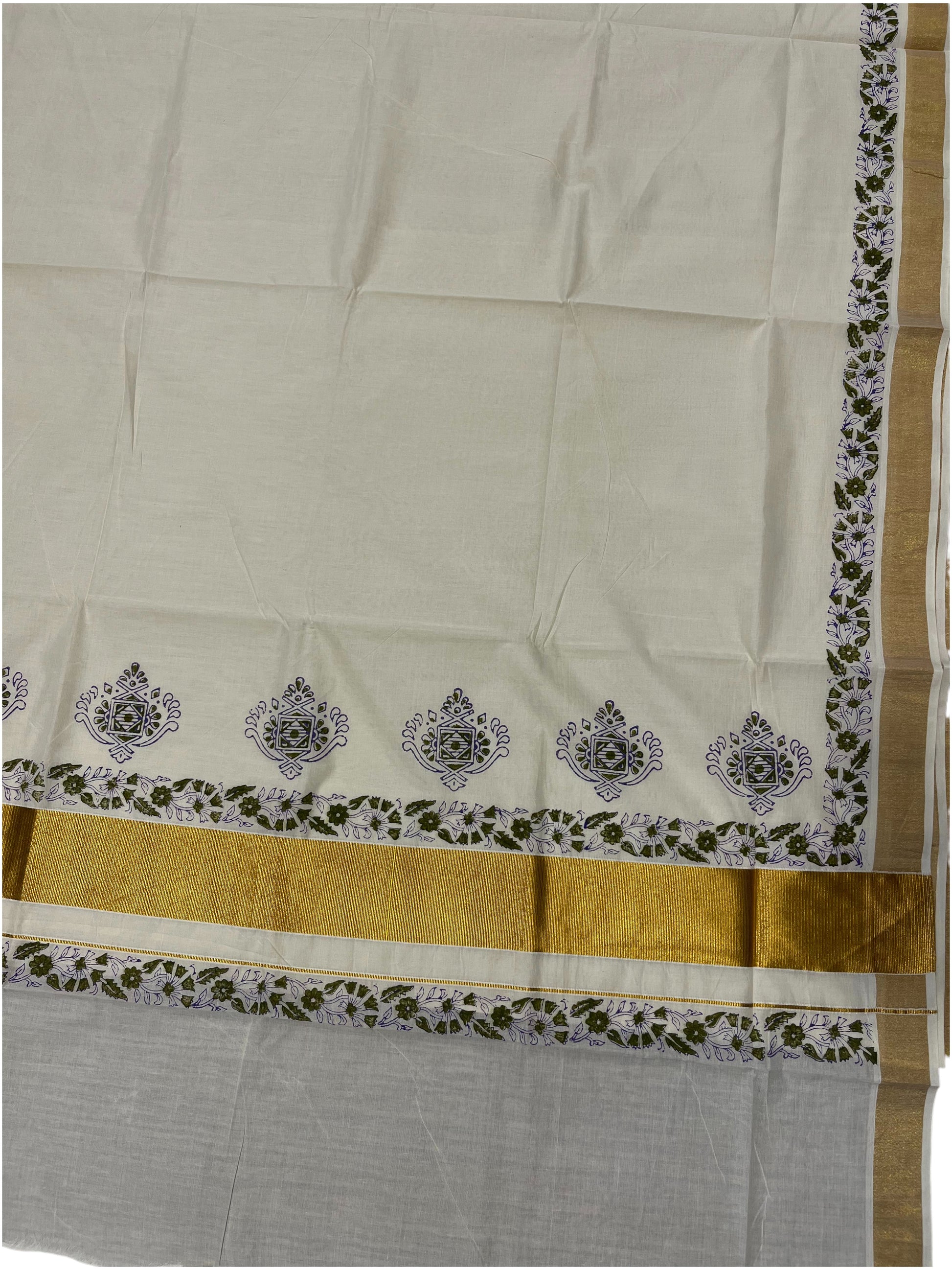 Southloom Cotton Kerala Kasavu Saree with Green Block Prints On Border