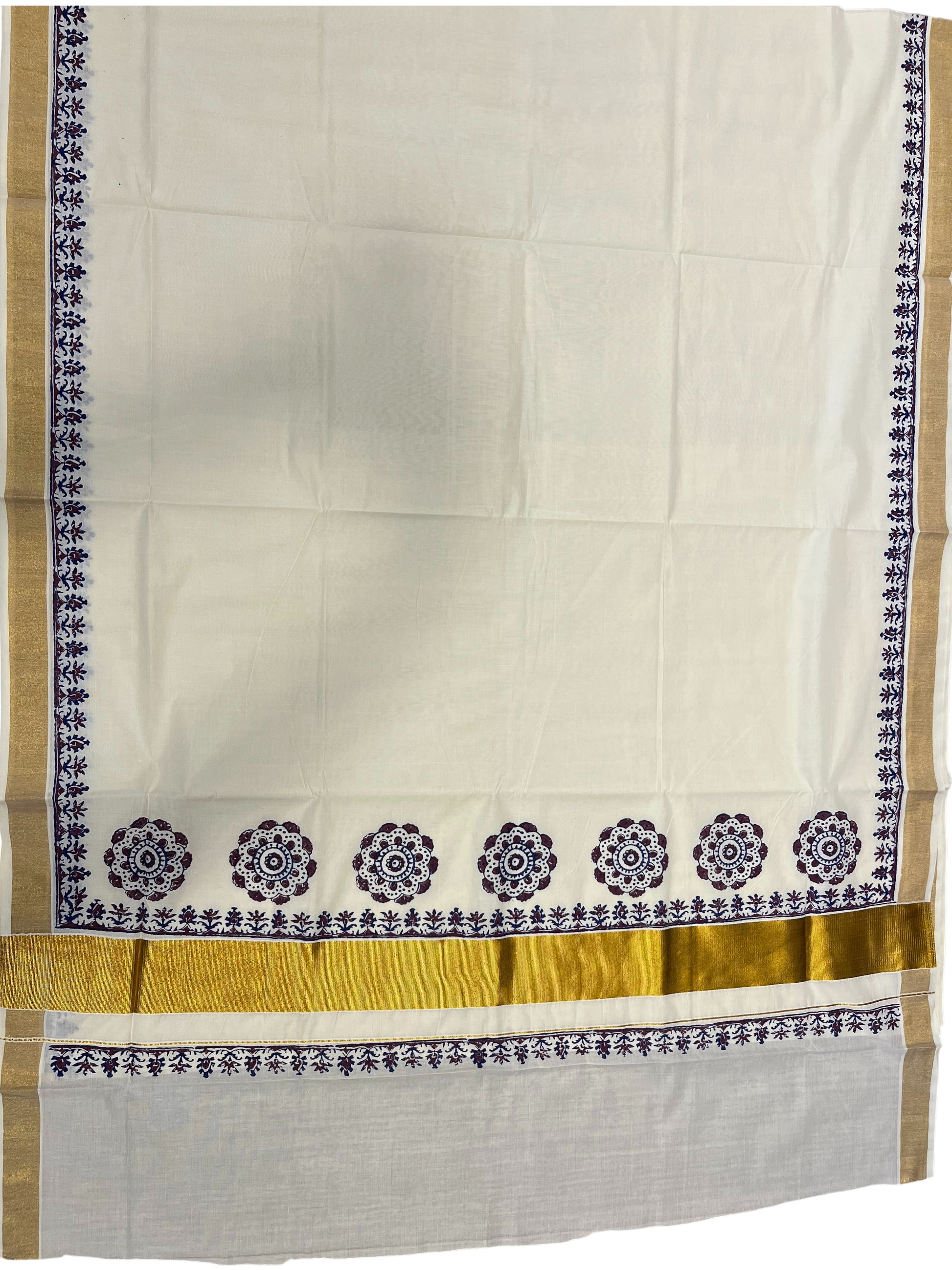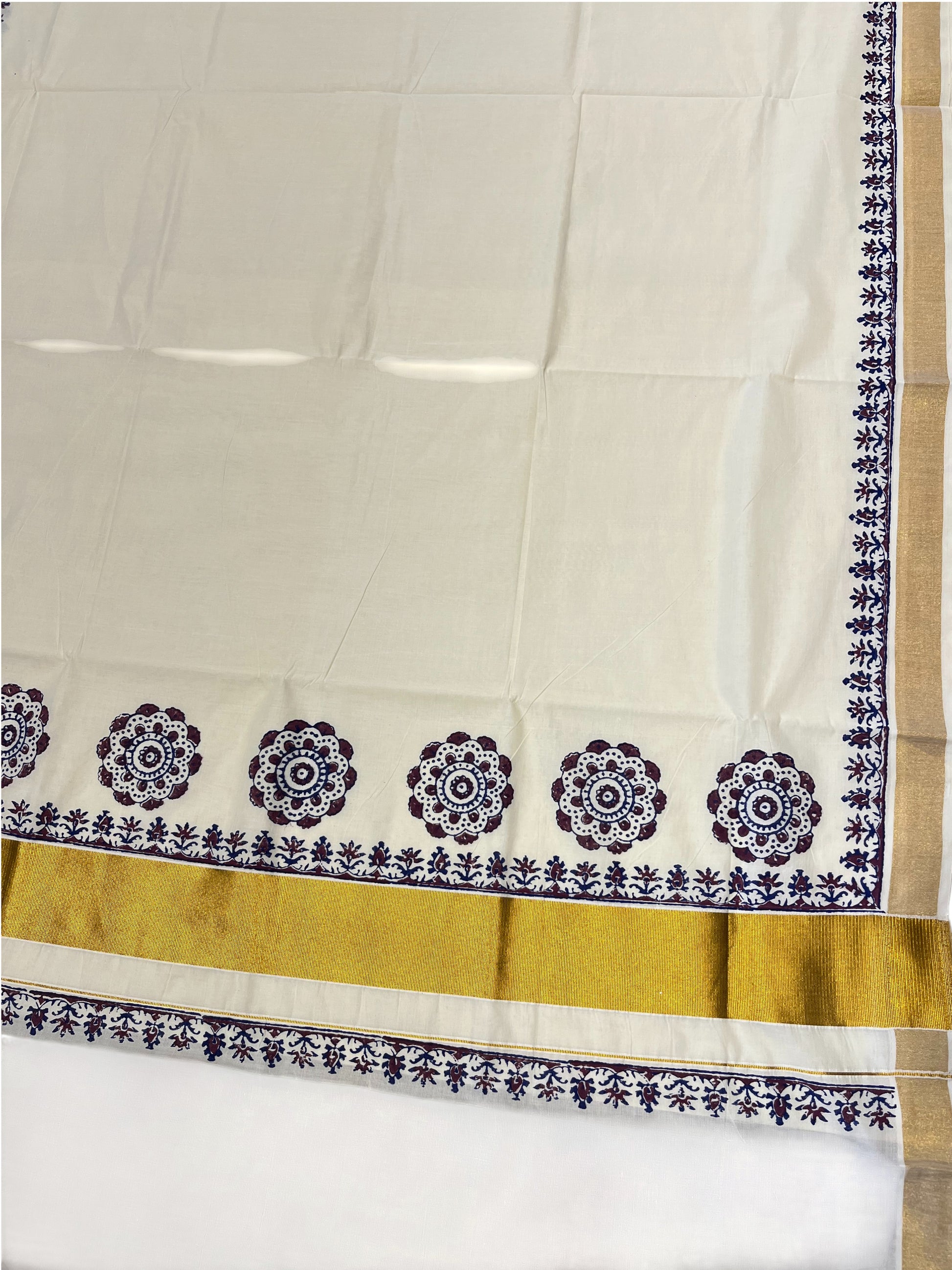 Off-white Kerala Saree with Block Print Designs on Border. Simple saree for everyday wear, may it be to the office or to the temple.